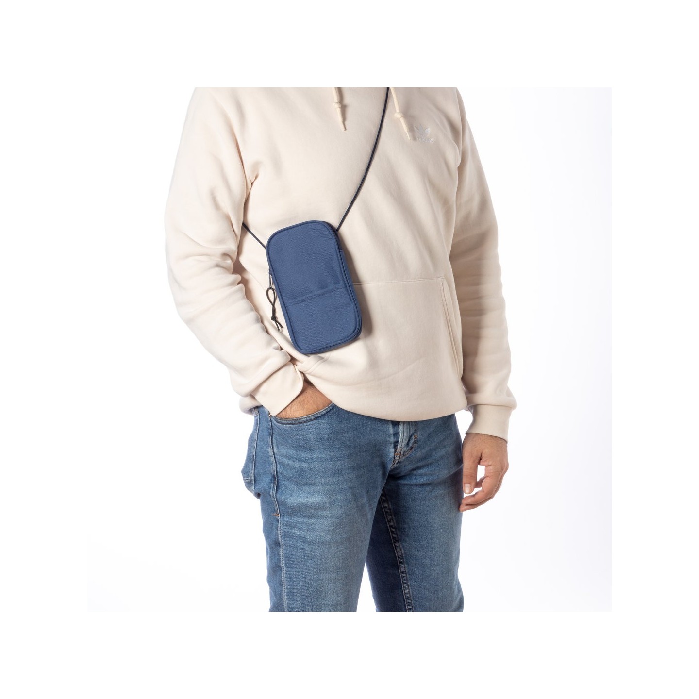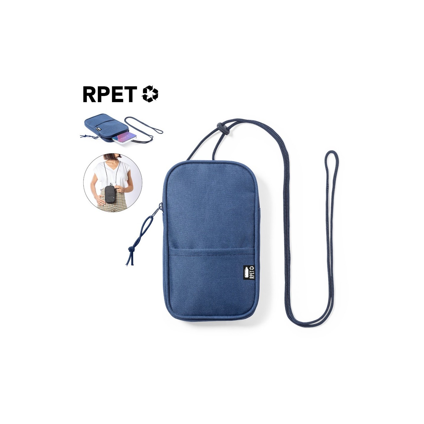 El Portamóvil Landry es elegante y sostenible, fabricado en poliéster RPET. Compartimento con cremallera, cinta bandolera y bolsillo exterior.