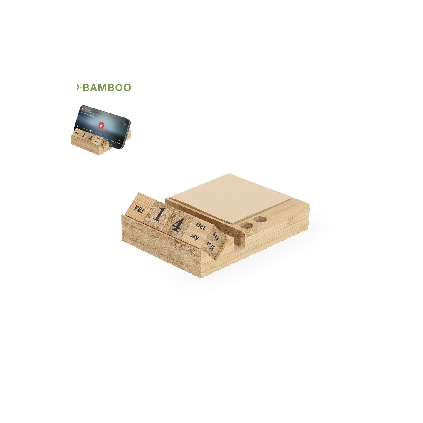 El Portanotas Calendario Perpetuo Dex en bambú combina funcionalidad y elegancia. Incluye soporte para smartphone, 100 notas adhesivas y es personalizable, ideal para tu escritorio