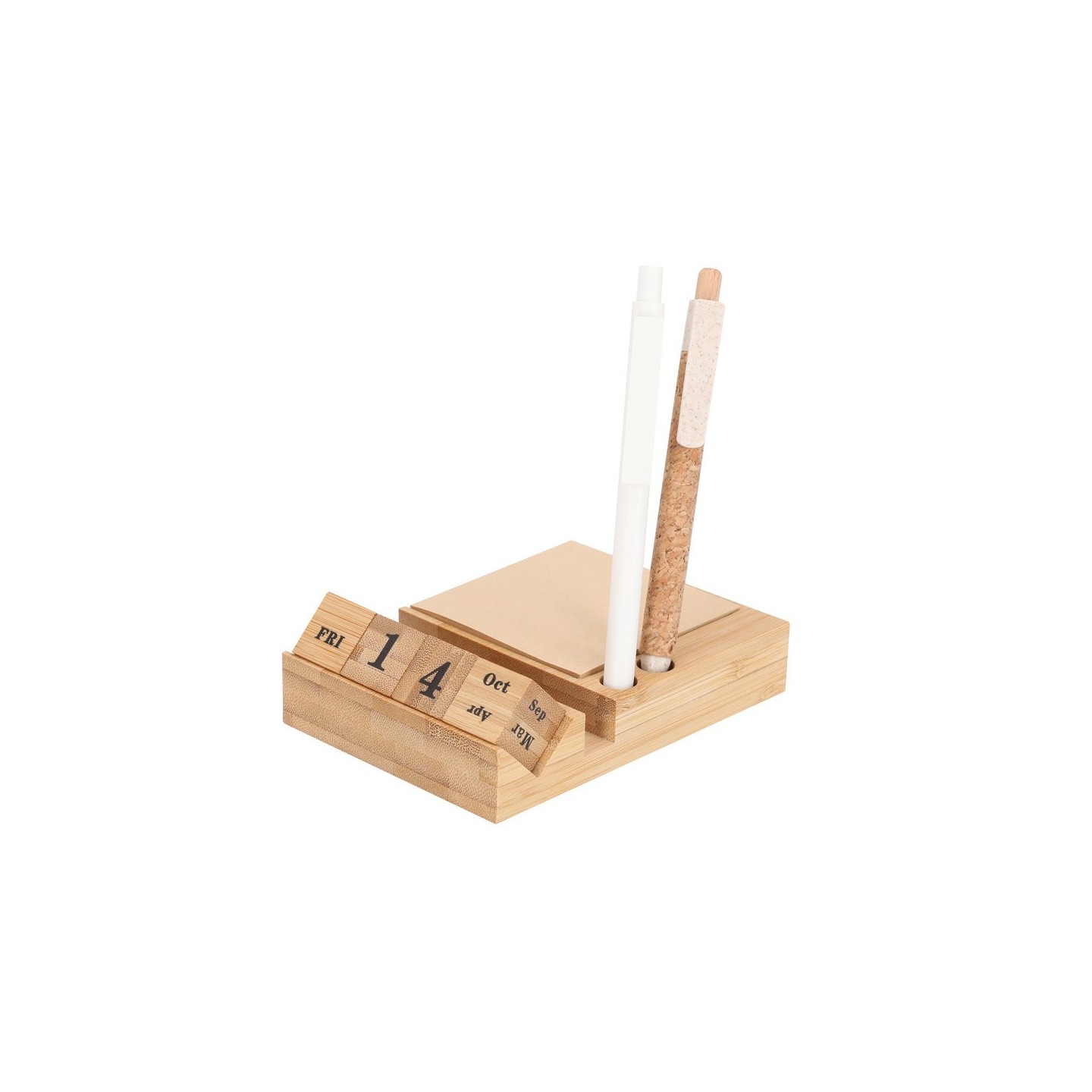 Presentamos el Portanotas Calendario Perpetuo Dex, una pieza excepcional que combina funcionalidad y elegancia en tu espacio de trabajo. Fabricado en bambú, este portanotas no solo es un organizador, sino también un atractivo decorativo que añade un toque natural y sofisticado a tu escritorio. Su diseño inteligente incluye cubos que te permiten marcar los días de la semana, los meses y los días del mes, asegurando que siempre estés al tanto del tiempo sin perder la estética.