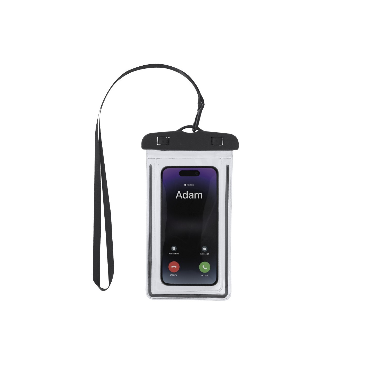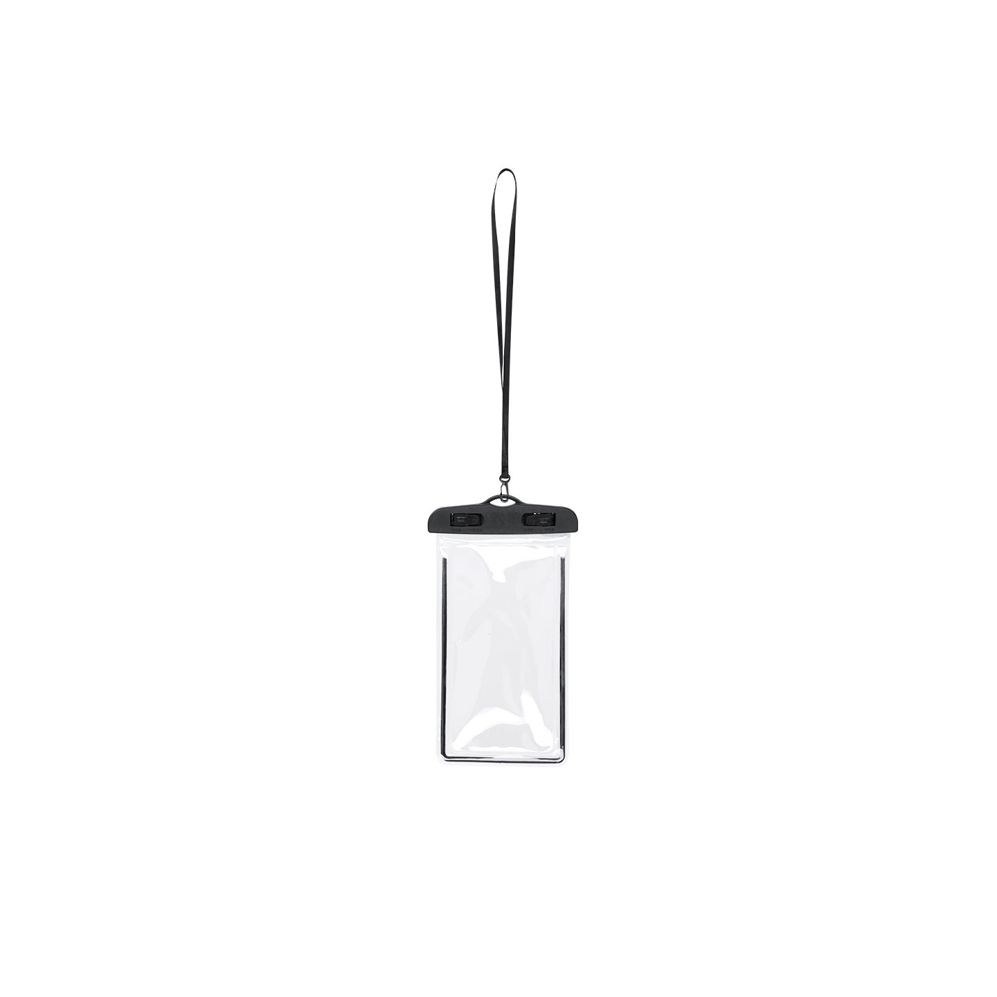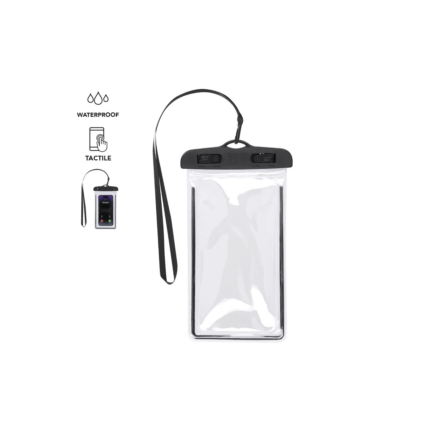 Portatodo impermeable LOGAN, fabricado en PVC, con función táctil y cierre de palancas. Compatible con pantallas de hasta 6,7". Personalizable con logotipo.