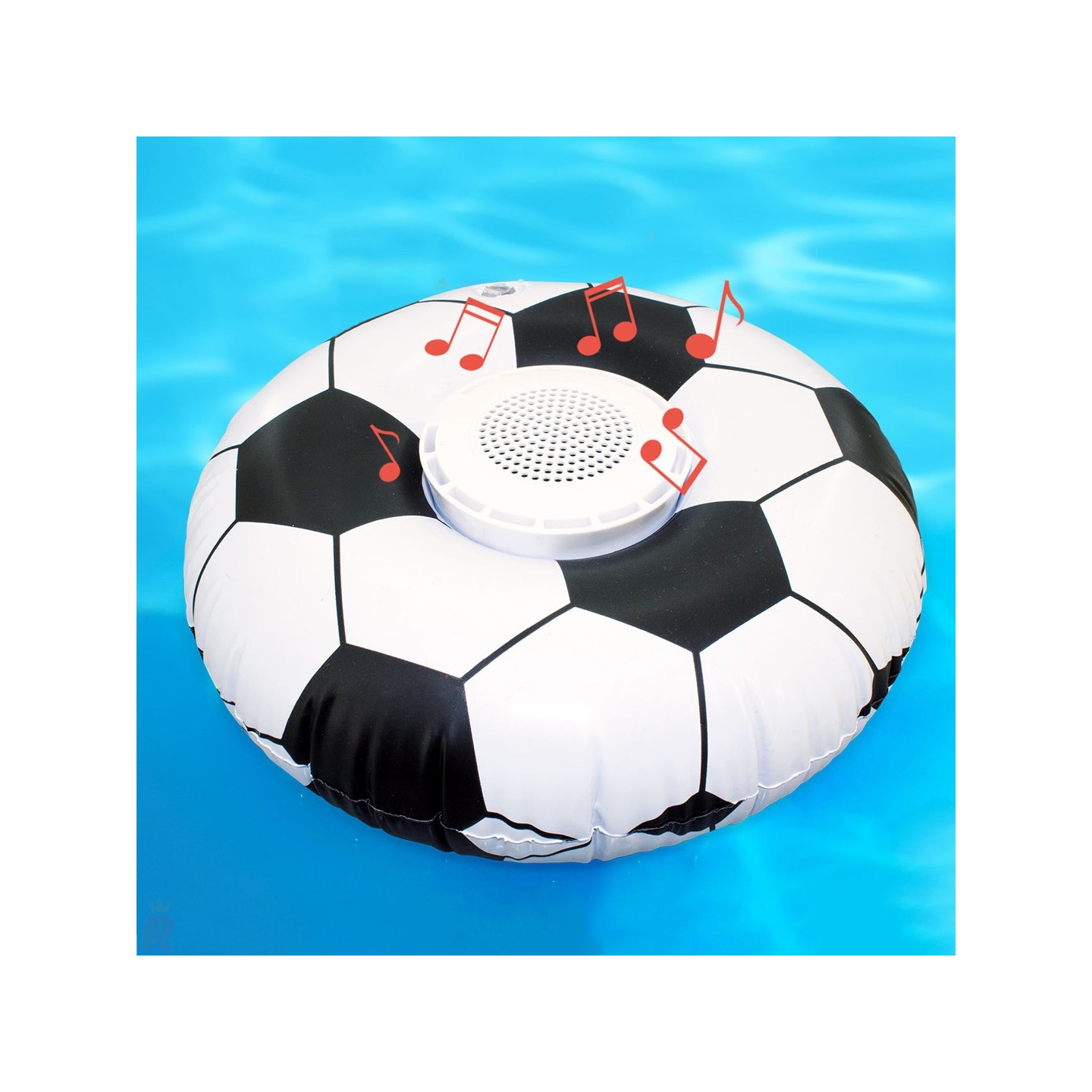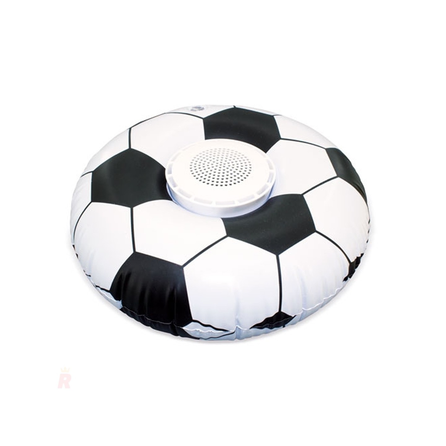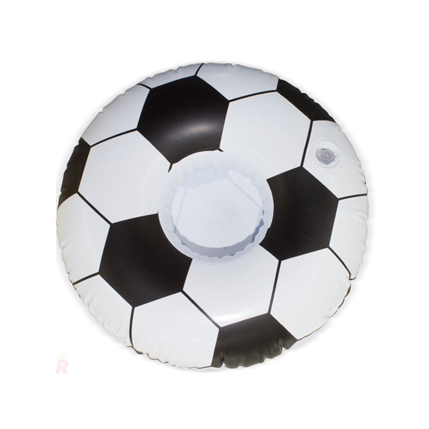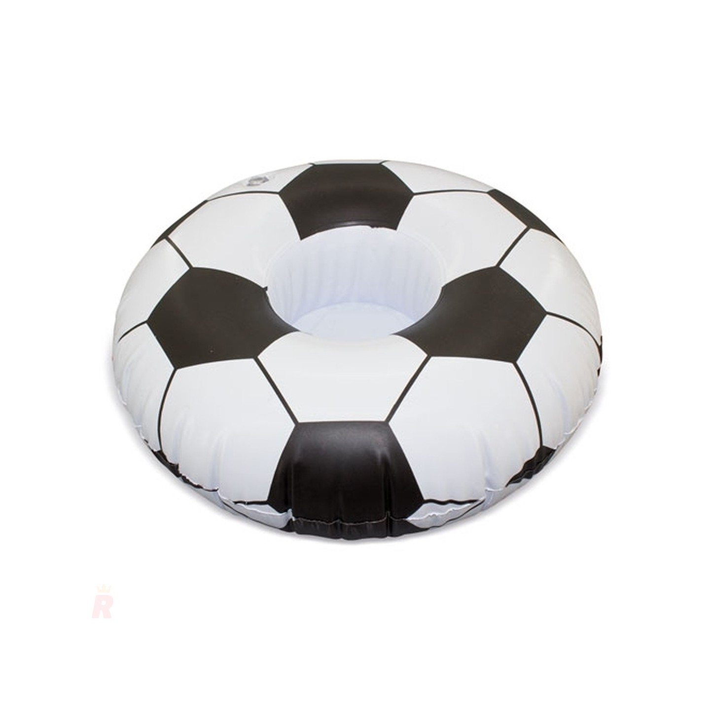 Posavasos inflable con forma de balón de fútbol, ideal para mantener bebidas a mano y apoyar altavoces en la piscina. Perfecto para eventos acuáticos y veraniegos.