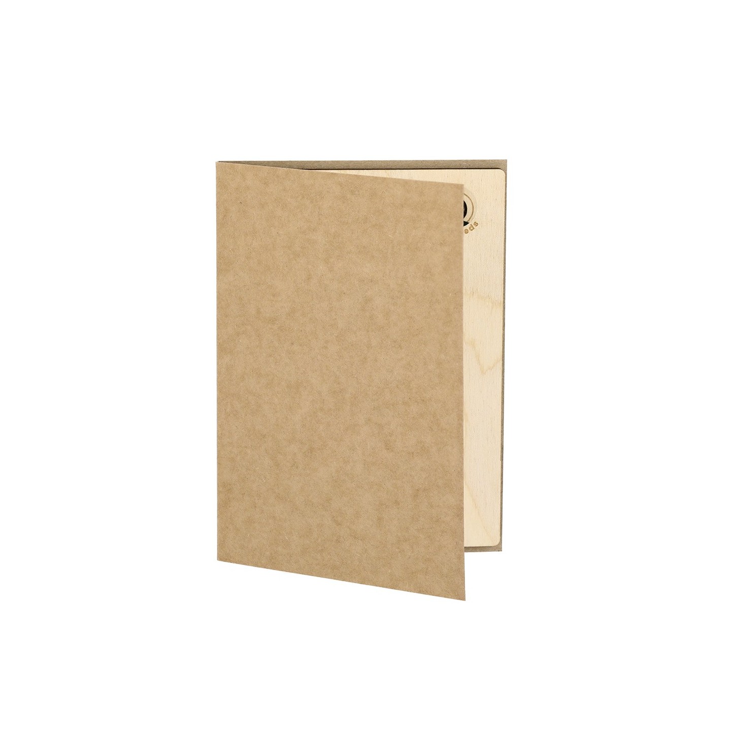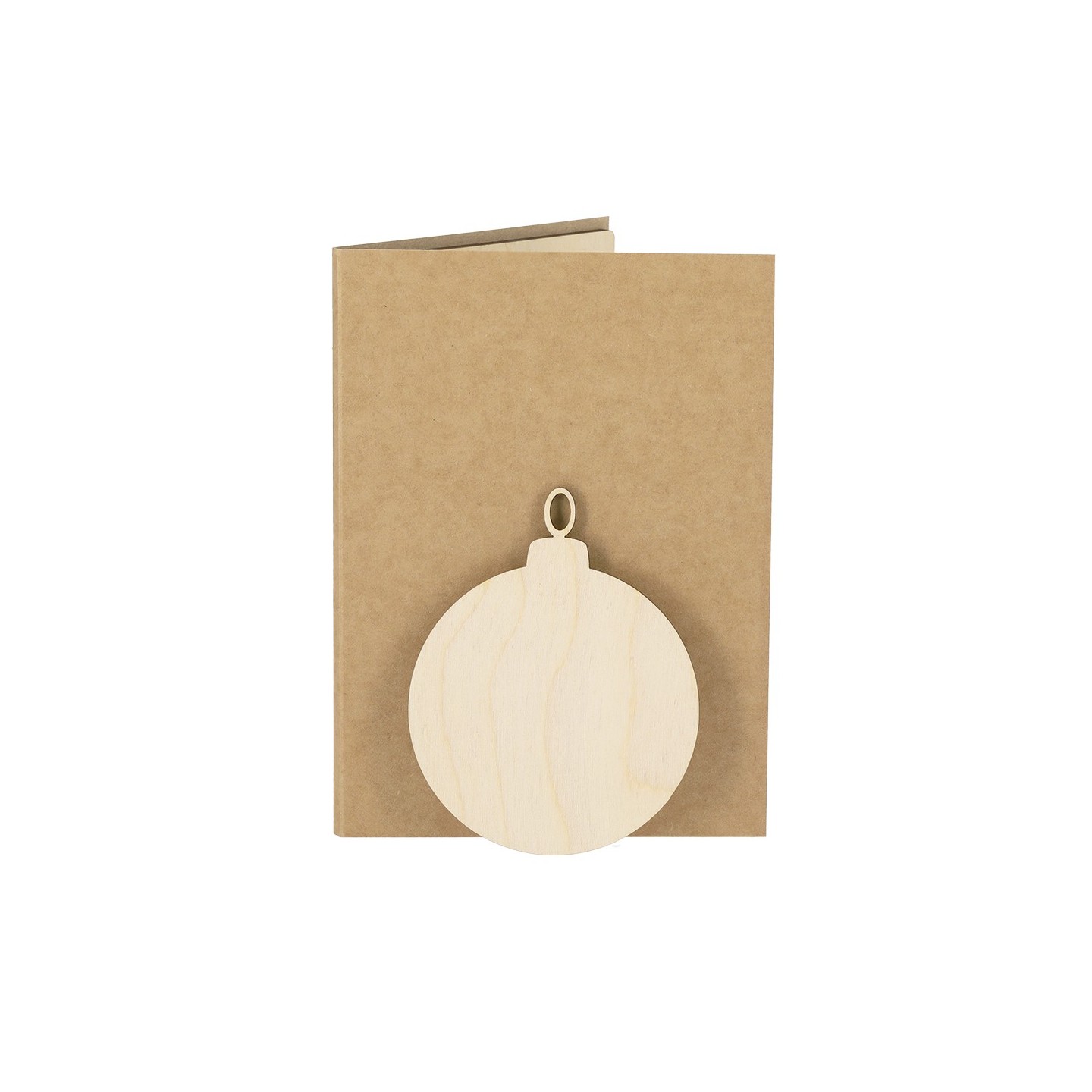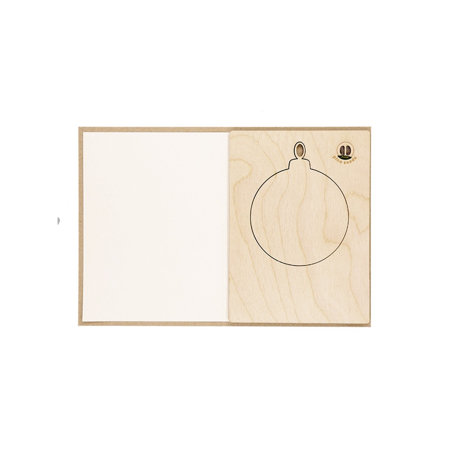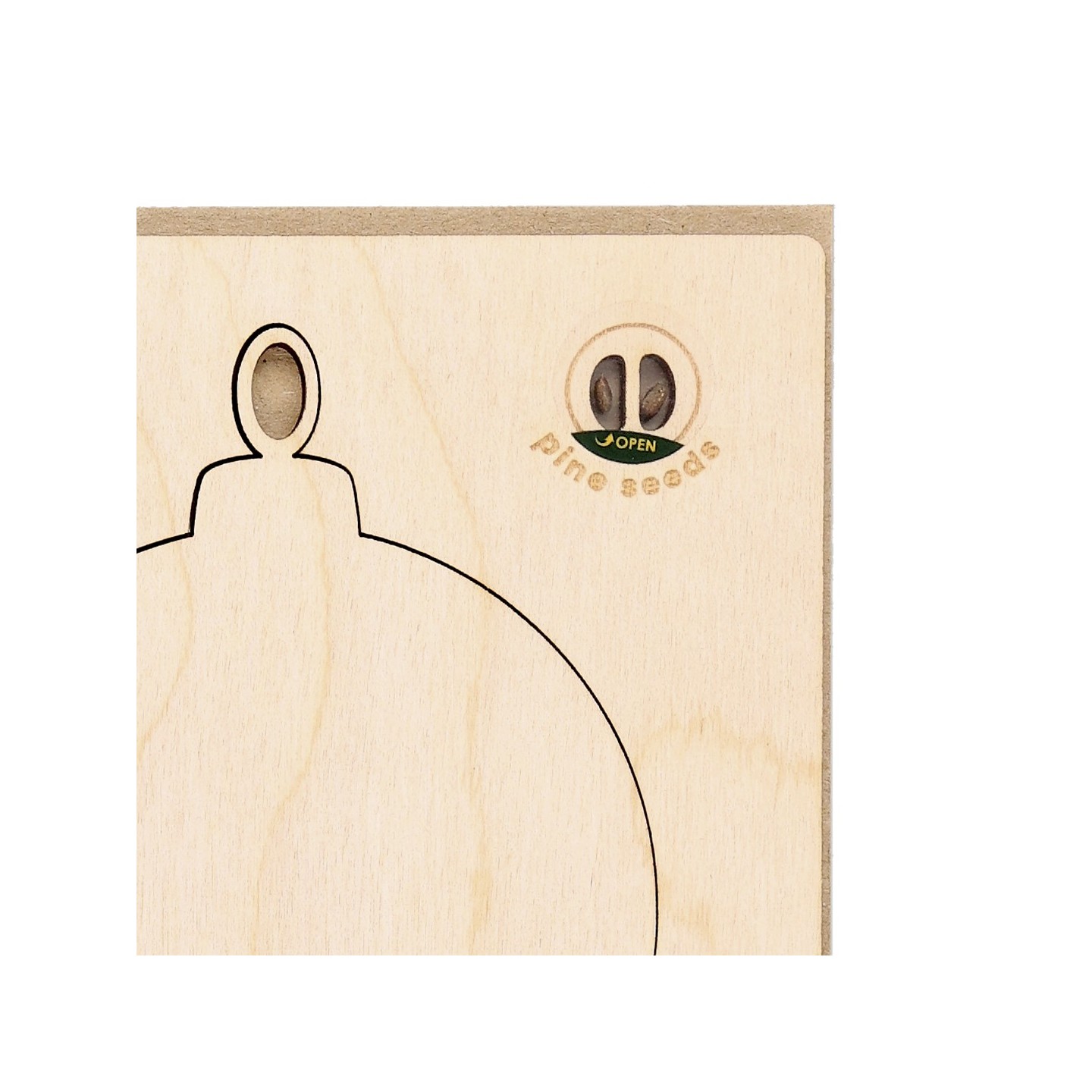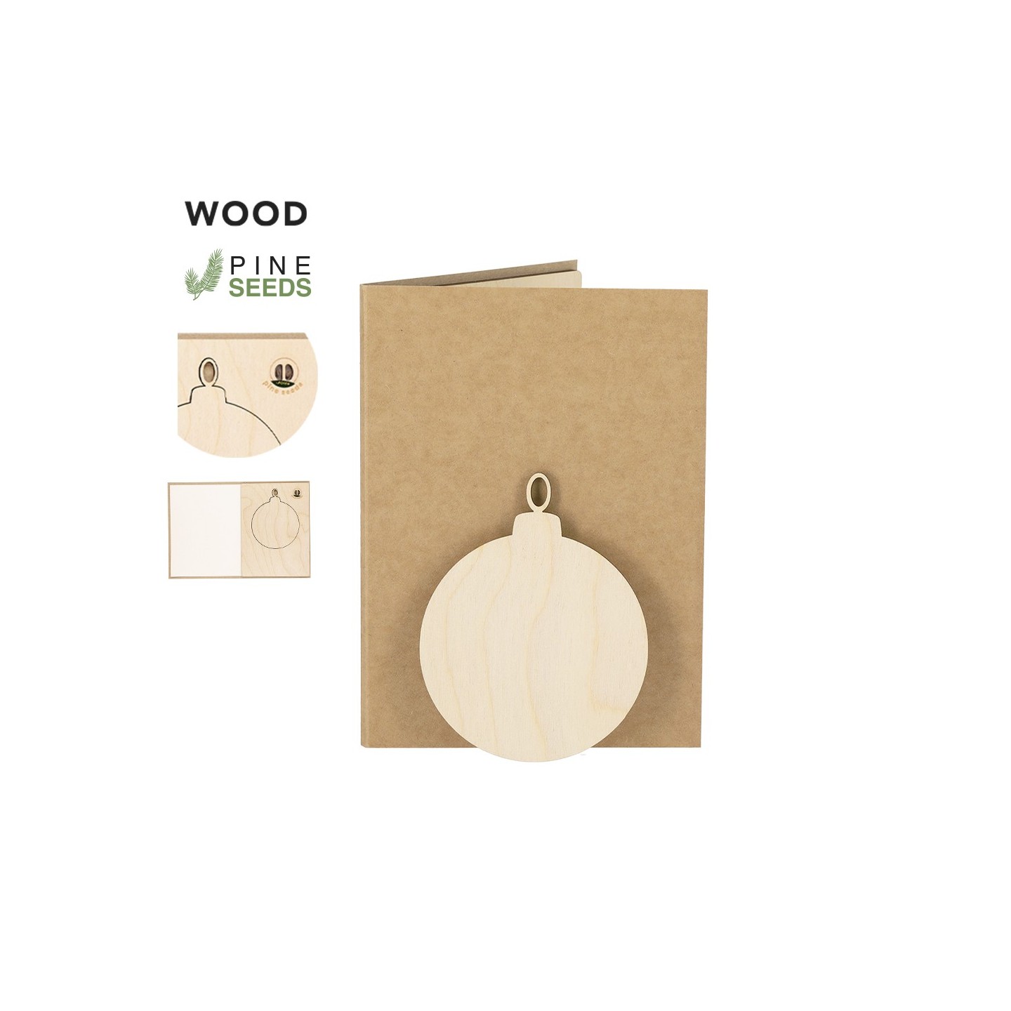Postal navideña con adorno de bola de madera y cápsula de semillas de pino. Fabricada en papel Kraft, personalizable con logotipo. Sostenible y sorprendente.