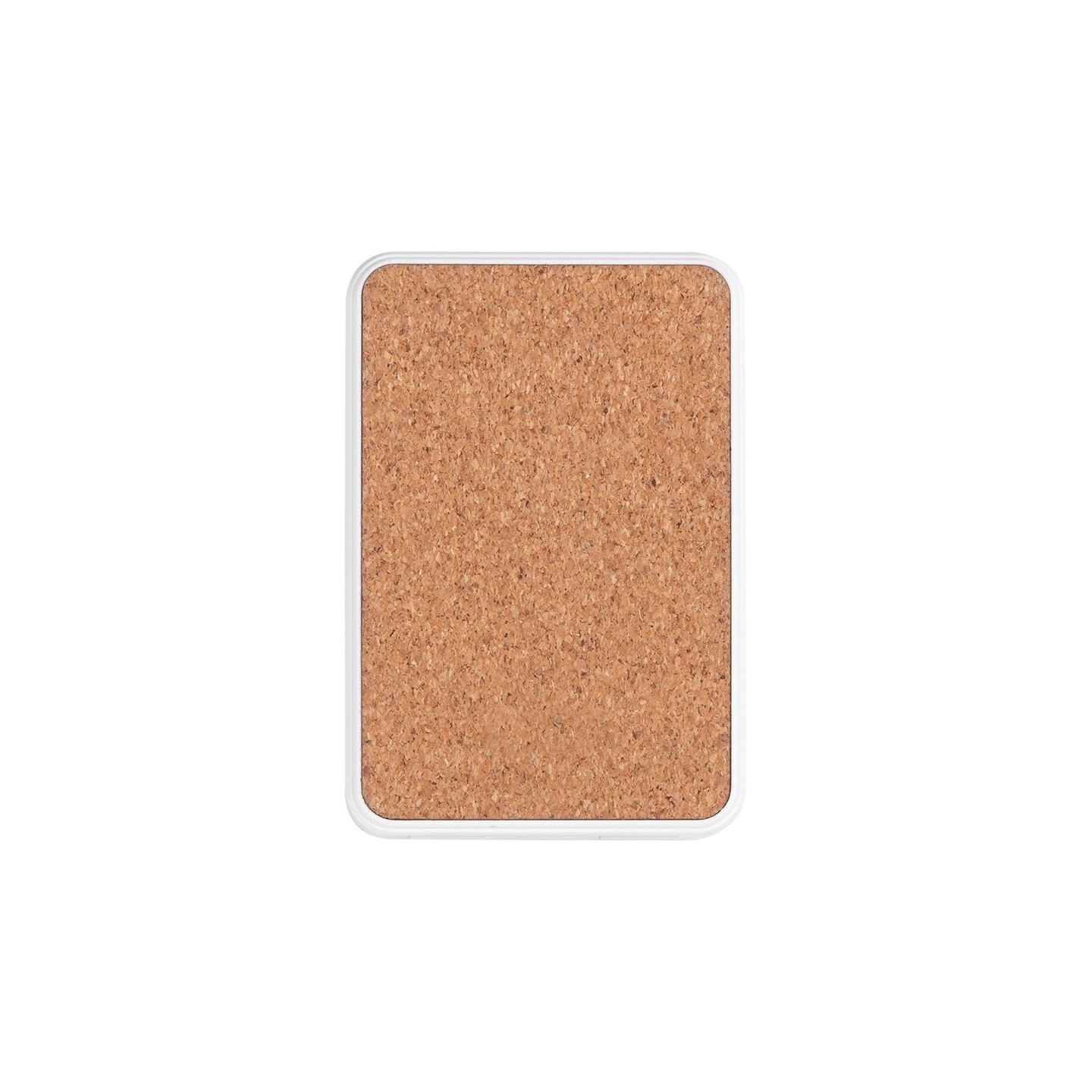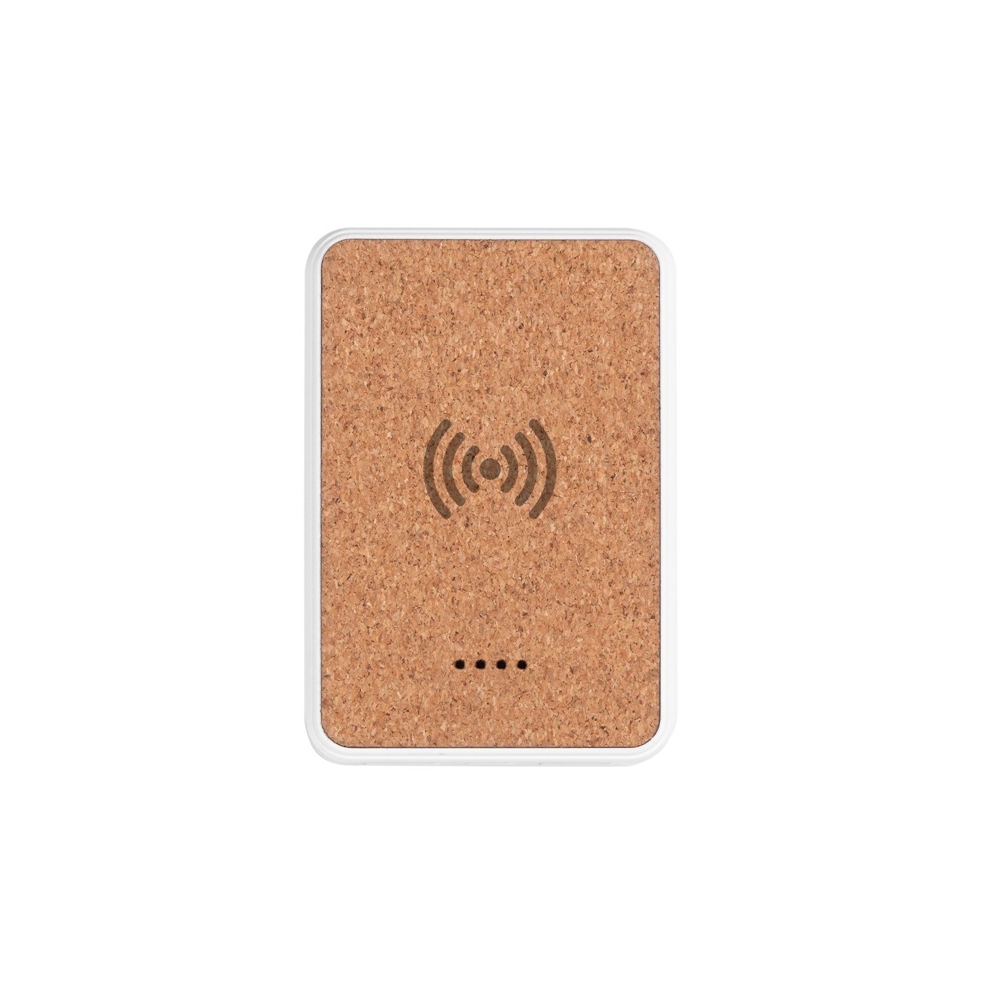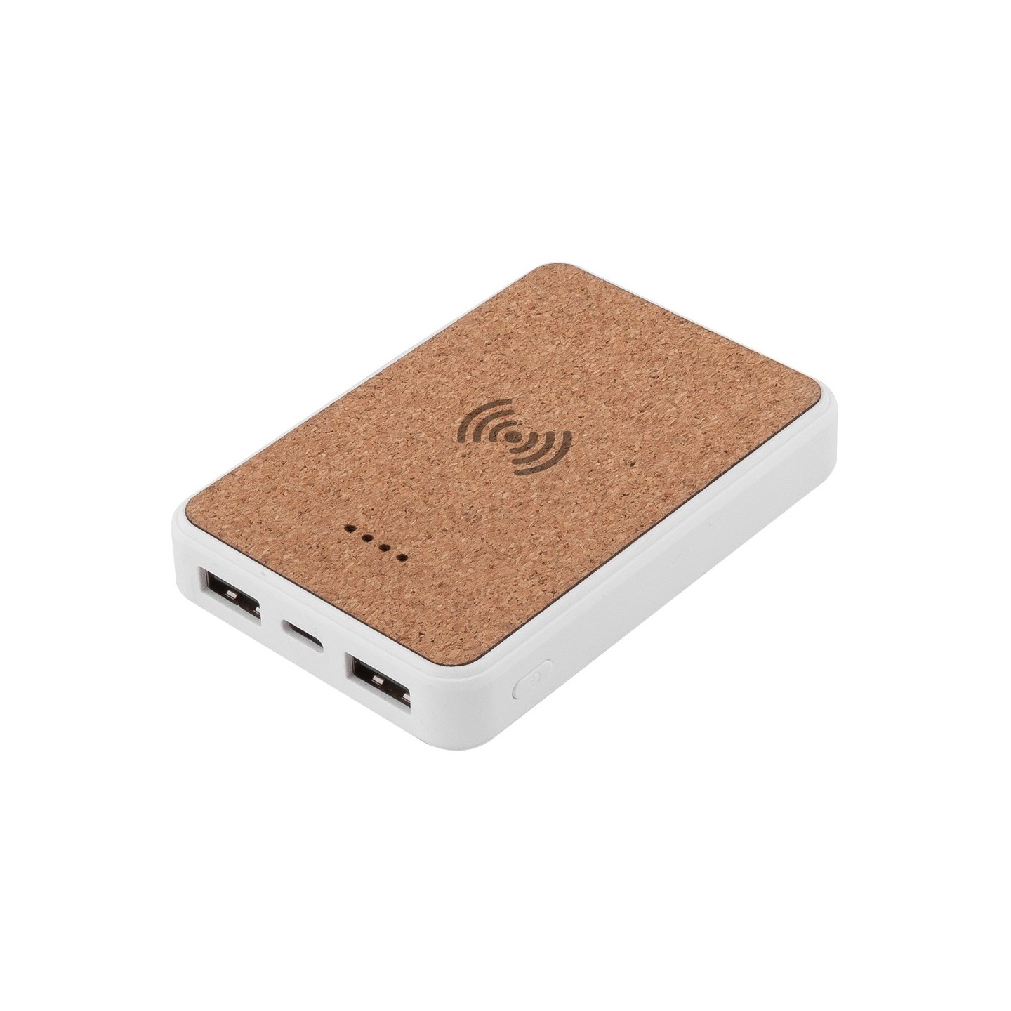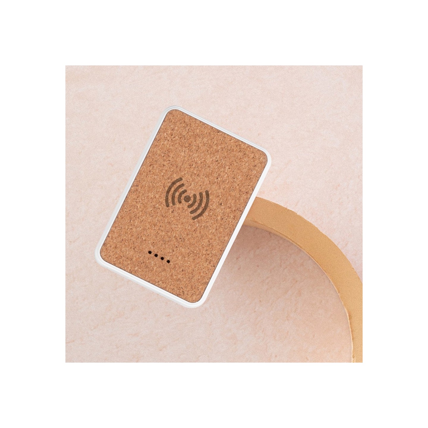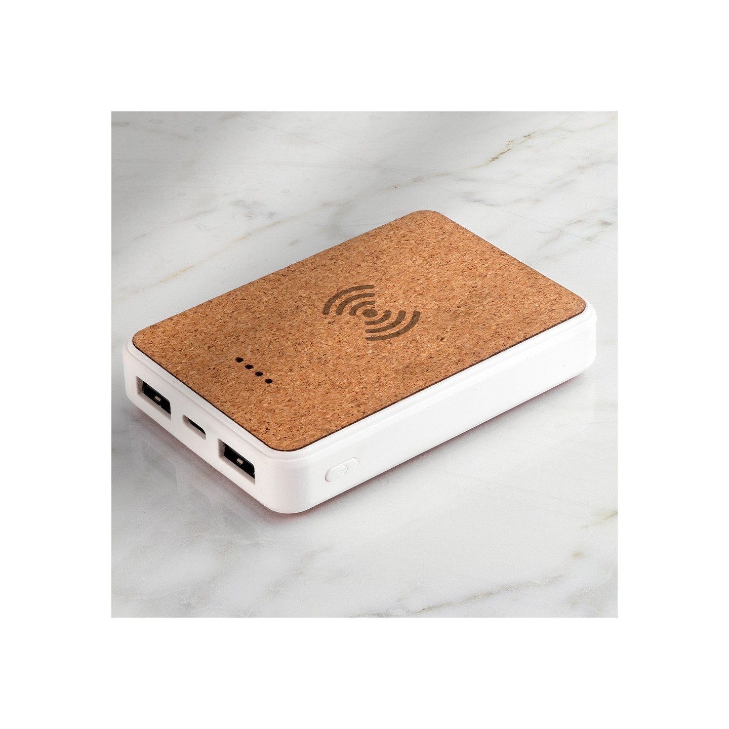 Power Bank Aura de 5000 mAh hecha de corcho y plástico reciclado, con cargador inalámbrico de 5W. Tiene salida USB doble, entrada Tipo C e incluye cable. ¡Personalizable, eco-friendly y con certificado europeo!