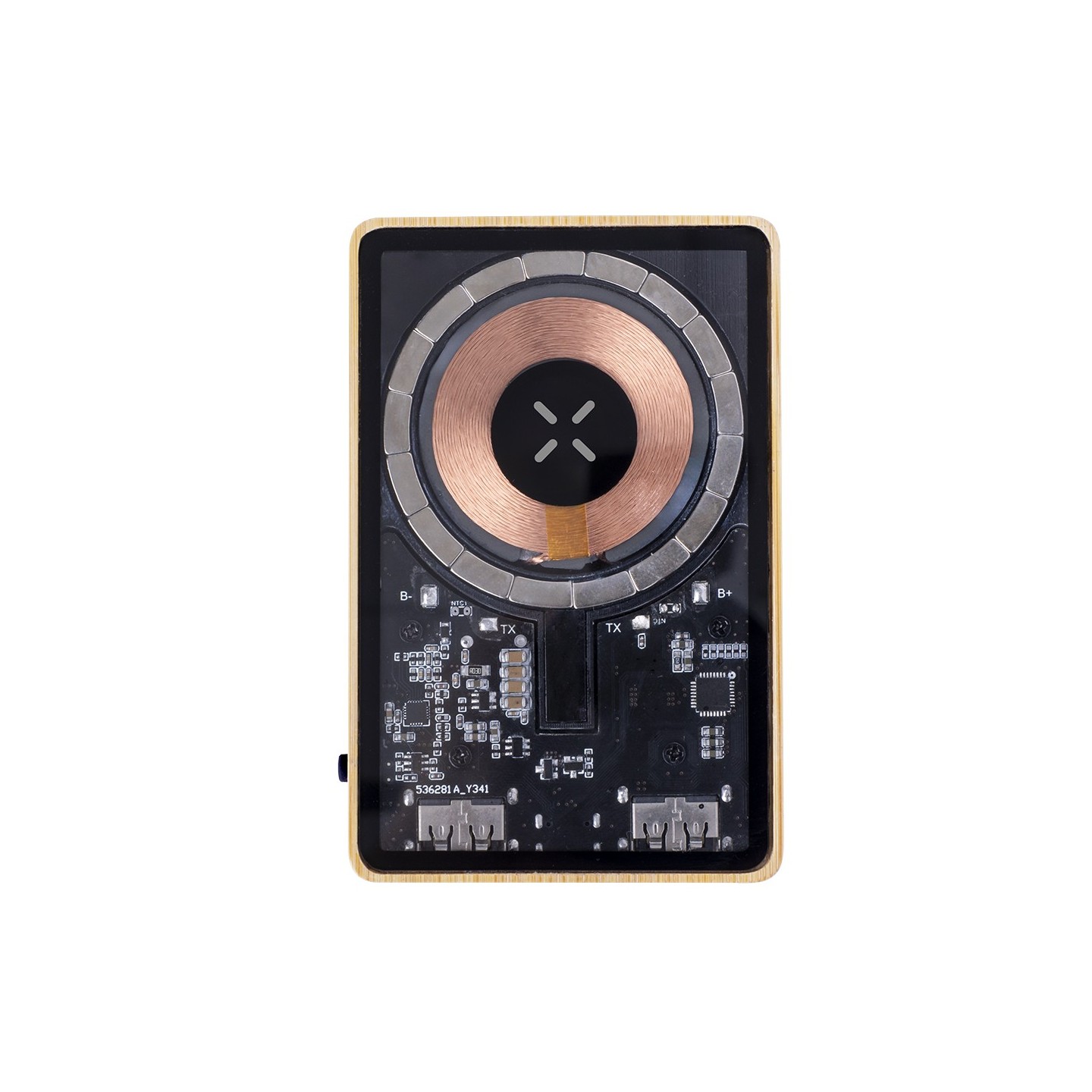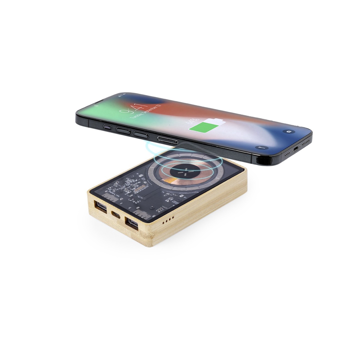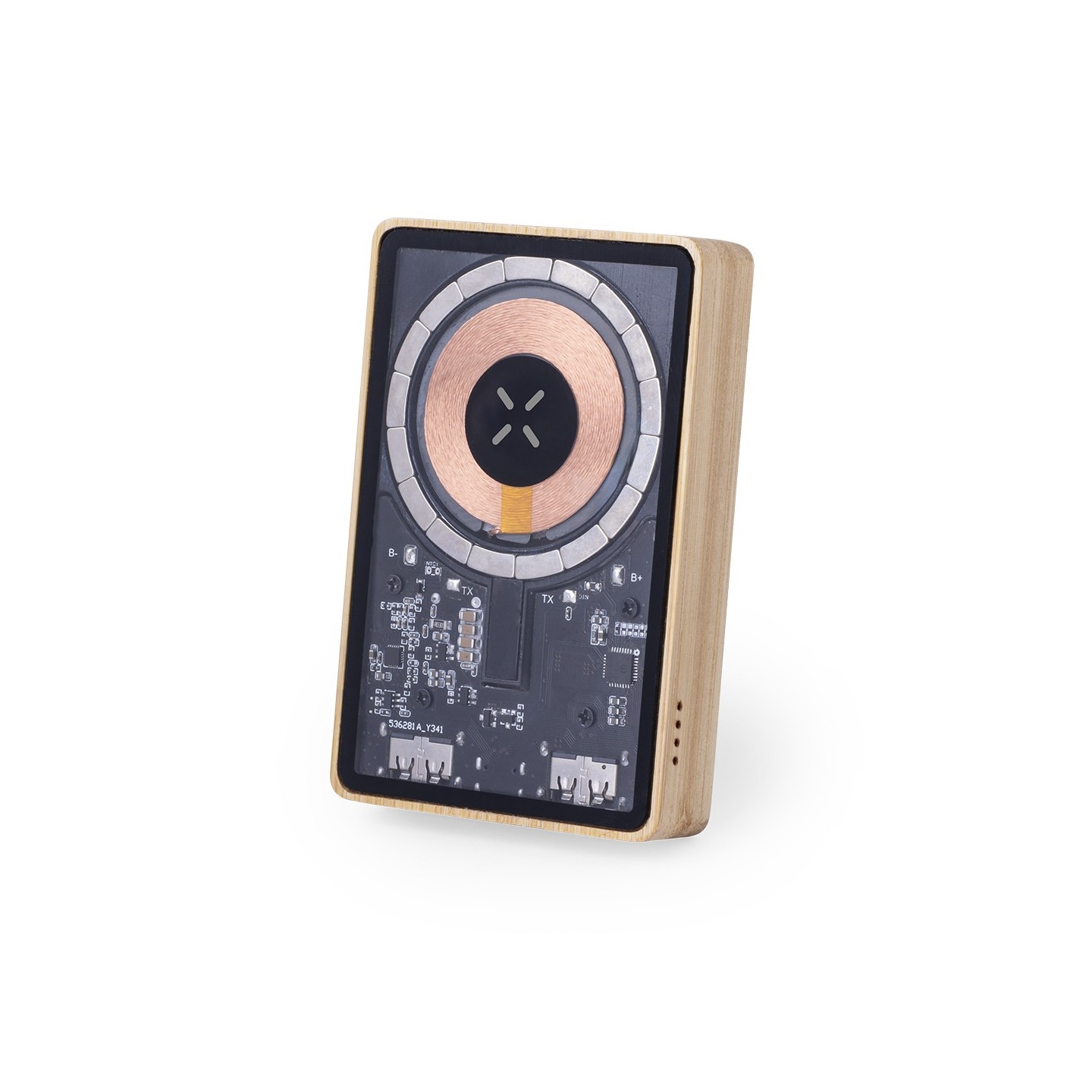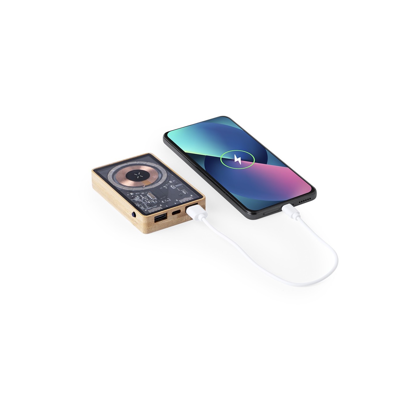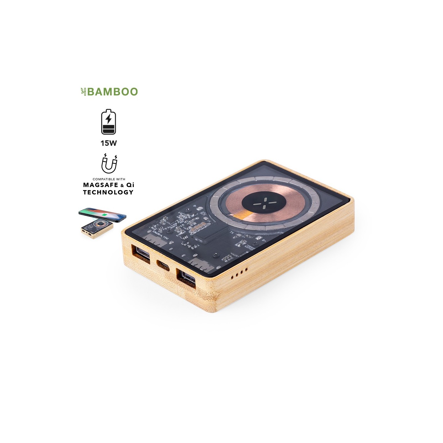 Batería auxiliar externa de original diseño y superficie transparente que permite ver los componentes internos del dispositivo. Ofrece una capacidad de carga de 5.000 mAh, con base en bambú y cargador inalámbrico integrado de 15W. Cuenta con conexiones de entrada/salida Tipo C y salida USB, así como fijación magnética Magsafe, siendo compatible con dispositivos equipados con tecnología de carga inalámbrica Qi. Incluye cable de carga y manual de instrucciones en español e inglés. Presentada en caja individual de diseño ecológico y en cartón kraft.