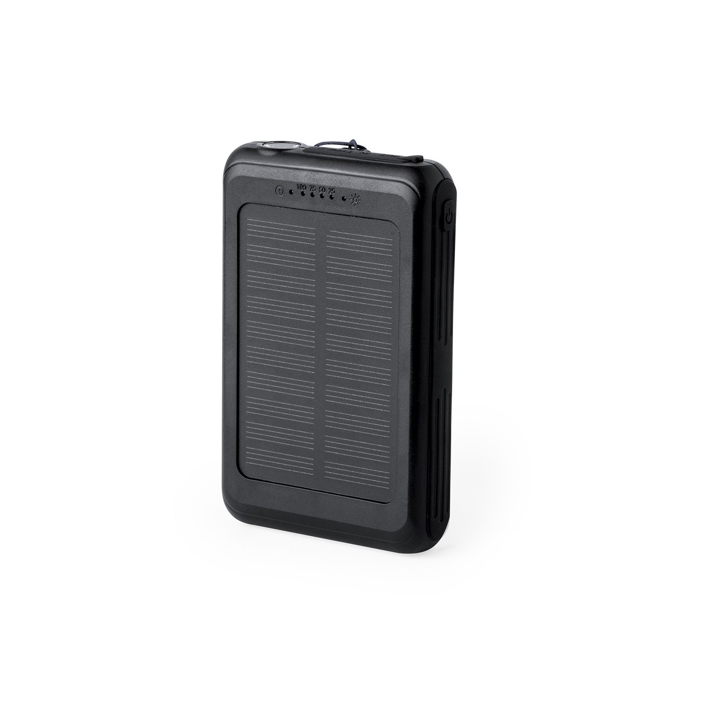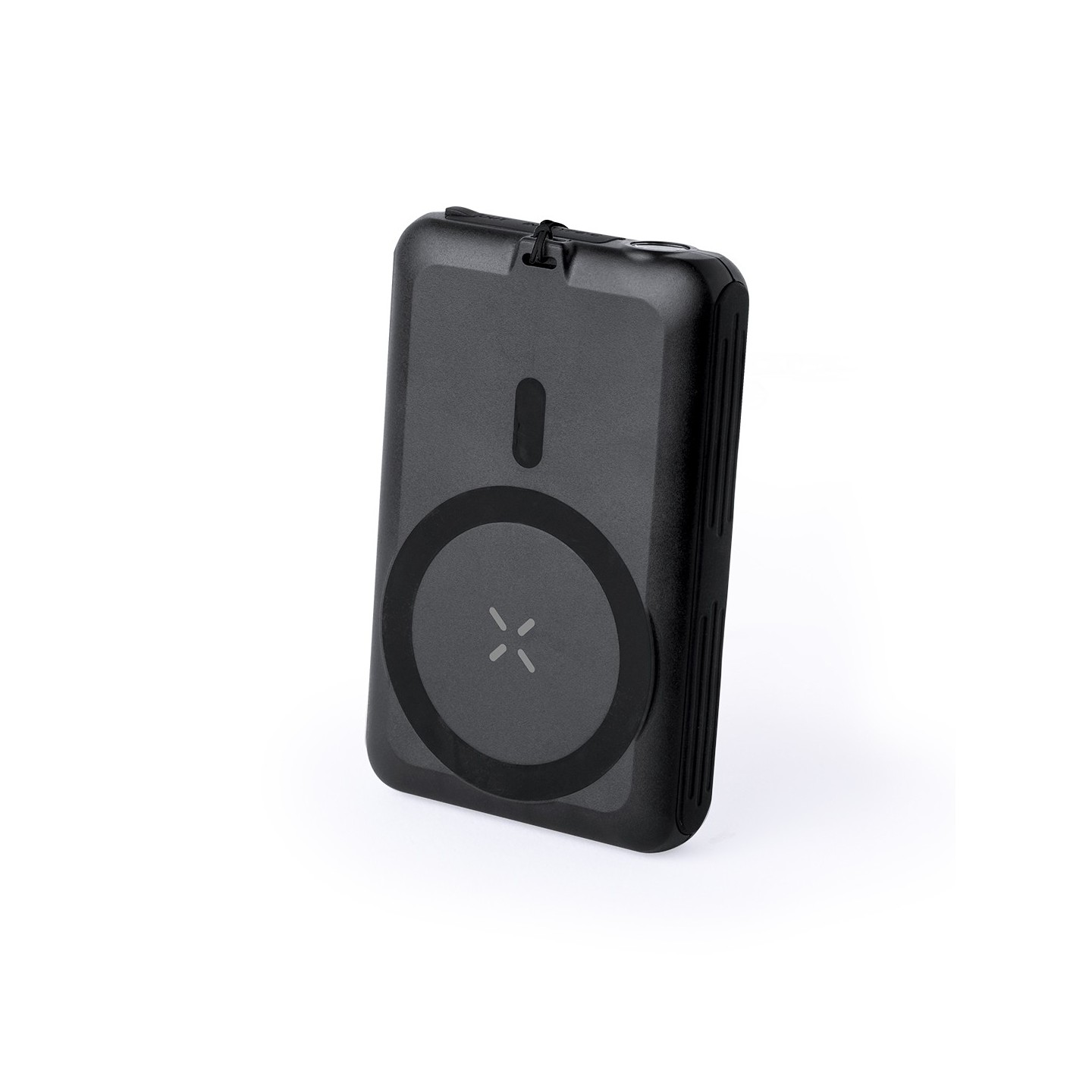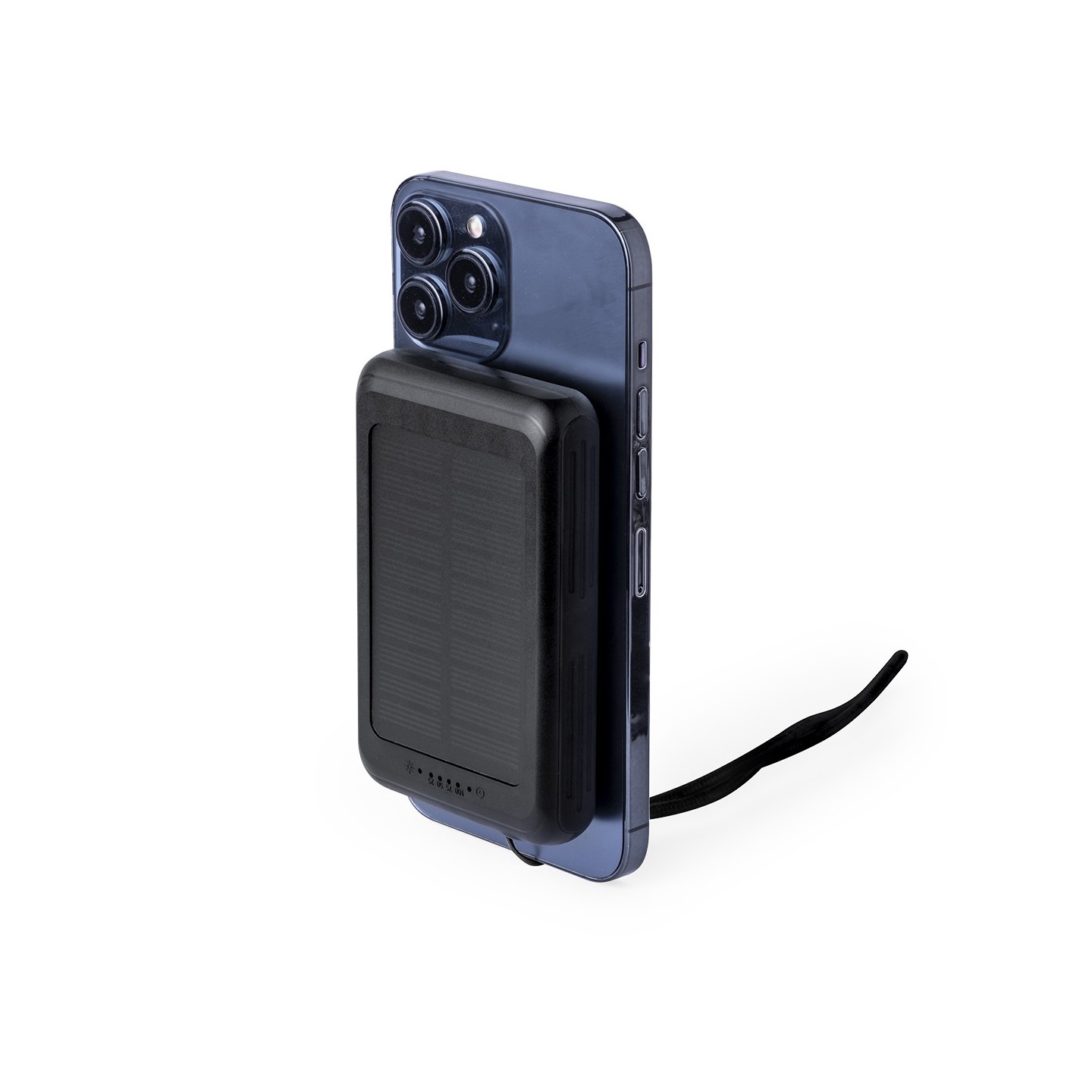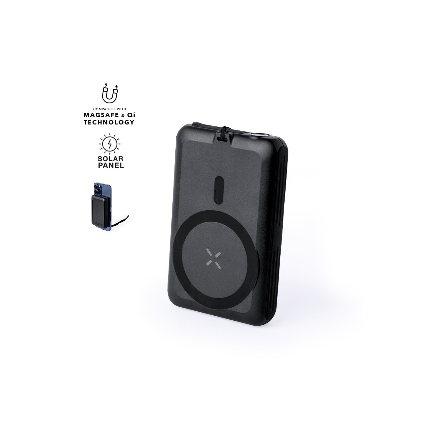 Batería auxiliar externa de recarga solar y de gran capacidad de carga -5.000 mAh-. Con cargador inalámbrico integrado 5W y fijación magnética Magsafe, permitiendo usar el dispositivo mientras se está cargando y compatible con dispositivos equipados con tecnología de carga inalámbrica Qi. Además, cuenta con una luz LED con dos posiciones de luz, fija e intermitente. Fabricada en resistente ABS de color negro, con conector de entrada/salida Tipo C + 1 salida USB + 1 entrada Micro USB. Presentada en atractiva caja individual de diseño.
