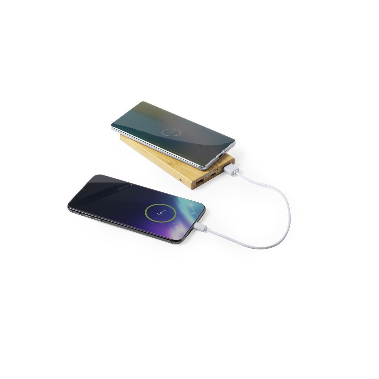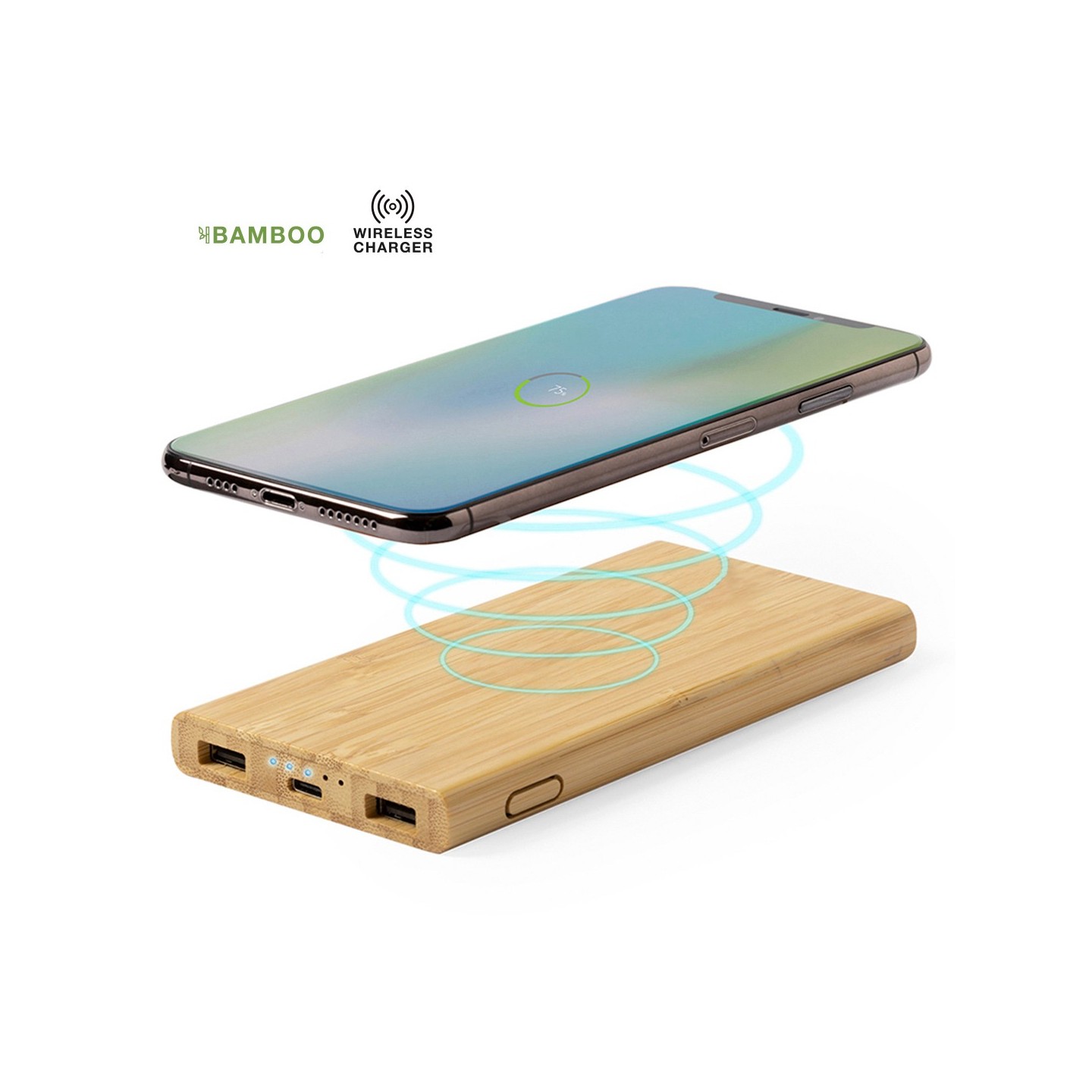 El Power Bank Kalery es una batería externa nature de 6.000 mAh en bambú. Carga inalámbrica y hasta 3 dispositivos simultáneamente. Elegancia sostenible.