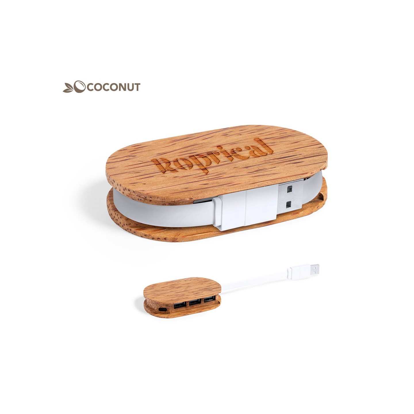El Puerto USB Dagobat es eco-amigable, fabricado en coco con 1 puerto Tipo C y 3 puertos USB. Regalo corporativo sostenible y funcional.