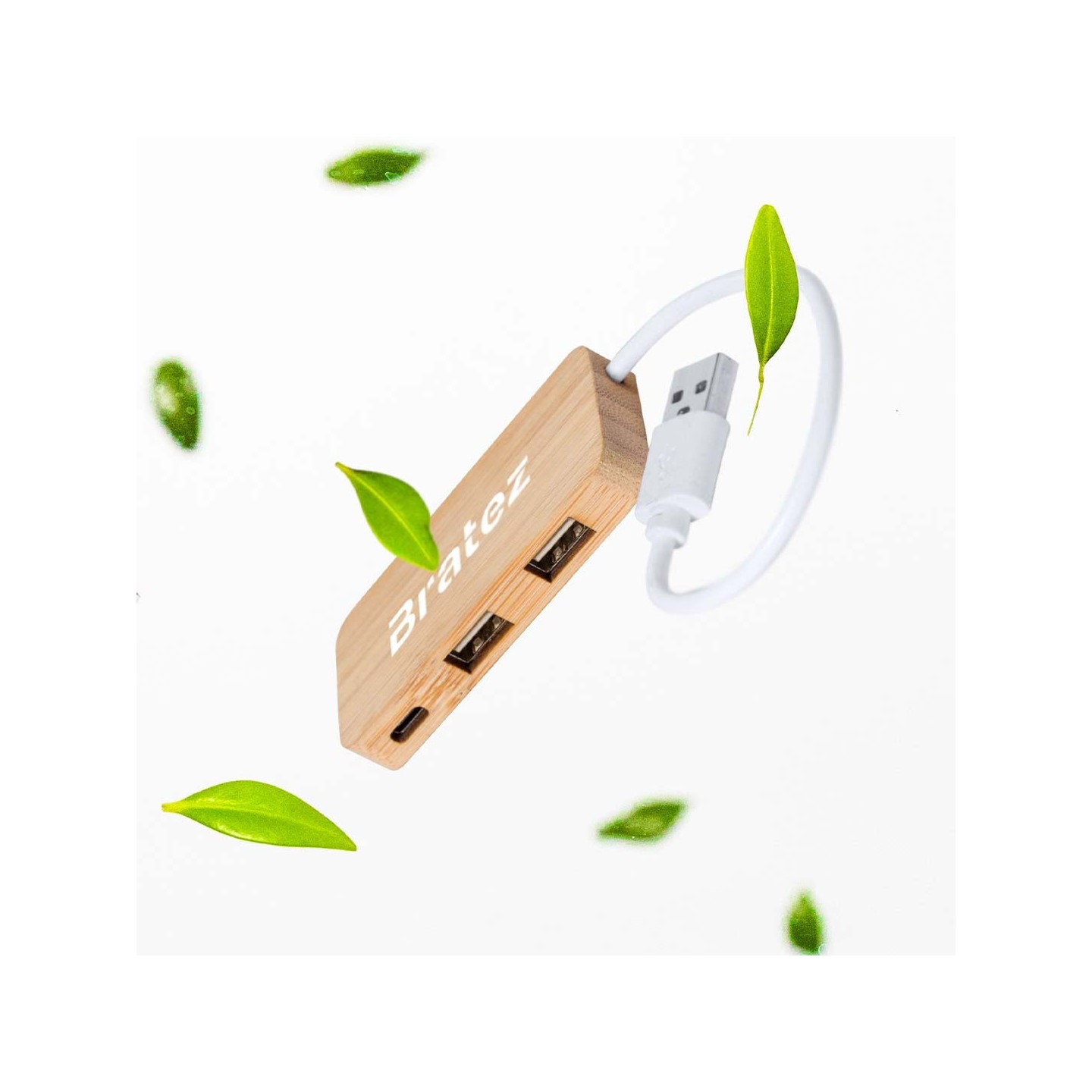 Puerto USB 2.0 de línea nature y fabricado en bambú. Incluye 1 puerto Tipo C y 2 puertos USB. Presentado en atractiva caja de diseño eco.