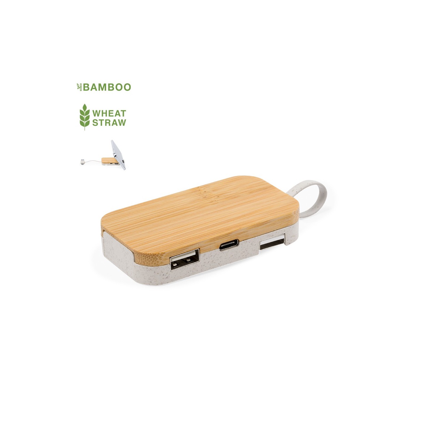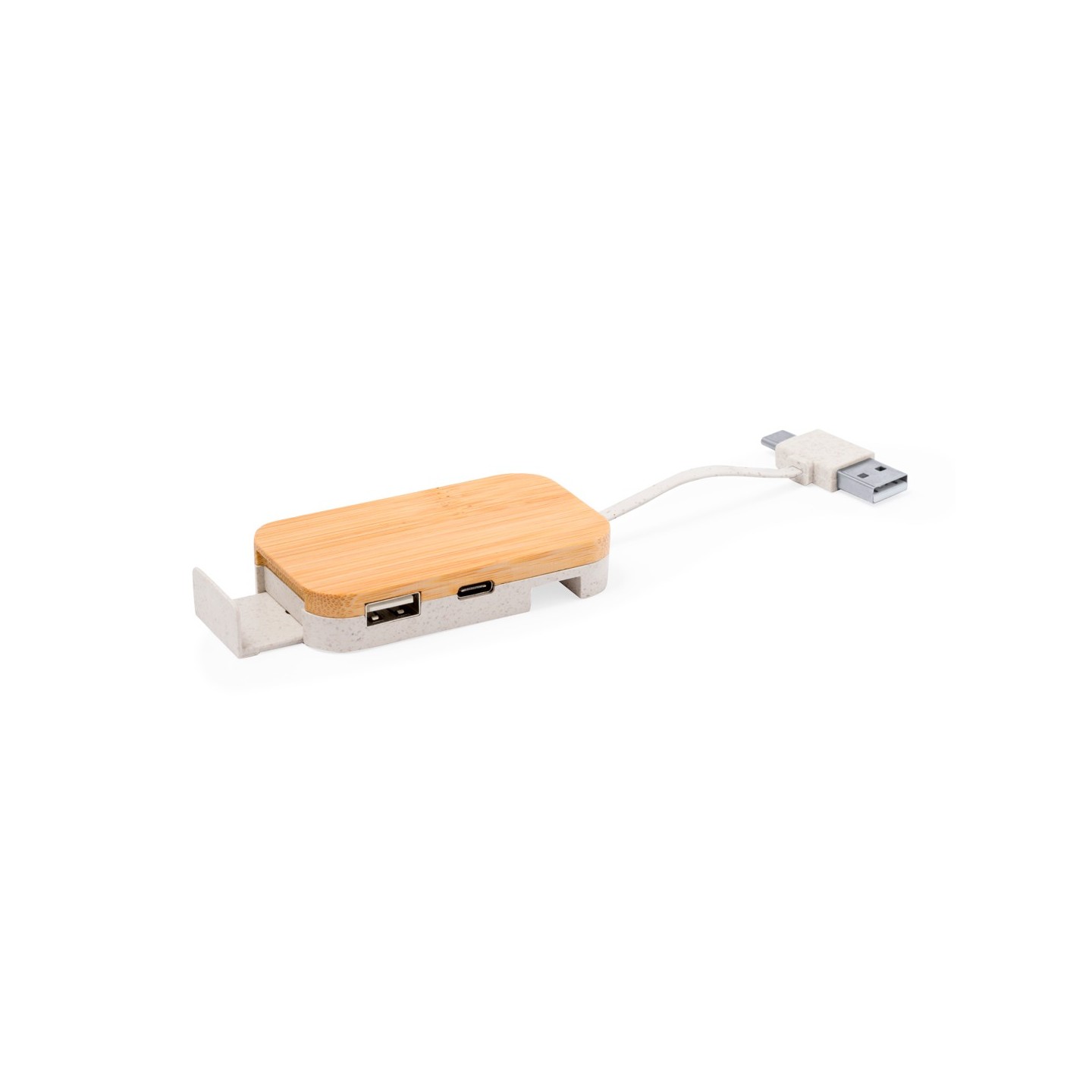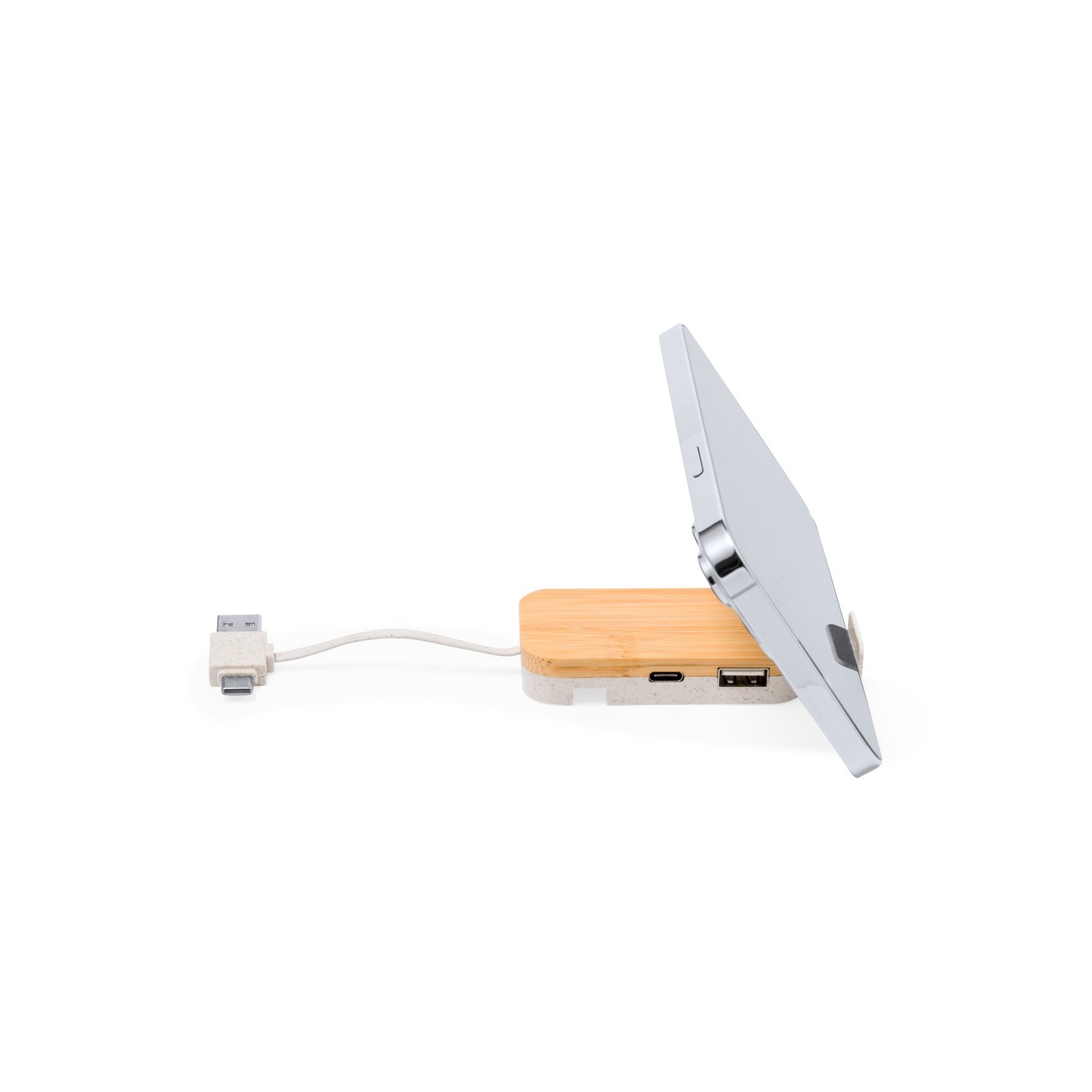Puerto USB con soporte móvil integrado en bambú y caña de trigo. Conexión dual USB/Tipo C, ideal para cargar múltiples dispositivos.