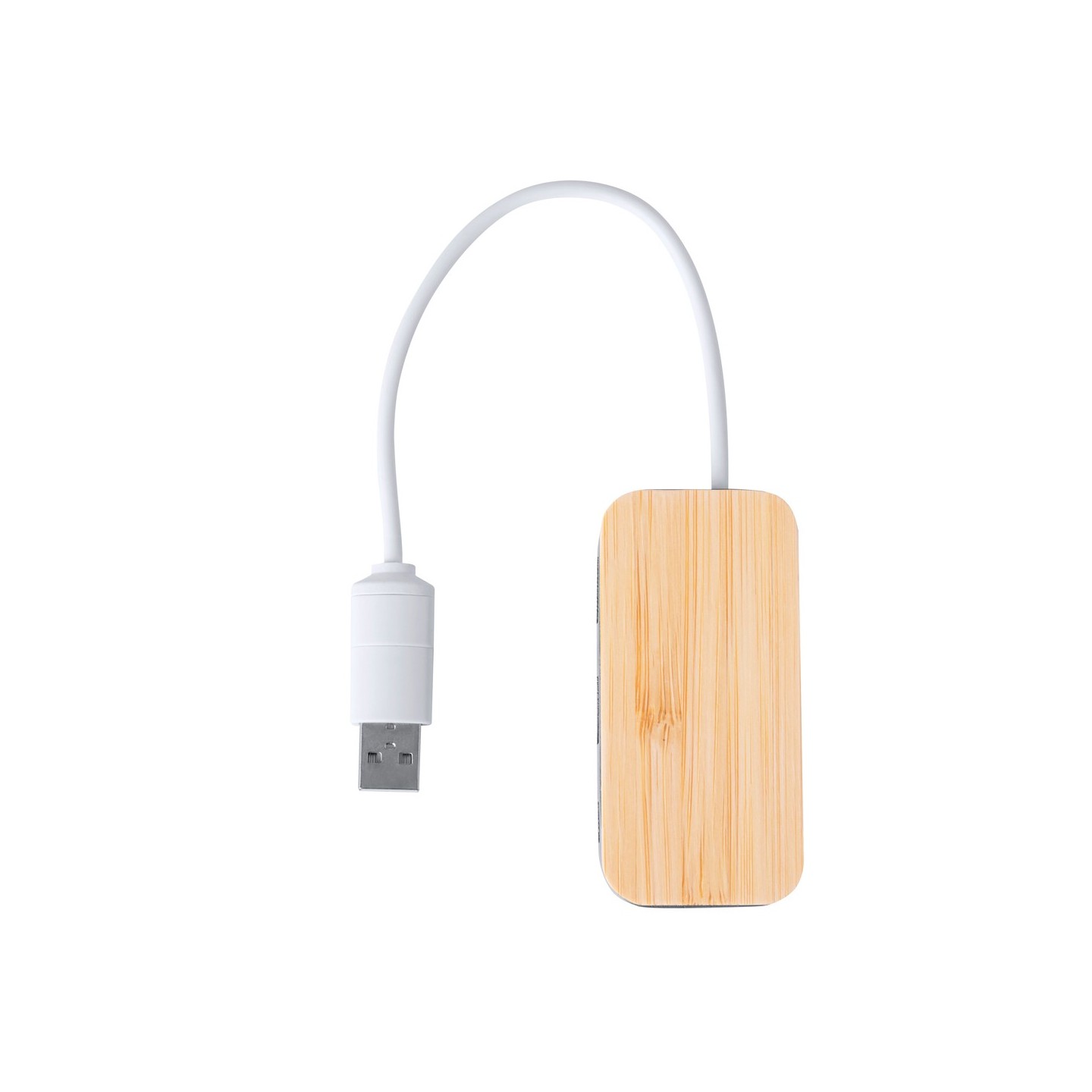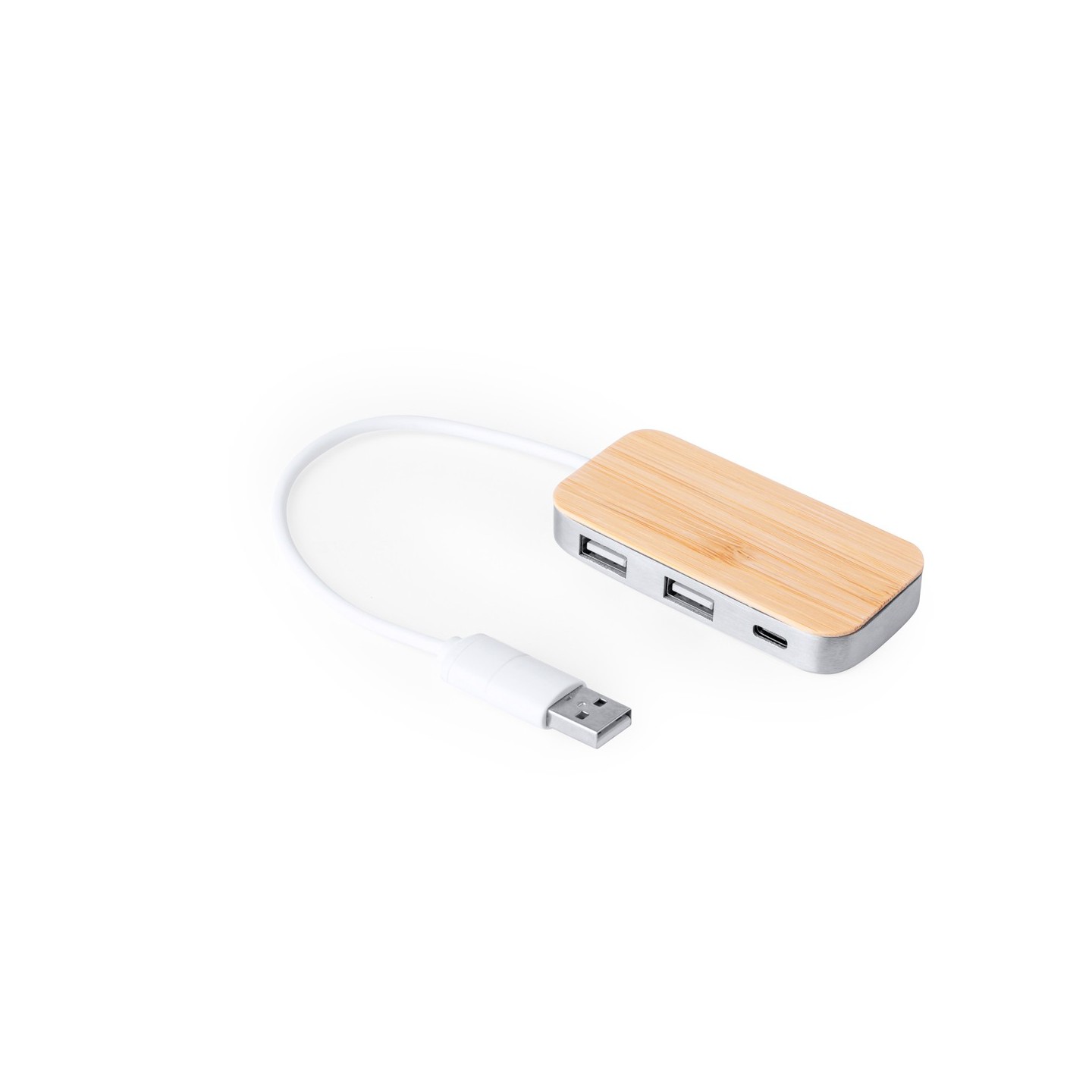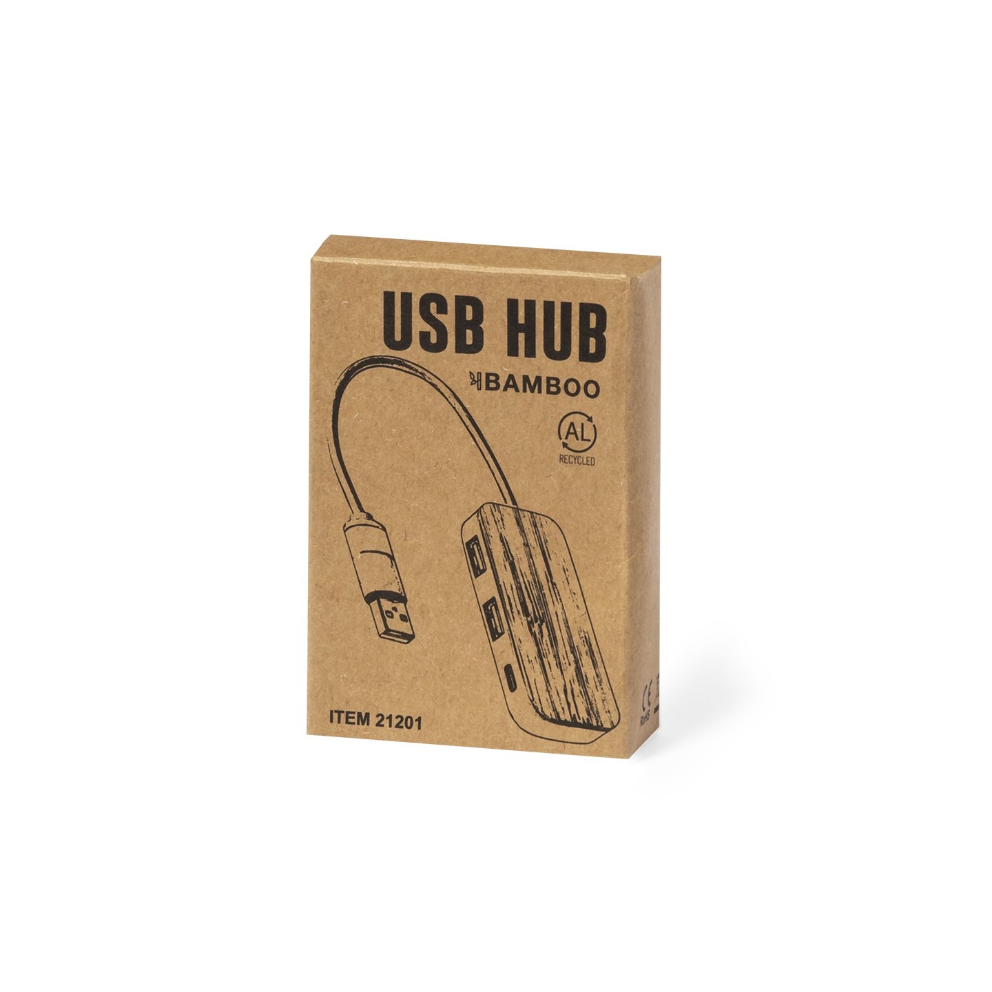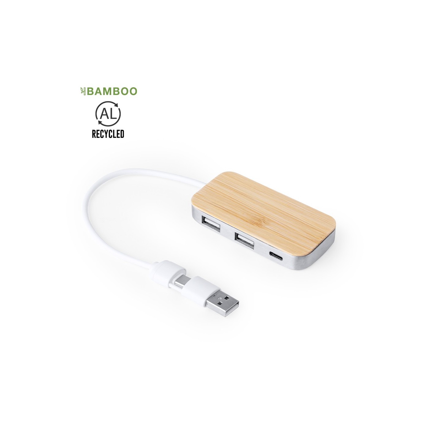 Puerto USB 2.0 fabricado en Aluminio Reciclado con superficie en bambú. Incluye puerto Tipo C y 2 puertos USB, con entrada dual USB/Tipo C. Presentado en caja individual de diseño kraft.