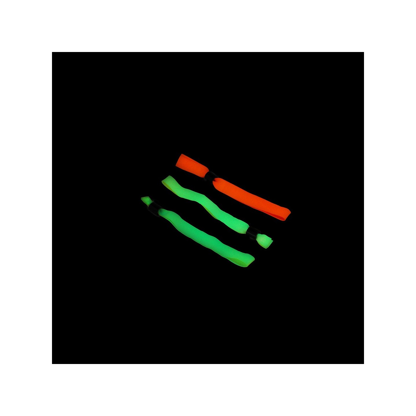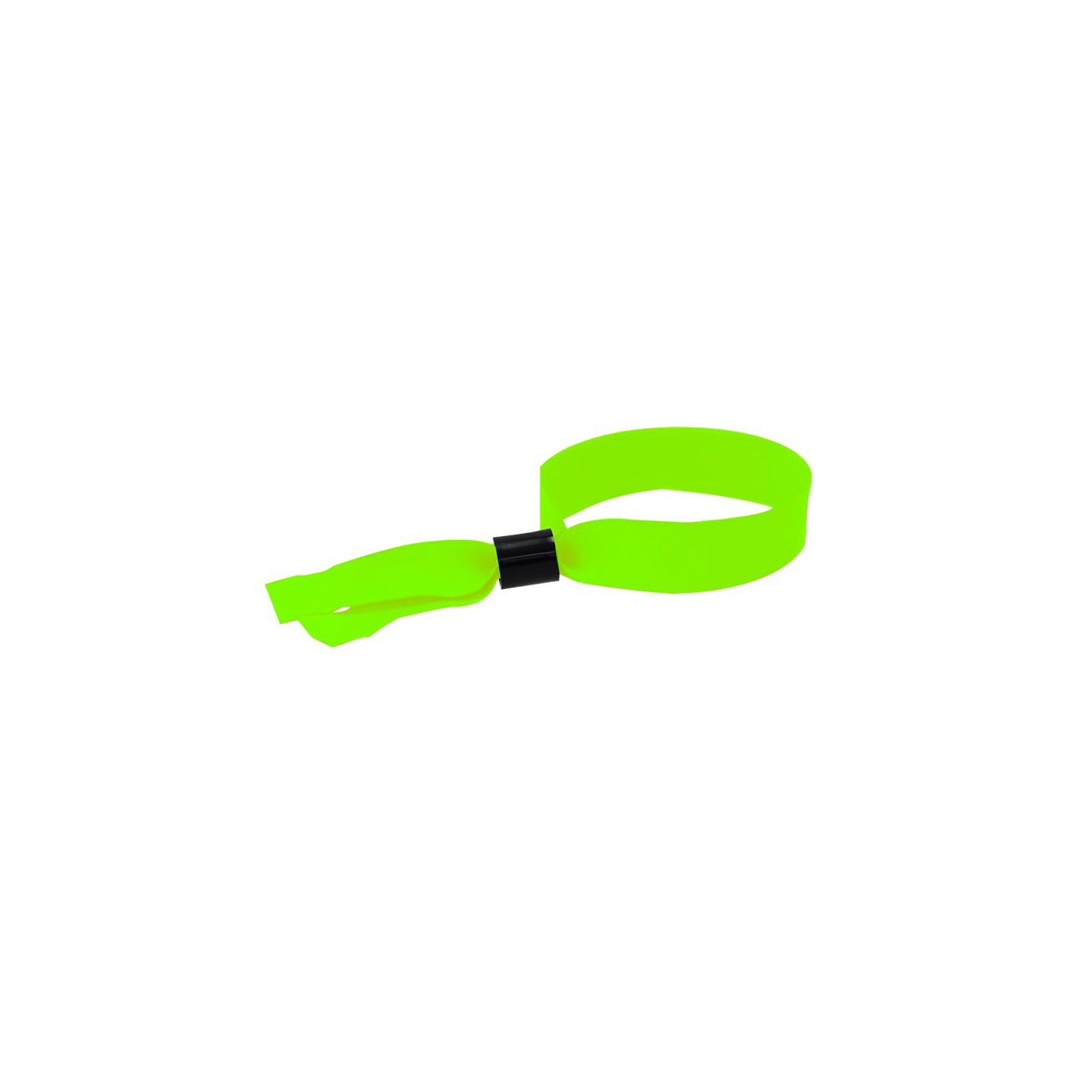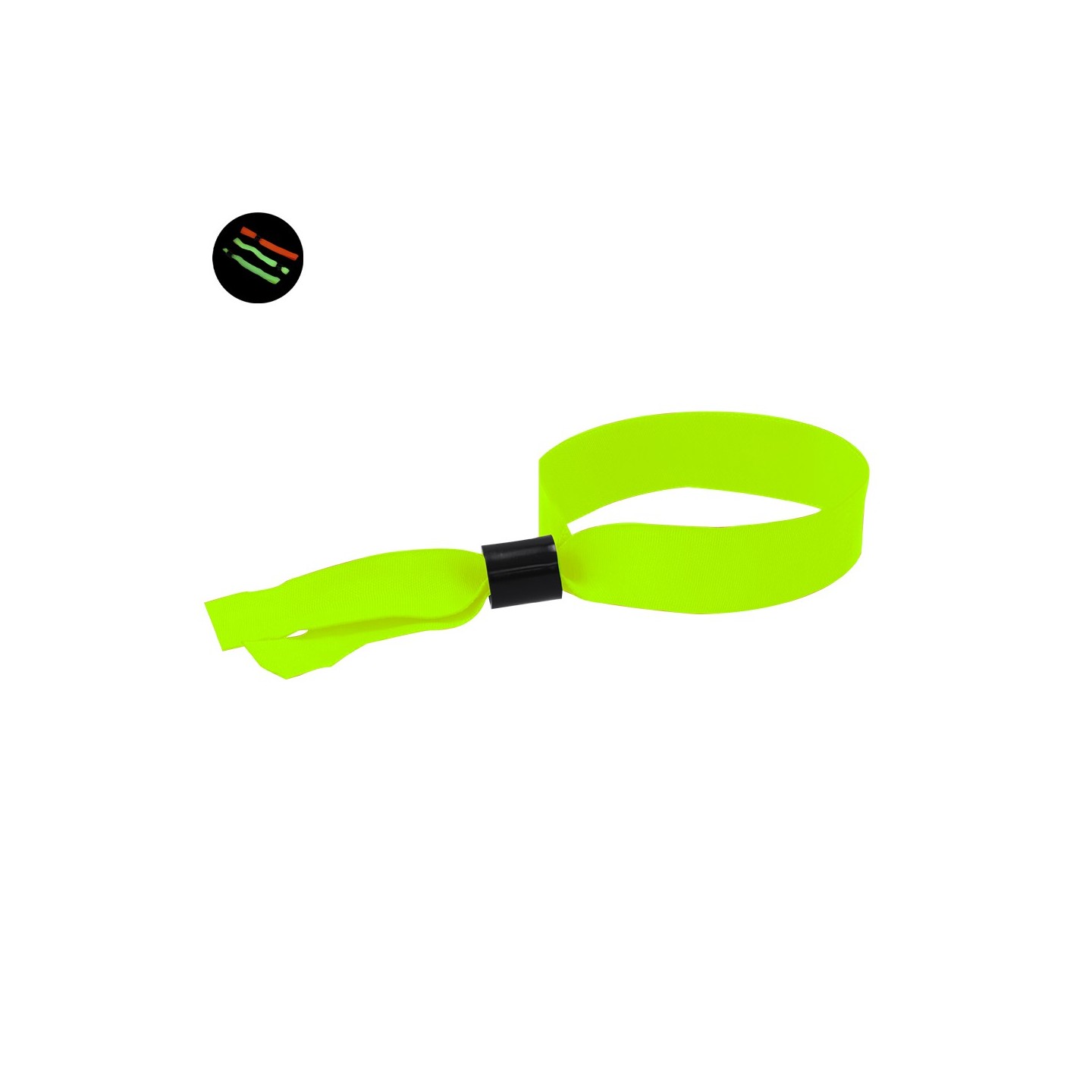 Pulsera de acceso fluorescente para eventos, fabricada en poliéster resistente con cierre ajustable. Personalizable en colores vibrantes como amarillo, naranja, rosa y verde.
