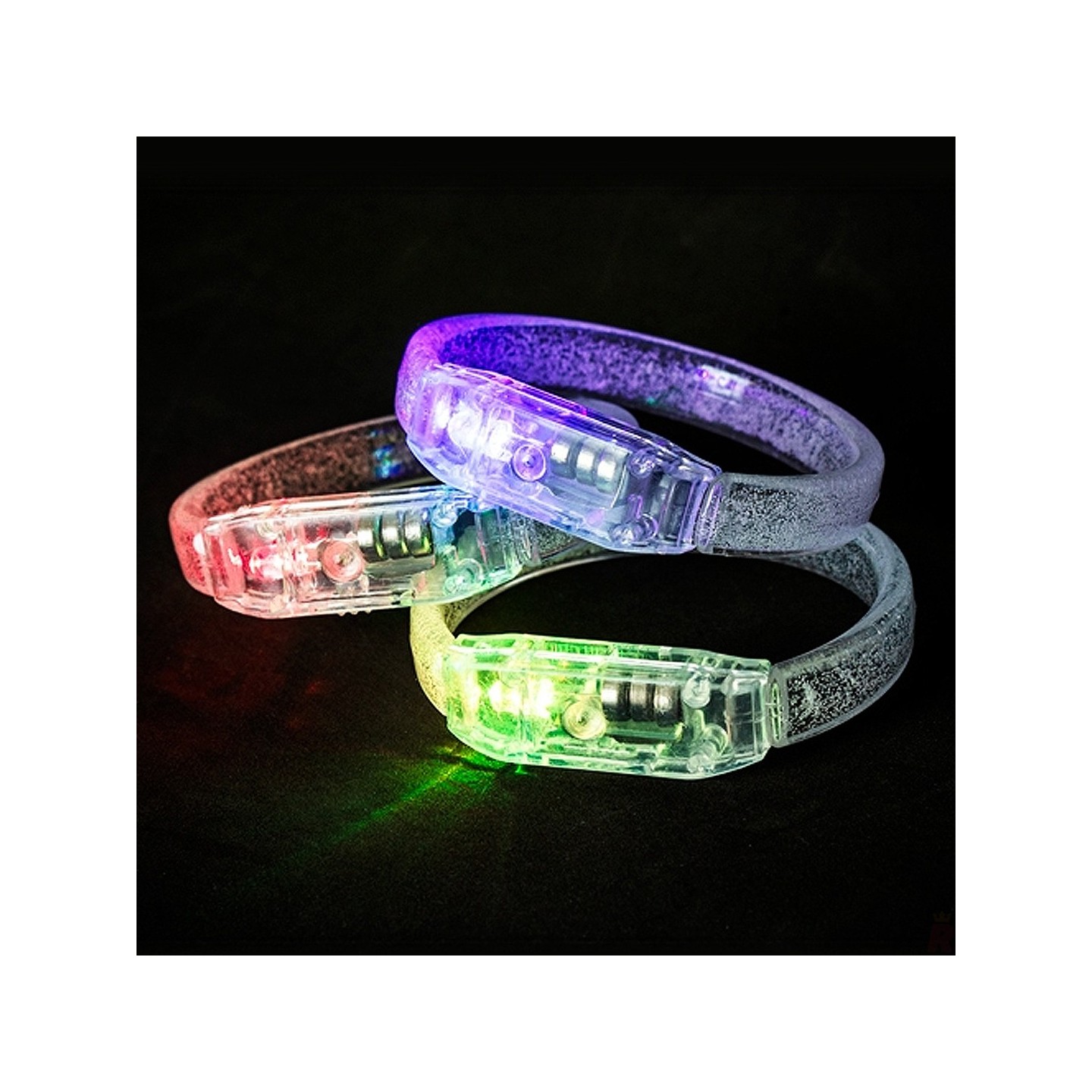 Pulsera luminosa RGB con luz al ritmo de la música. Tres modos de luminosidad y batería incluida. Ideal para eventos, conciertos y fiestas