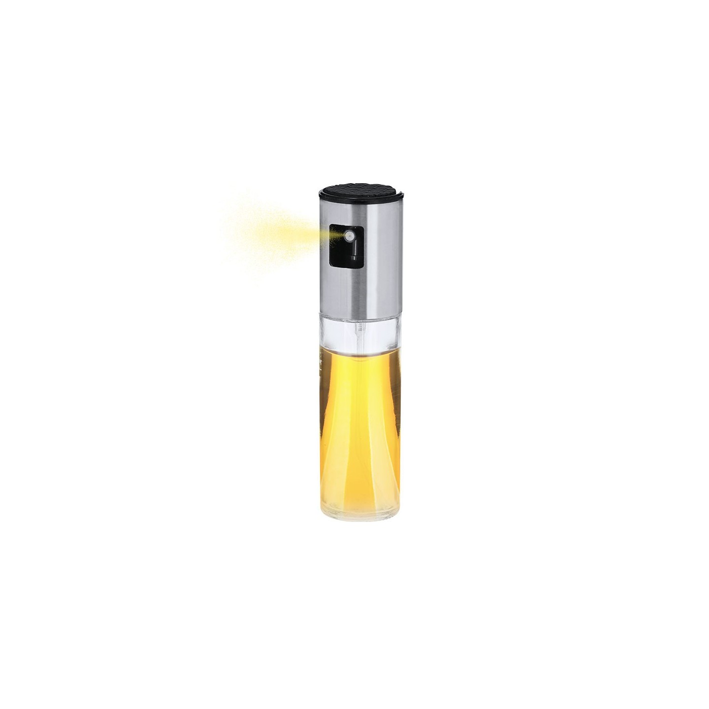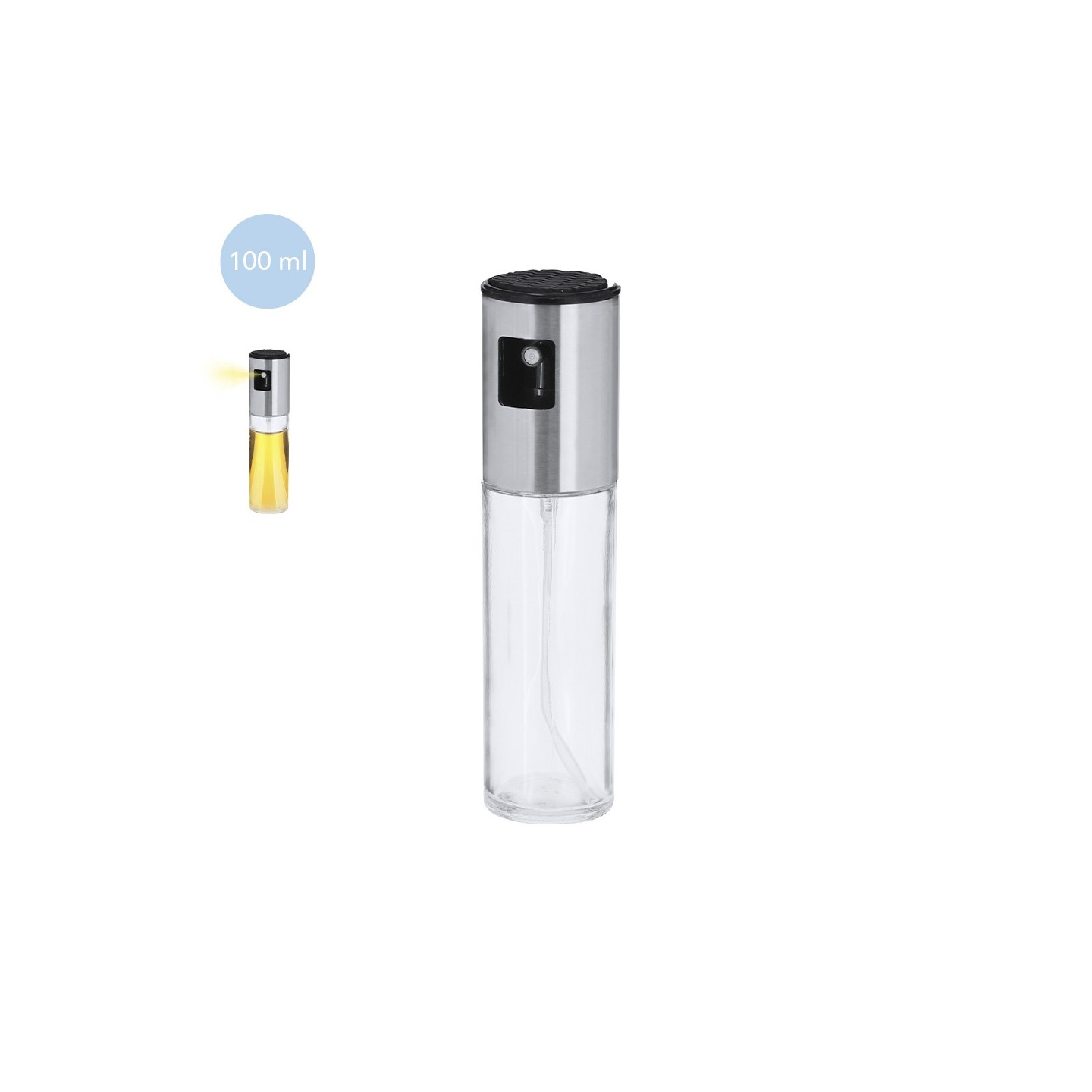 Pulverizador de aceite de cristal y acero inoxidable, con capacidad de 100 ml y mecanismo pulsador para pulverizado uniforme. Personalizable con tu logotipo.