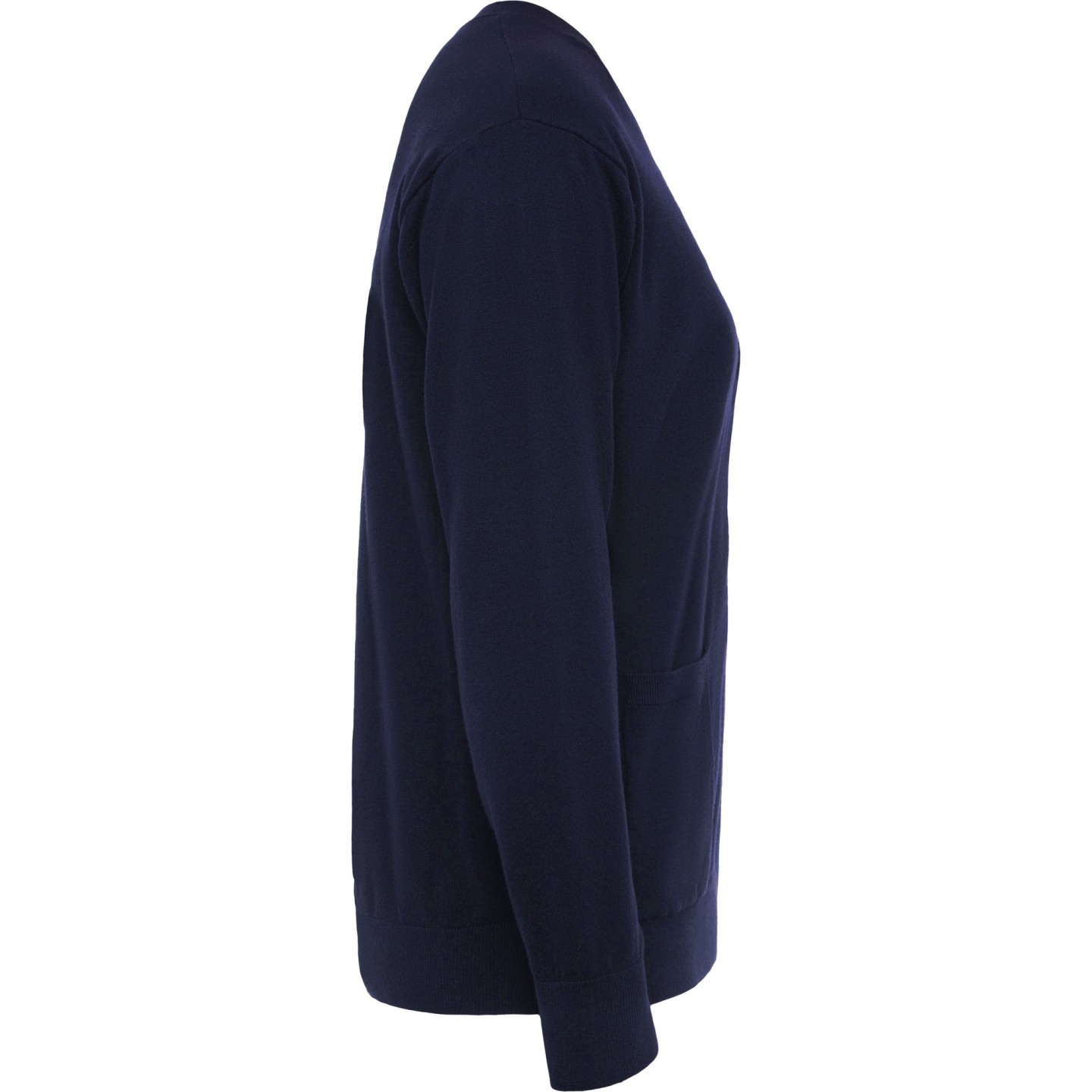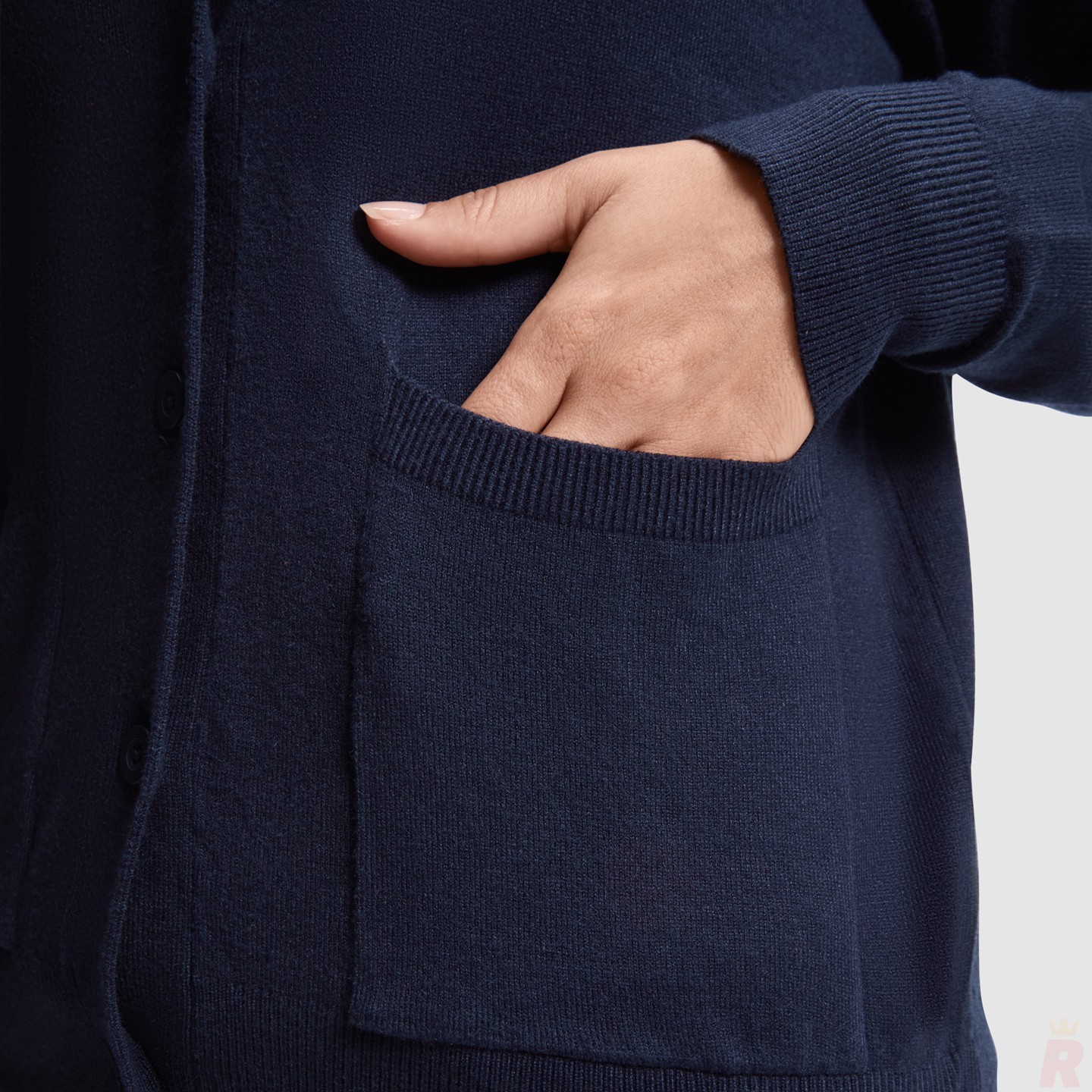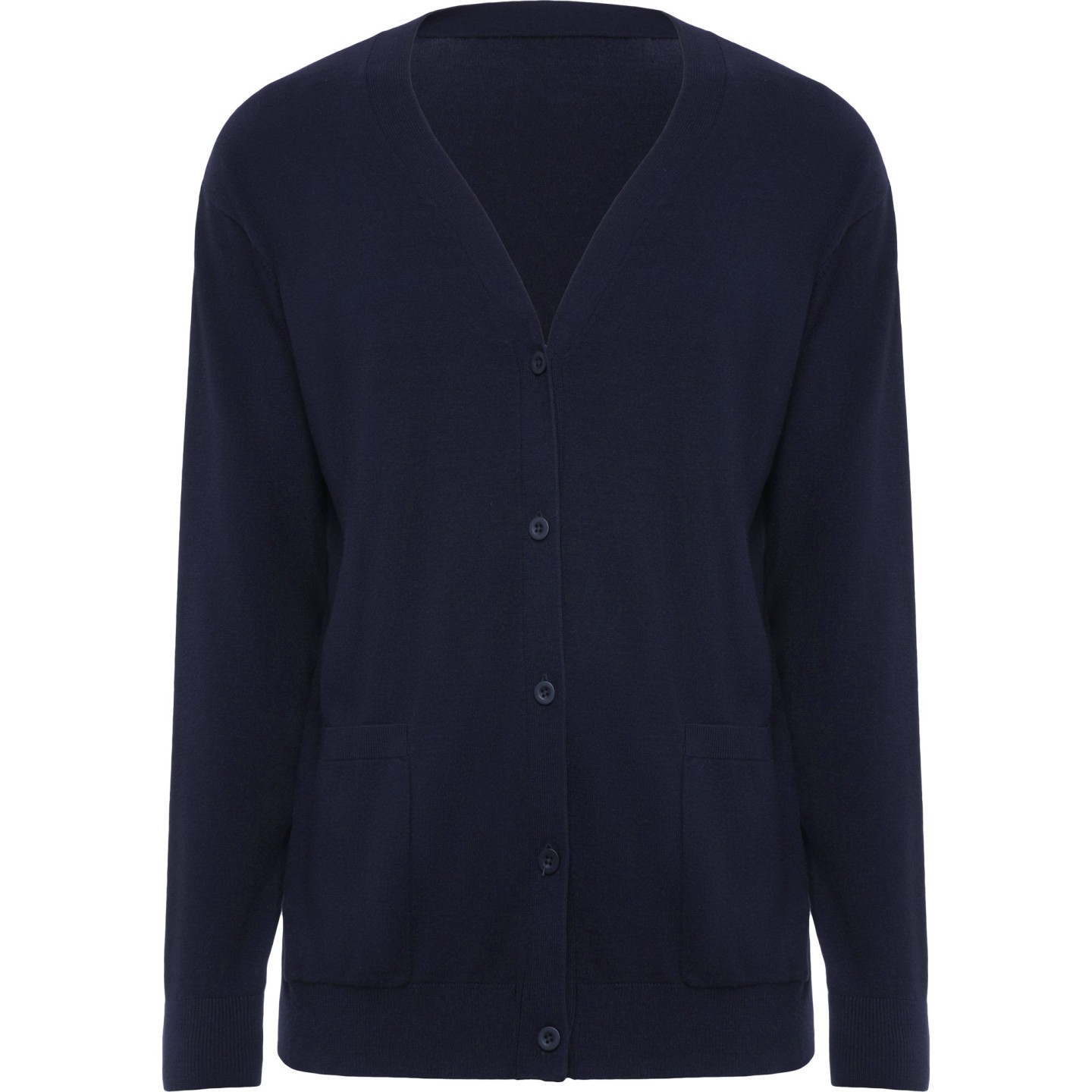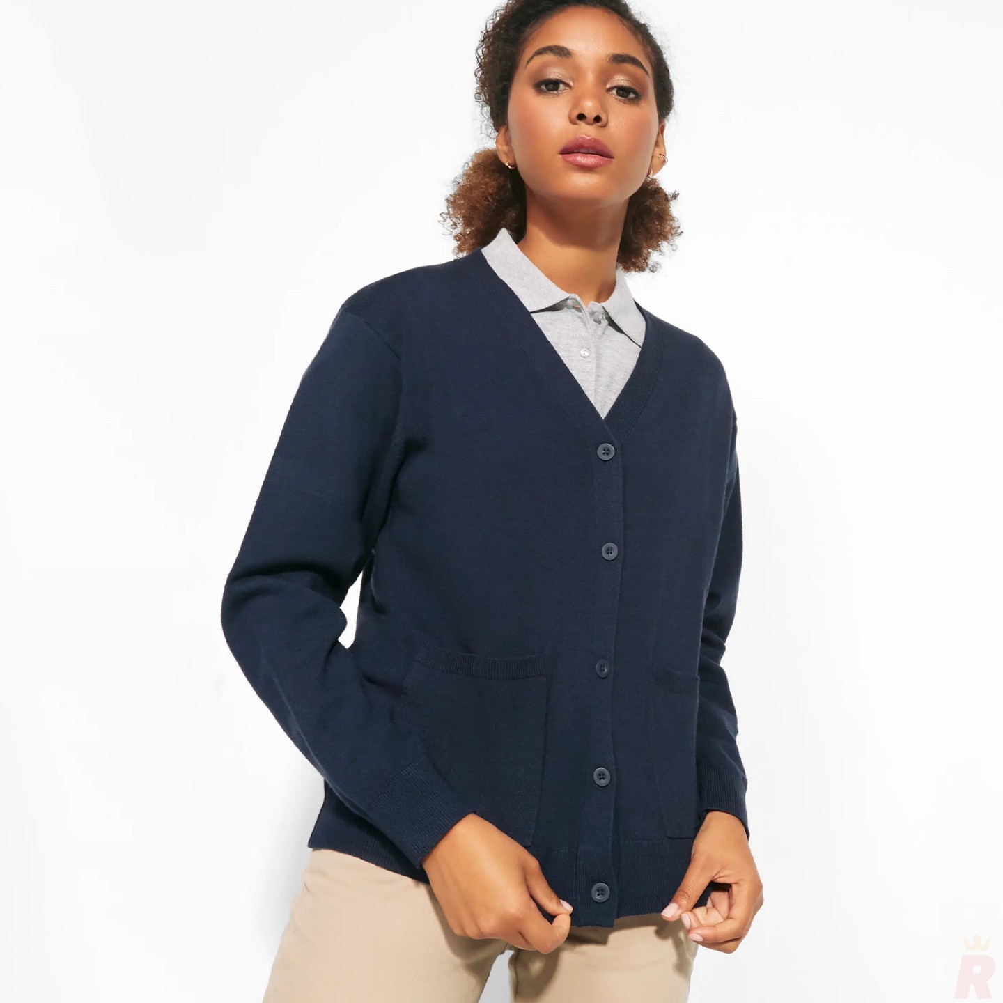 Rebeca de punto fino para mujer con cuello pico, bolsillos frontales y etiqueta removible. Ideal para personalizar con logotipo en entornos laborales