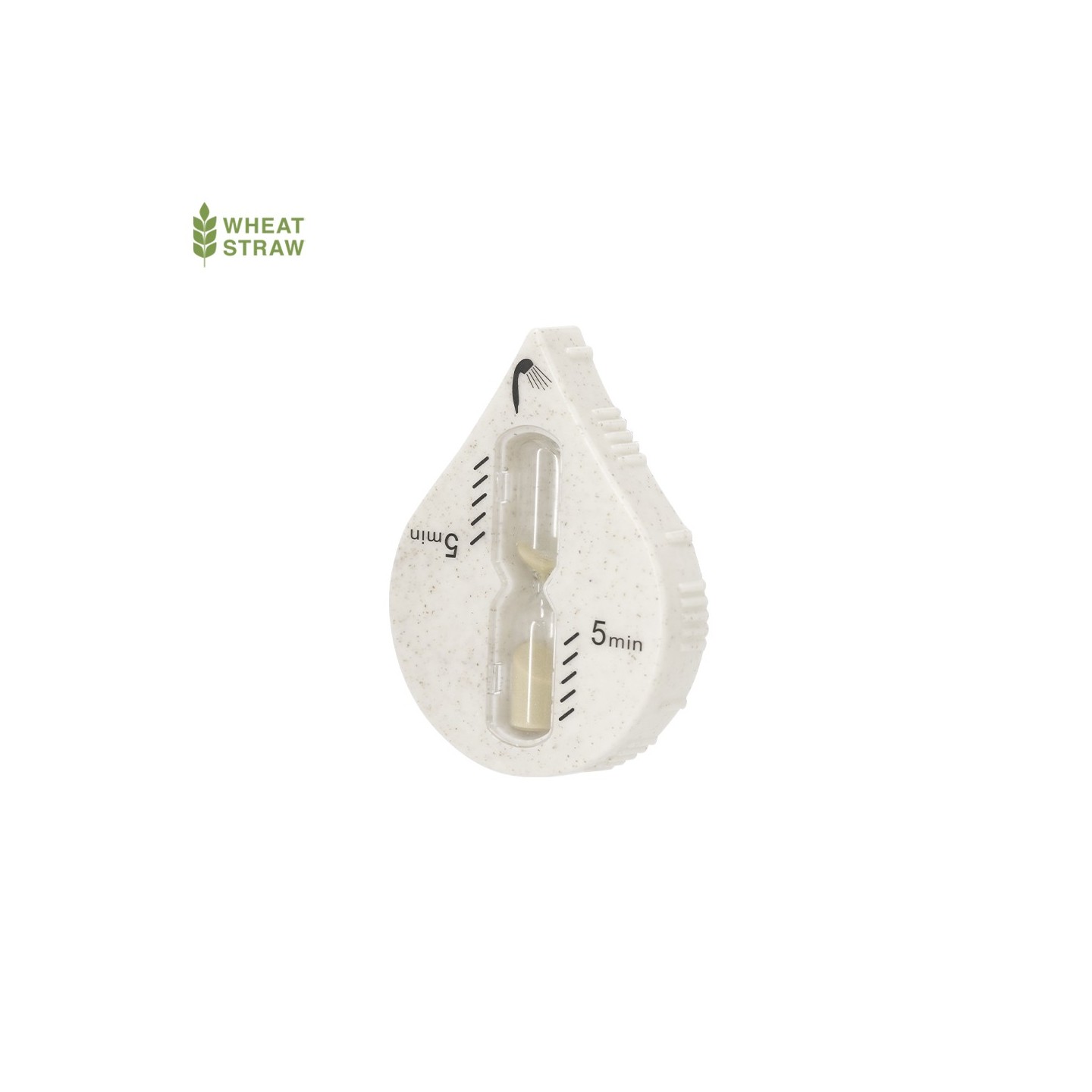 Reloj de arena ecológico de caña de trigo con diseño en forma de gota. Duración de 5 minutos, ventosa de alta adherencia y personalizable con tu logotipo.
