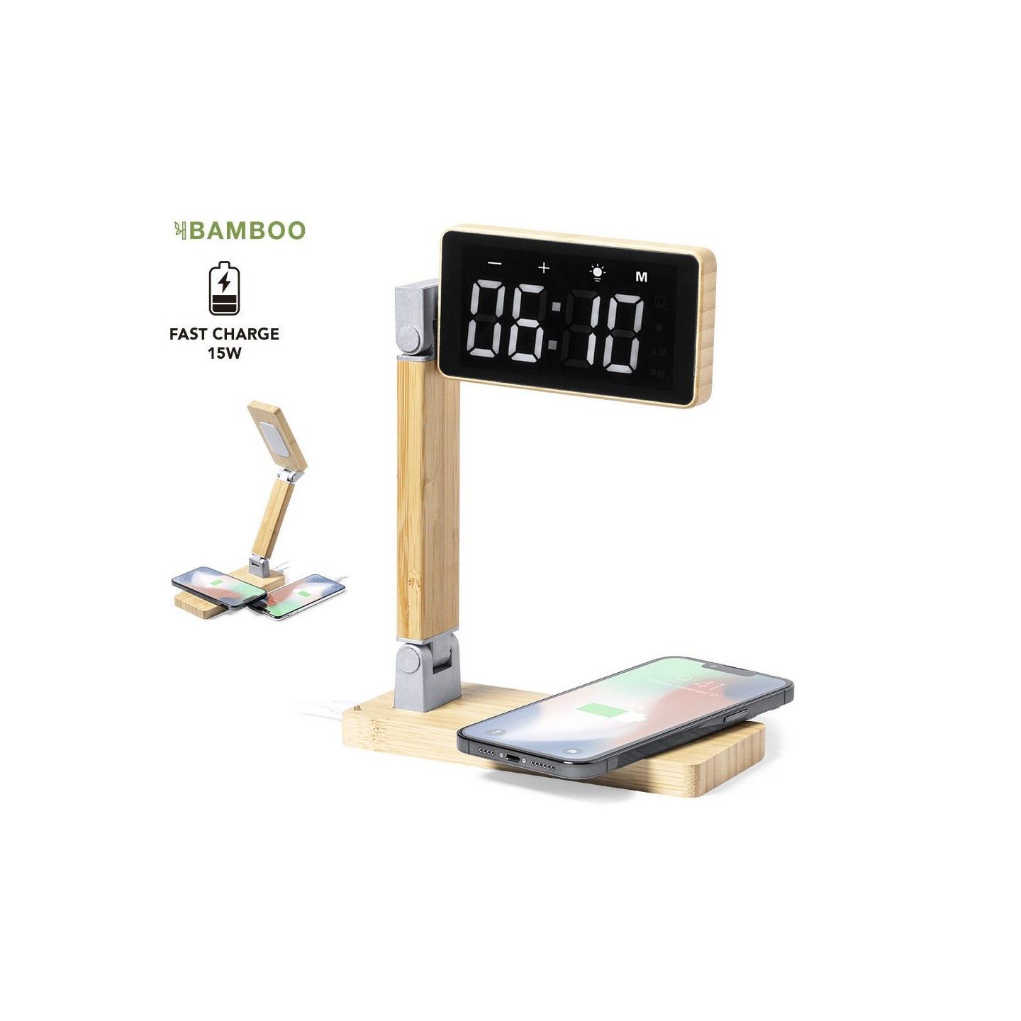 Reloj multifunción Edres con pantalla táctil retroiluminada, cargador inalámbrico 15W, lámpara LED ajustable y diseño plegable en bambú.