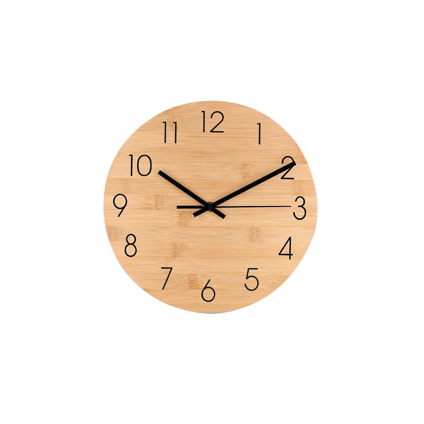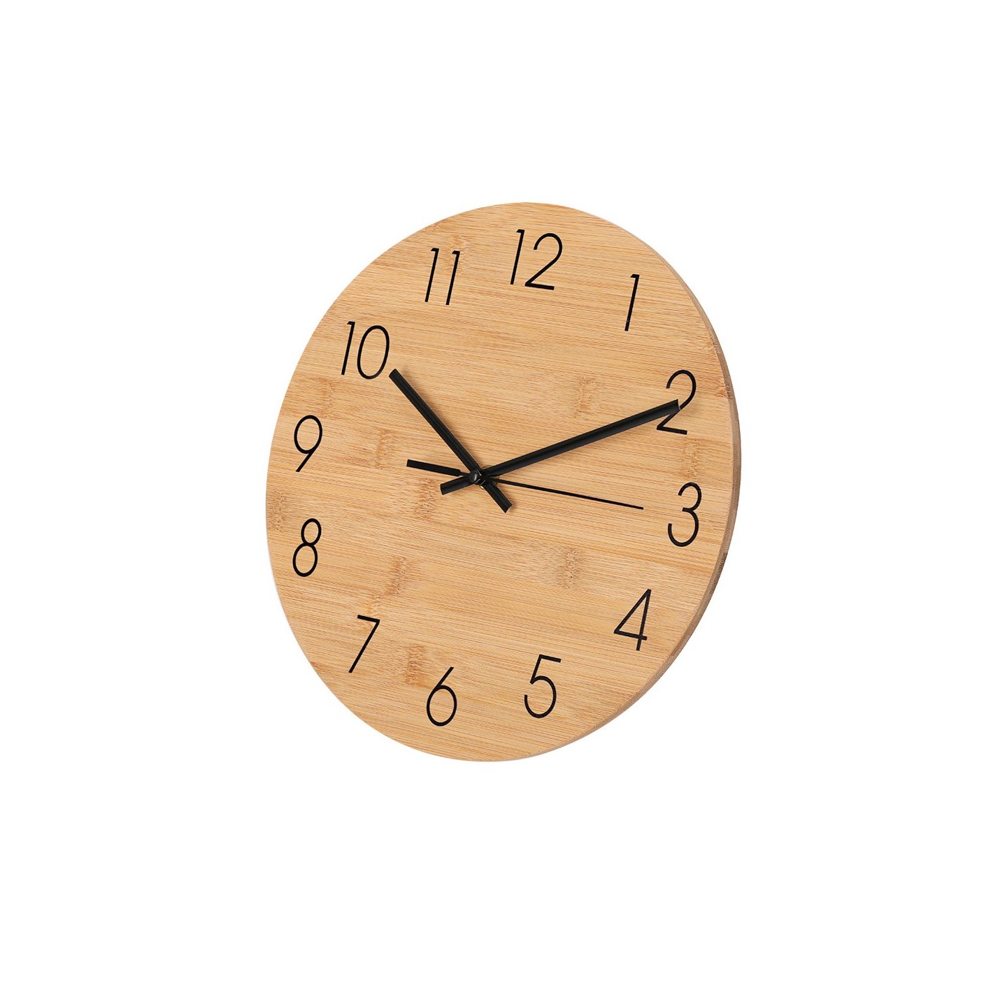 Reloj de pared en bambú natural con diseño moderno y números metálicos en negro. Personalizable con tu logotipo, ideal como regalo promocional sostenible.