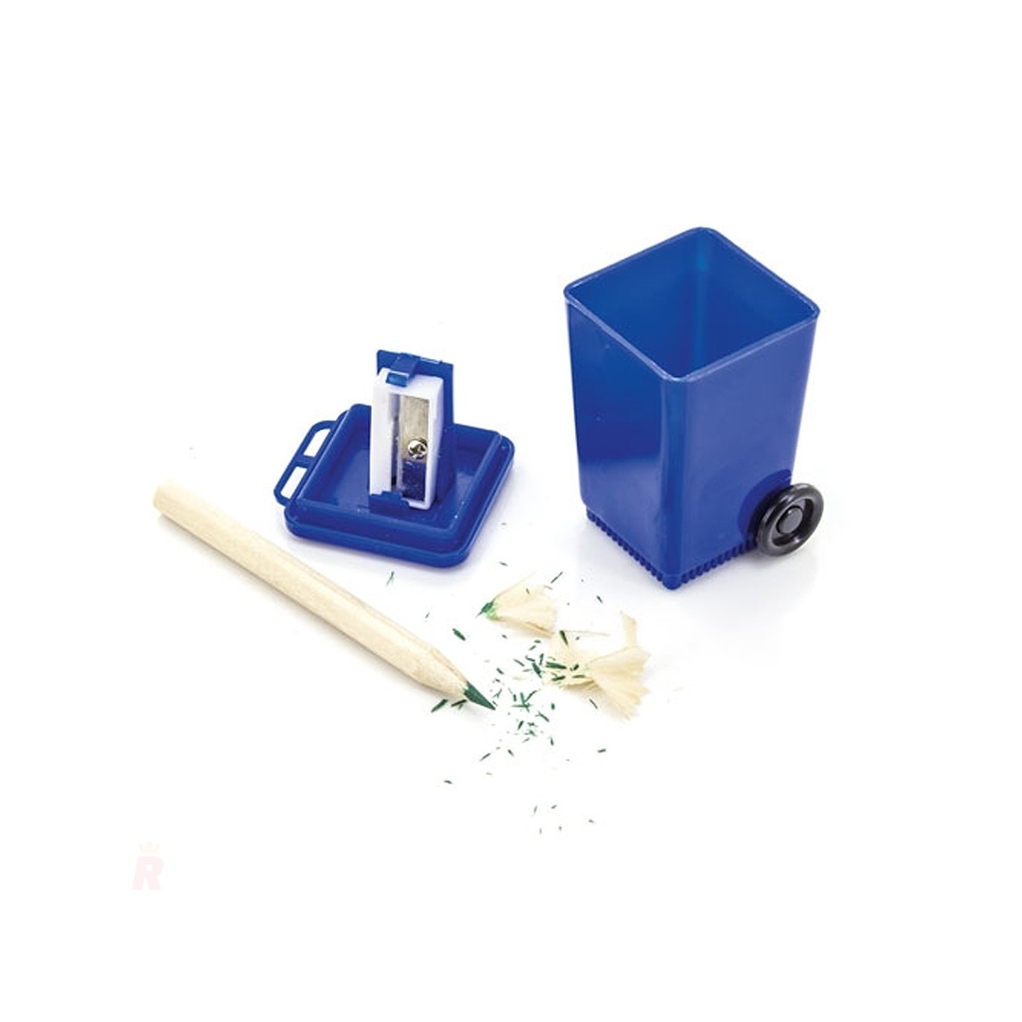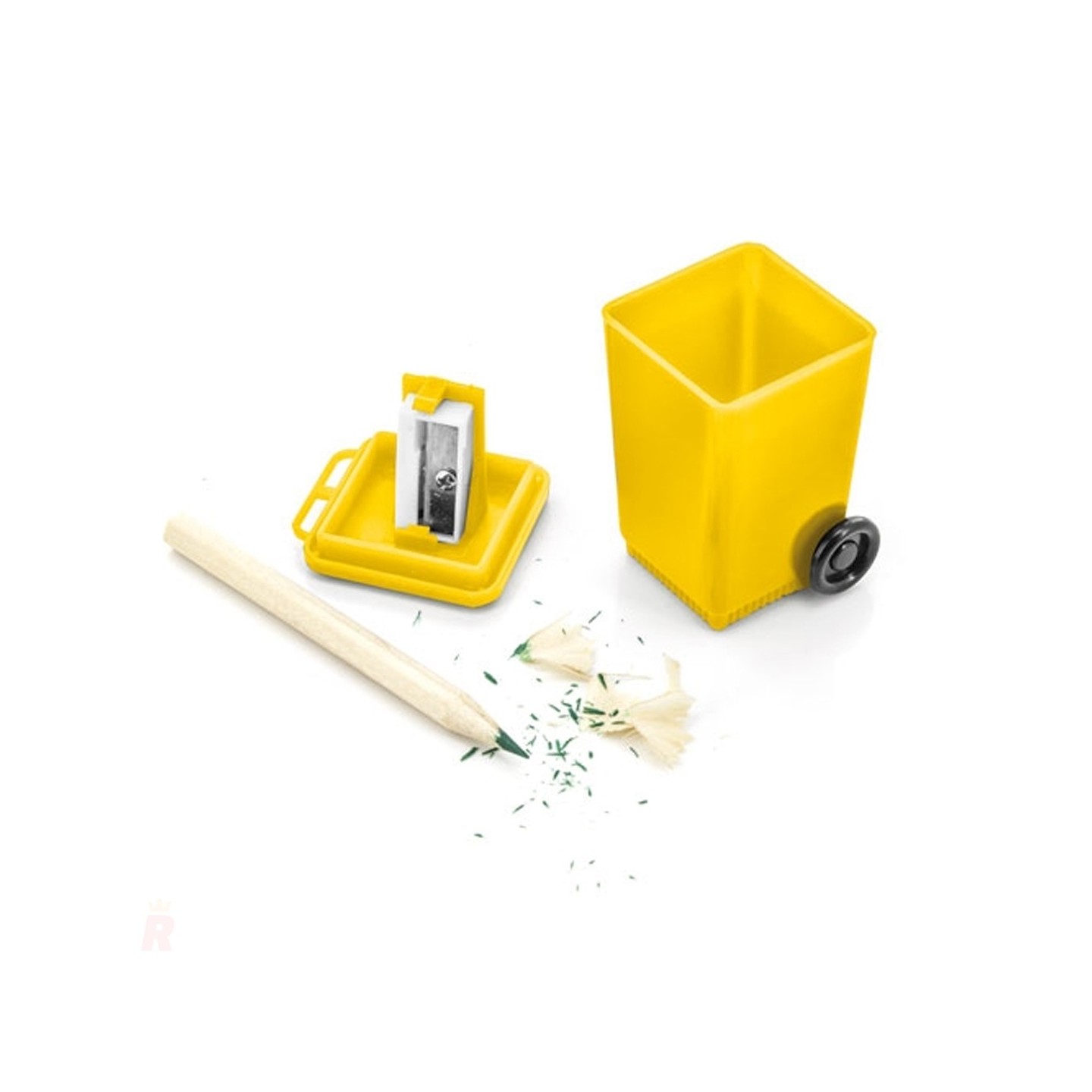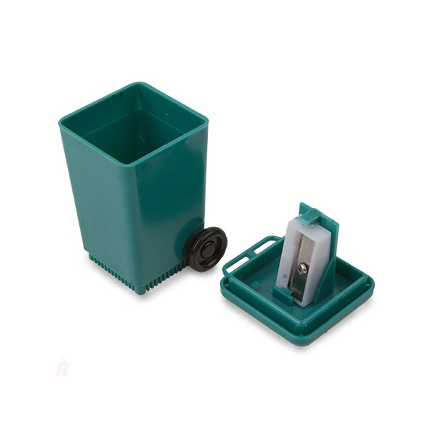 Sacapuntas con diseño de contenedor de basura, disponible en amarillo, azul royal y verde. Ideal para regalos promocionales personalizados con logotipo de empresa