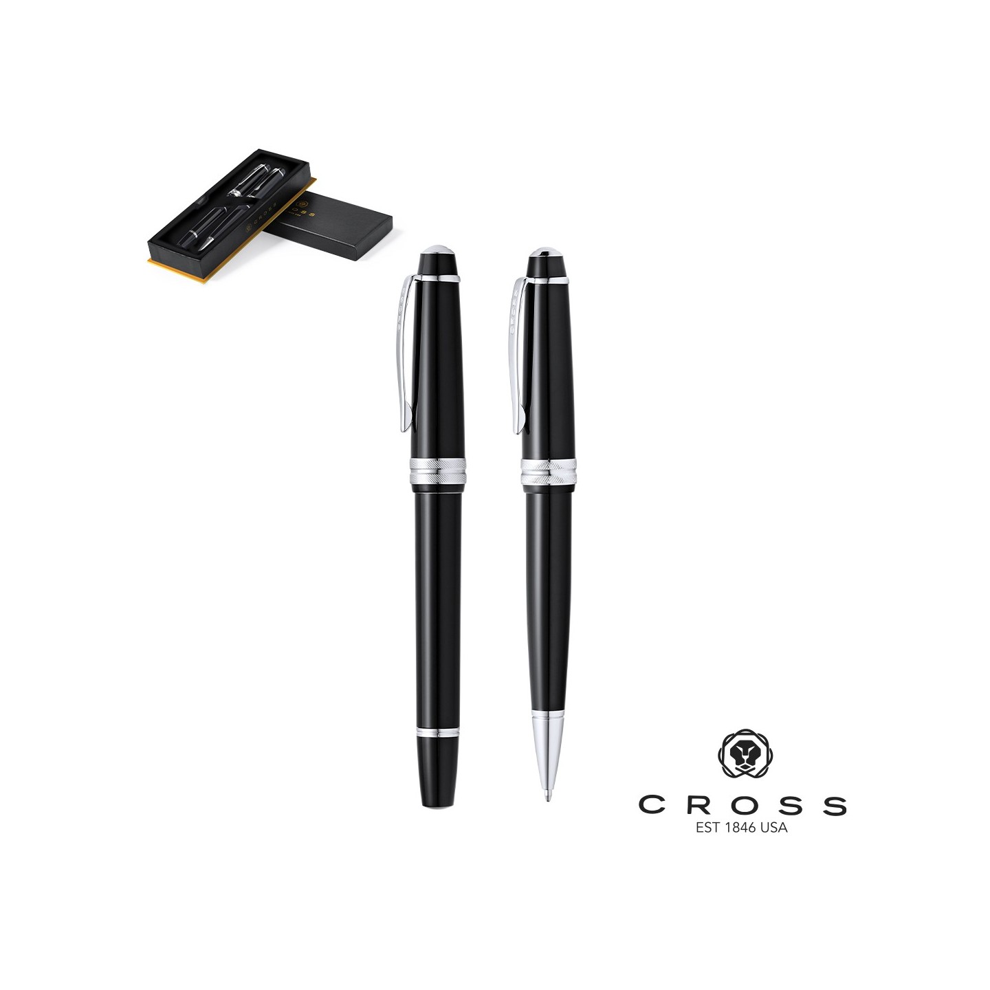 El set Bailey Light incluye bolígrafo y roller de Cross con acabados metálicos y estuche negro. Ideal para regalos corporativos y merchandising personalizado.