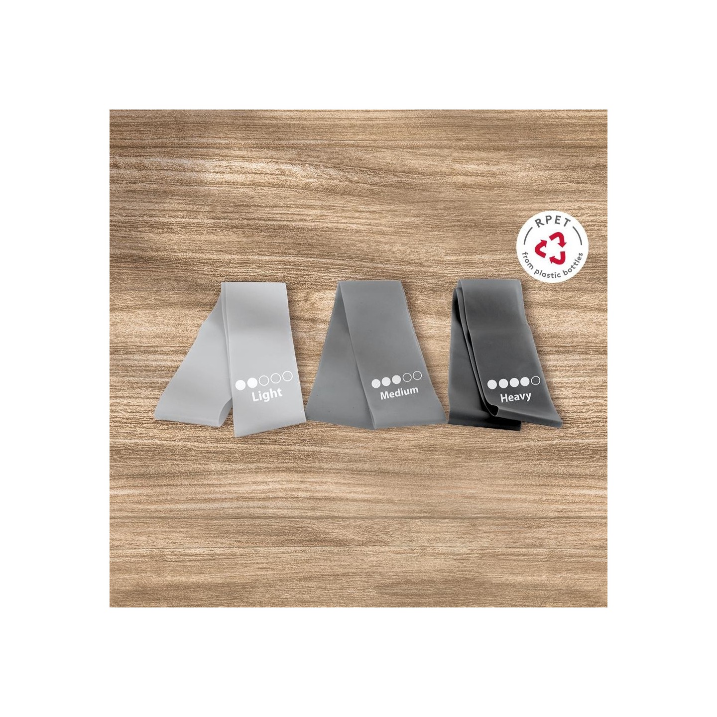 Las medidas de las bandas, 30 x 5 cm, garantizan la adaptabilidad a diferentes ejercicios y niveles de resistencia. Presentado con estilo, el set viene en una bolsa de poliéster RPET con cierre de ajuste, brindándote la conveniencia de llevar tus bandas a donde vayas. La bolsa mide 12 x 19 cm, proporcionando un almacenamiento compacto y ordenado.