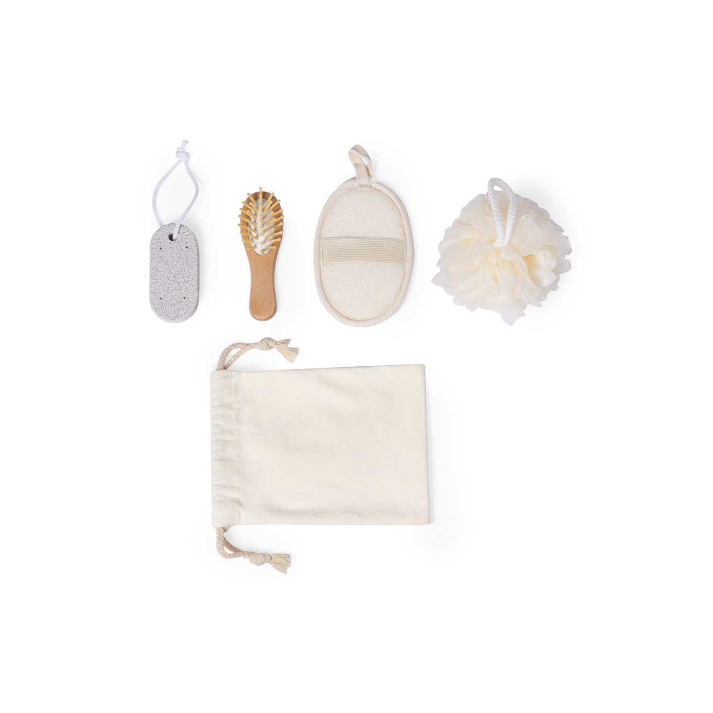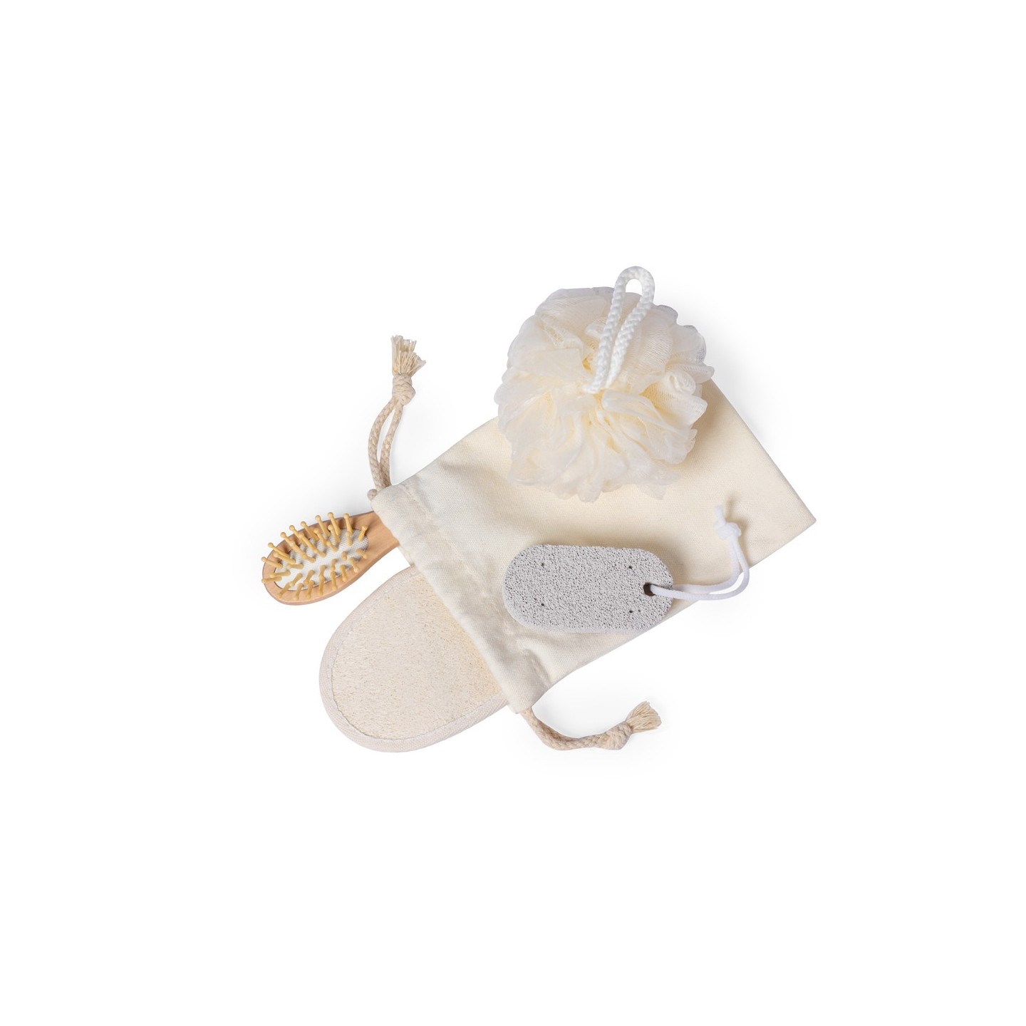 El Set Baño Seido consta de cuatro elementos esenciales, presentados de manera elegante en una práctica bolsa de algodón con cierre automático. Esta bolsa no solo proporciona comodidad en el almacenamiento, sino que también agrega un toque de sofisticación a la rutina diaria de cuidado personal.