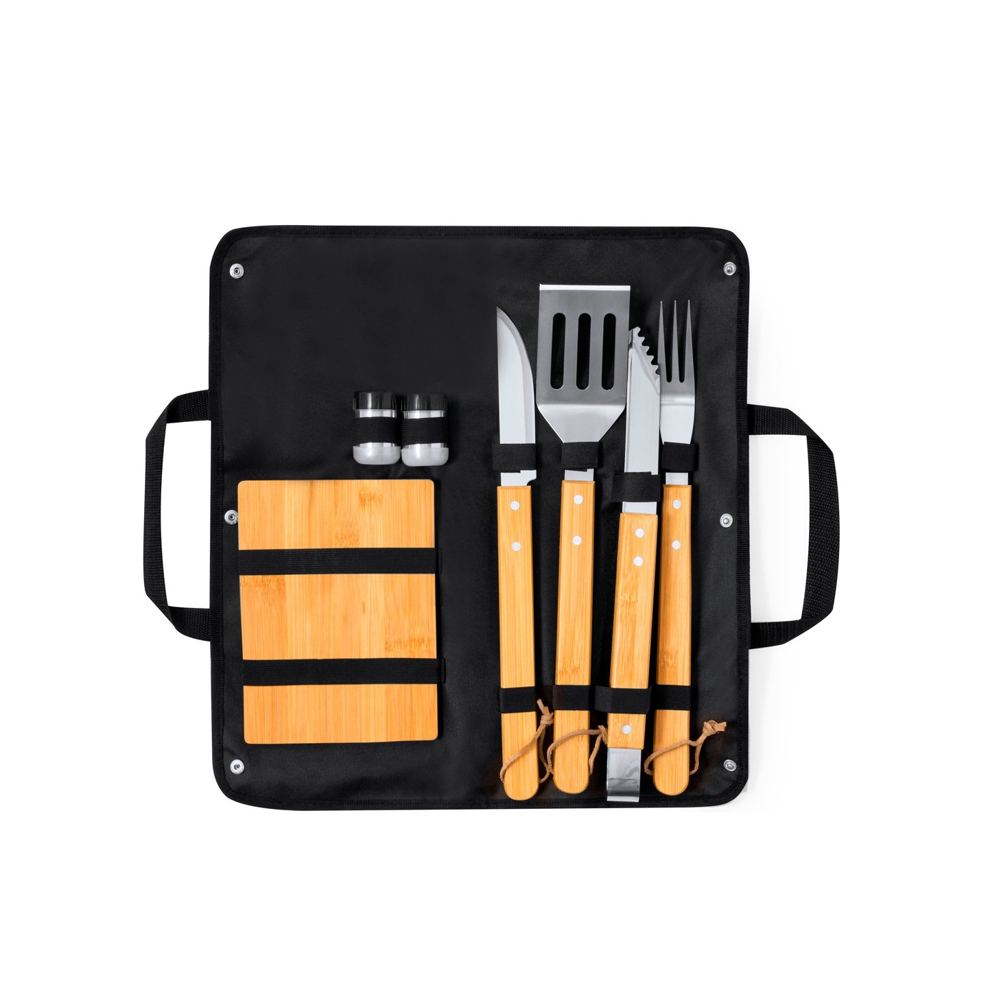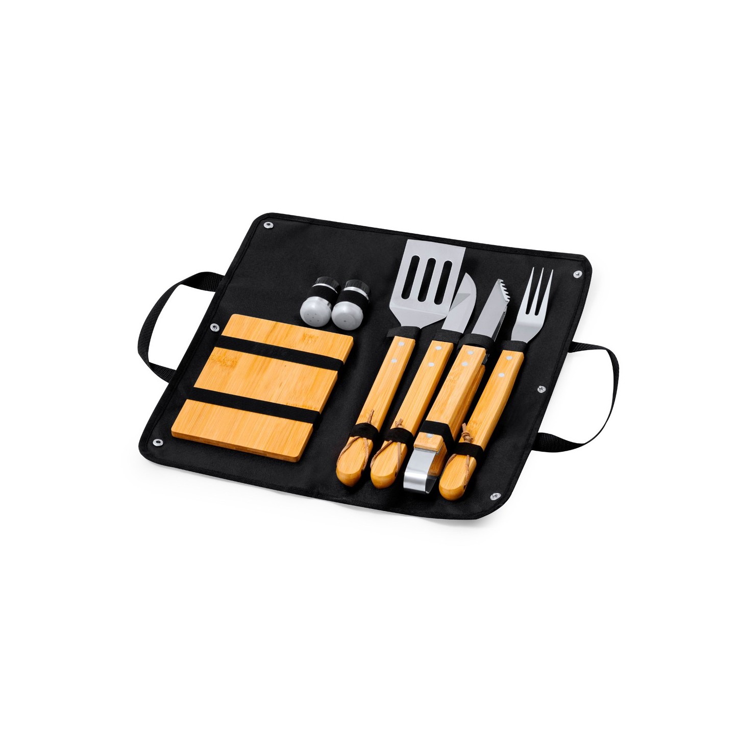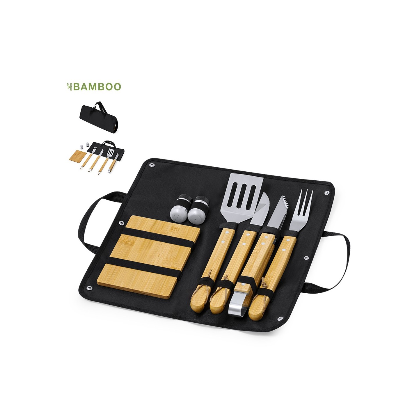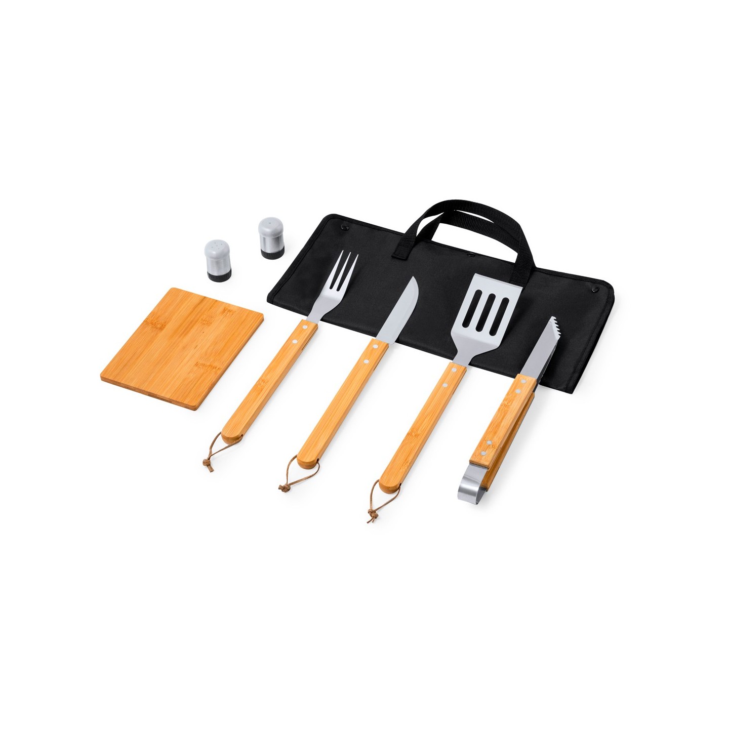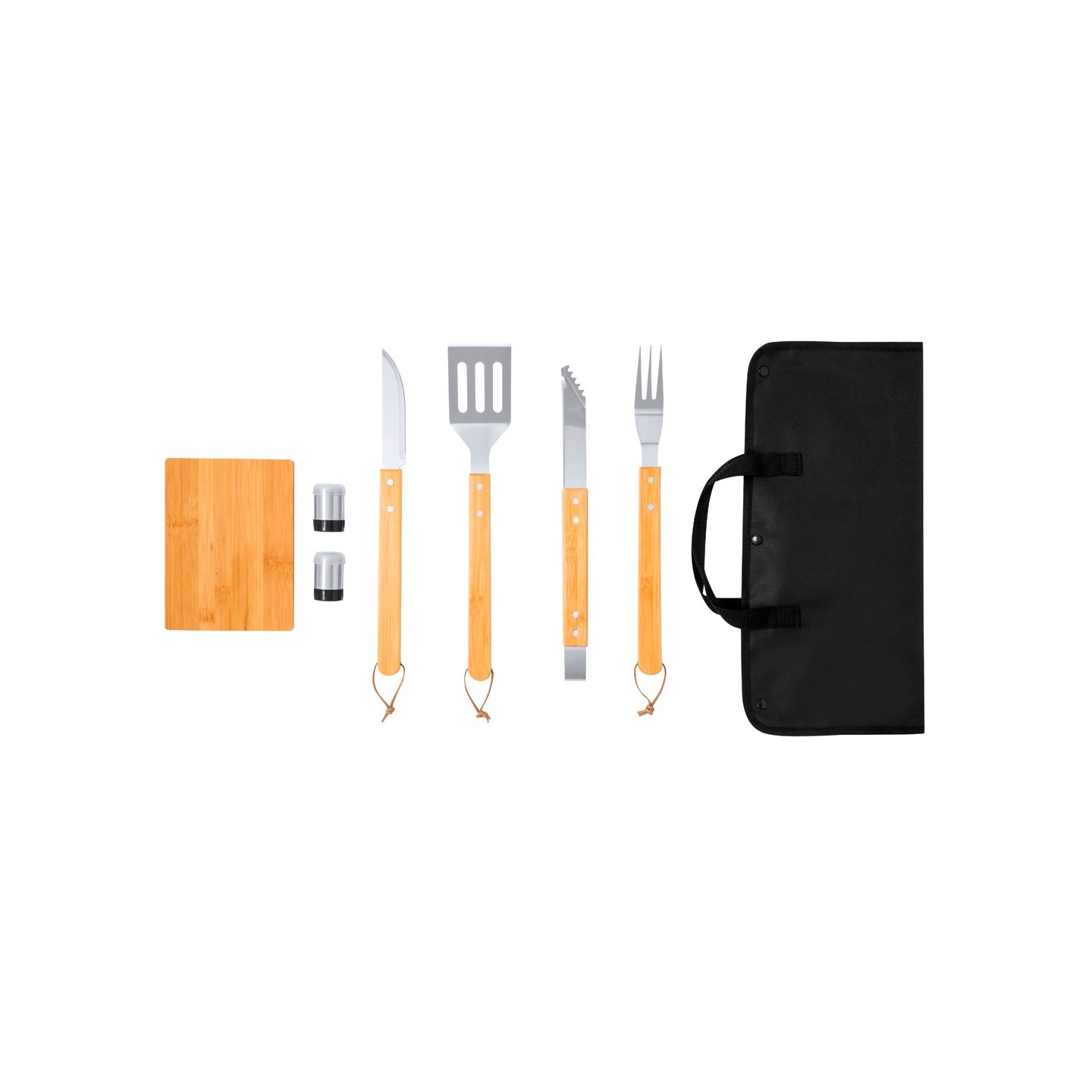 El set incluye 7 accesorios esenciales para la barbacoa, todos con mangos de bambú para un agarre cómodo y seguro. Entre los accesorios se encuentran un cuchillo, un trinchador, pinzas, una espátula, un salero y un pimentero.