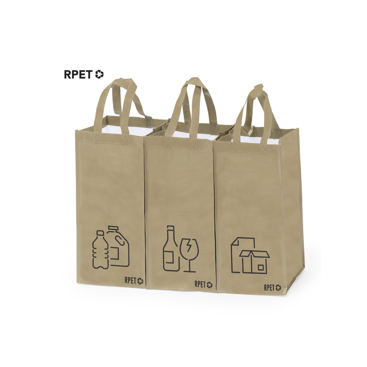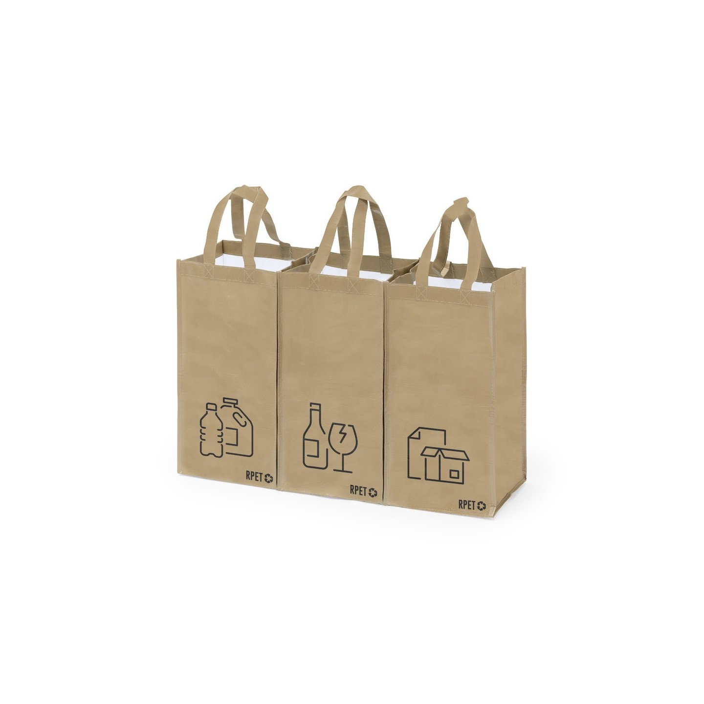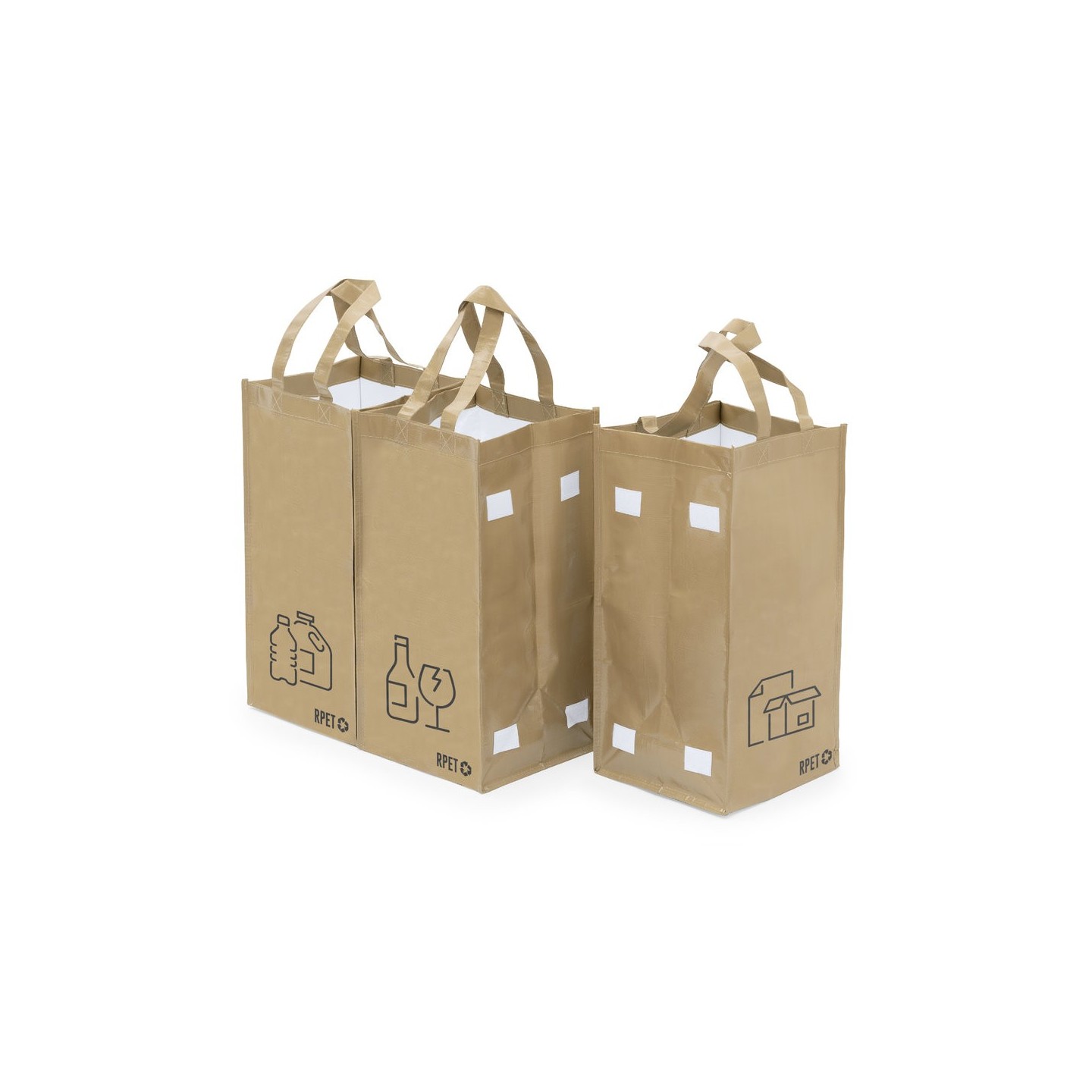 Set de 3 bolsas de reciclaje para contribuir con el medio ambiente. Fabricadas en poliéster RPET laminado, con asas reforzadas y distintivo RPET en la base. Velcros laterales para unirlas y separar los residuos: plásticos, envases de vidrio y papel. Medidas: 23x45x23 cm.