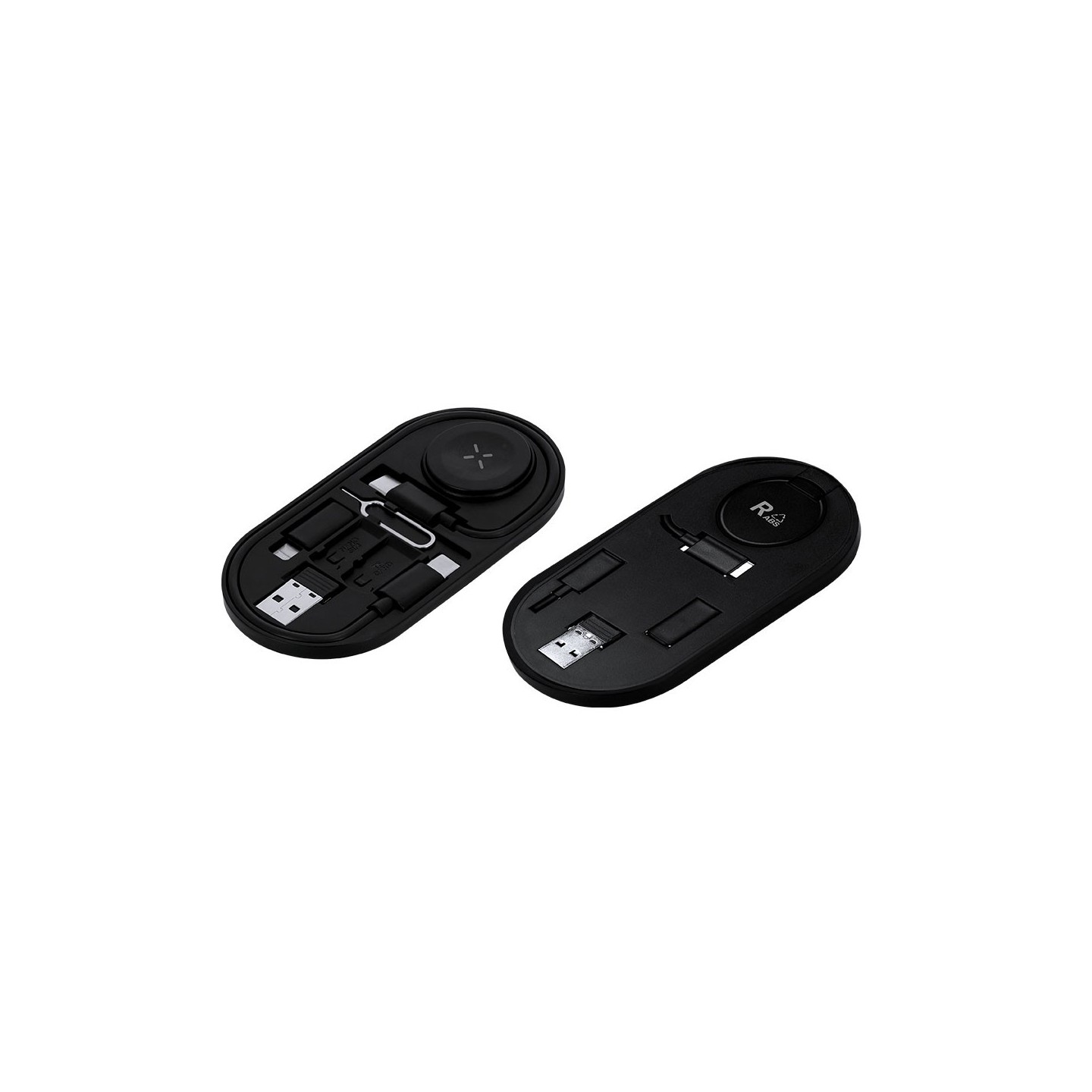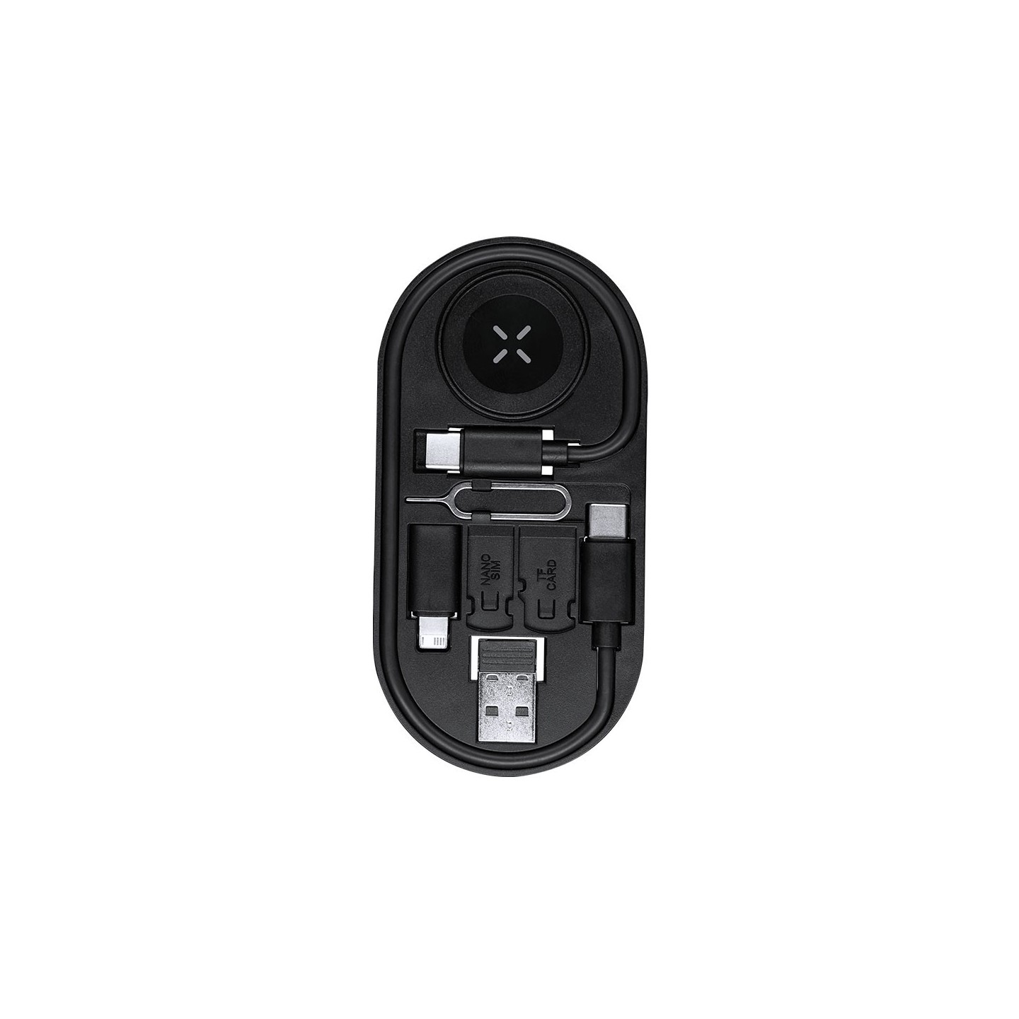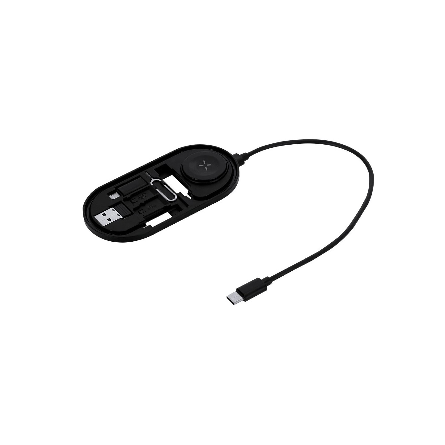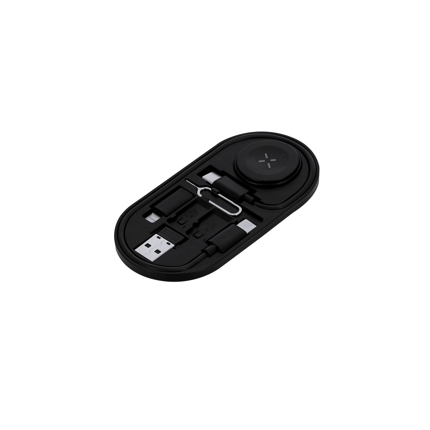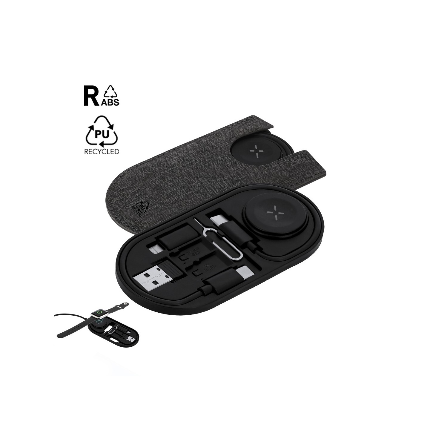 Set de cables cargadores NEBREX en ABS reciclado, incluye carga inalámbrica para smartwatch, cable multifuncional y pin eyector de SIM. Personalizable con logotipo.