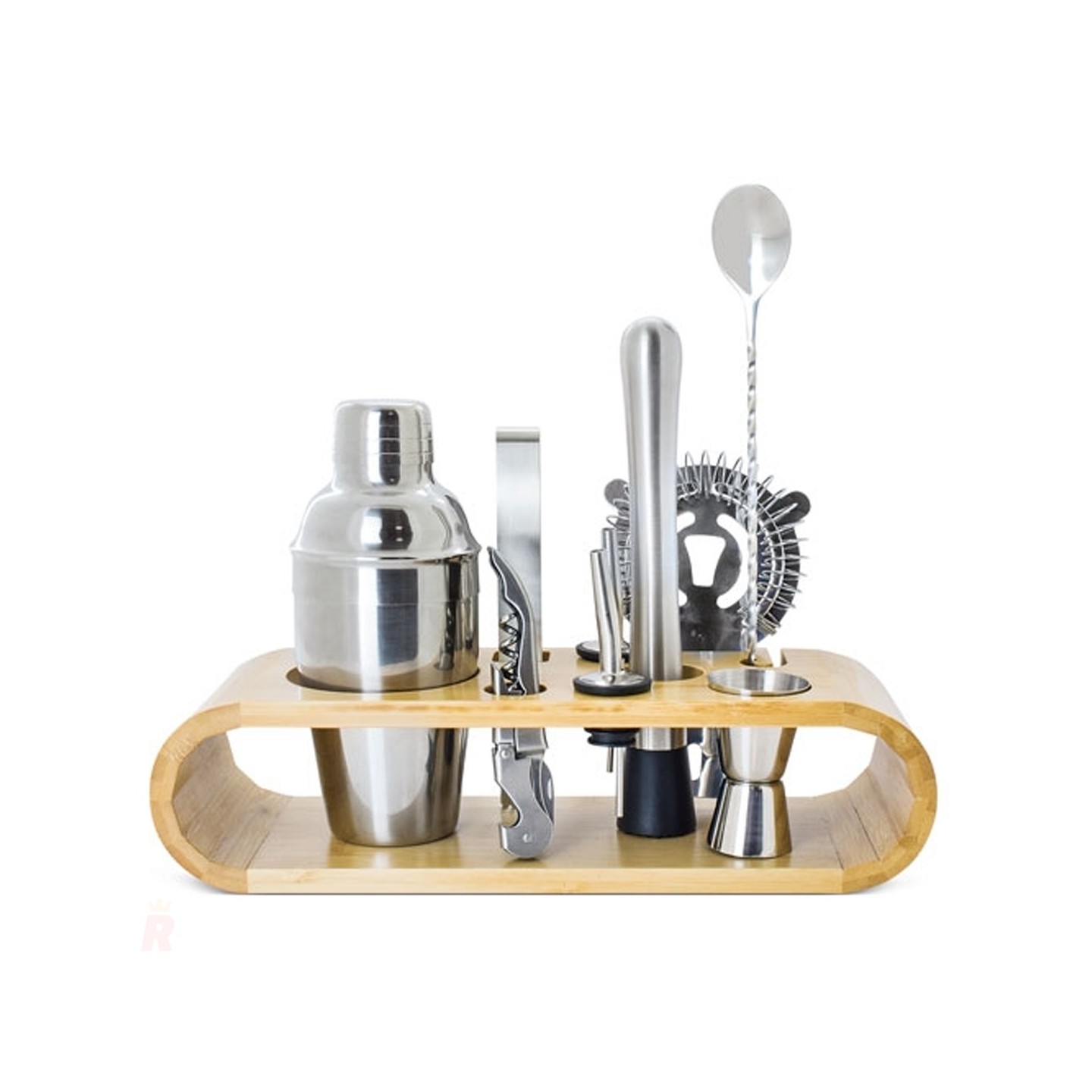 Set de coctelería profesional con base de bambú y piezas de acero inoxidable. Ideal como regalo promocional personalizado con logotipo para empresas