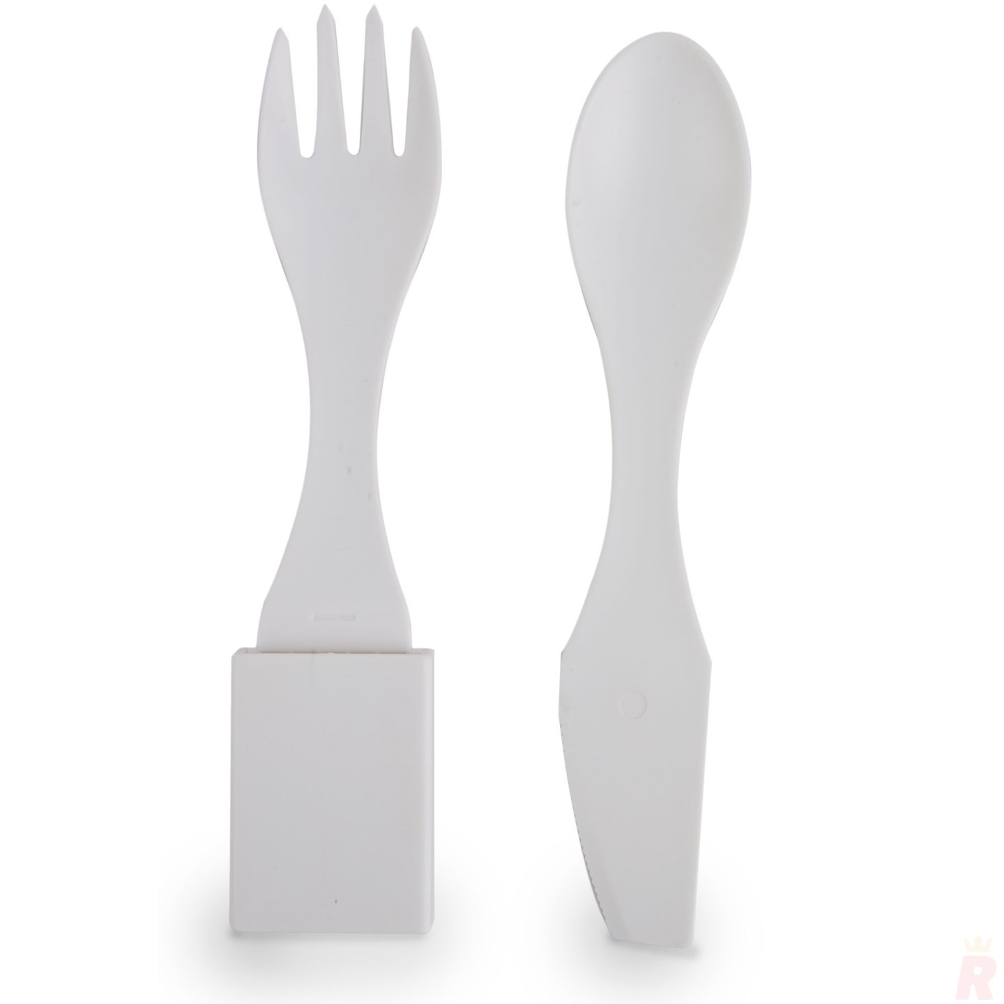 Set de cubiertos reutilizables fabricados en ABS libre de BPA. Incluye cuchillo, tenedor, cuchara, pinza ensaladera y abridor. Práctico y ecológico
