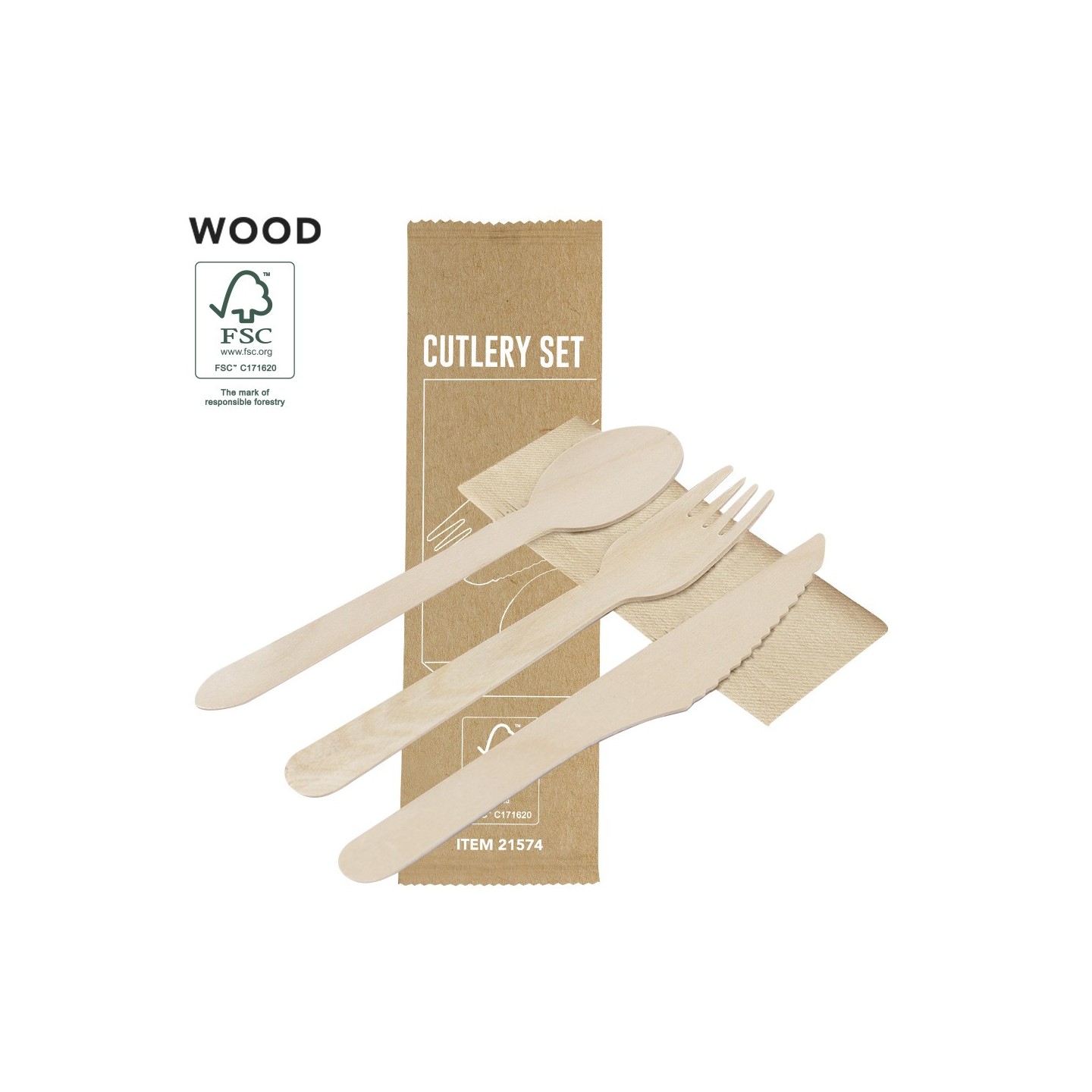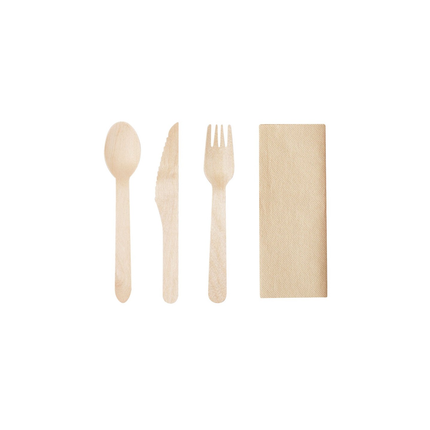 Set de cubiertos ecológicos 4 en 1 de madera natural con servilleta kraft. Personalizable con tu logotipo. Perfecto para promociones y eventos.