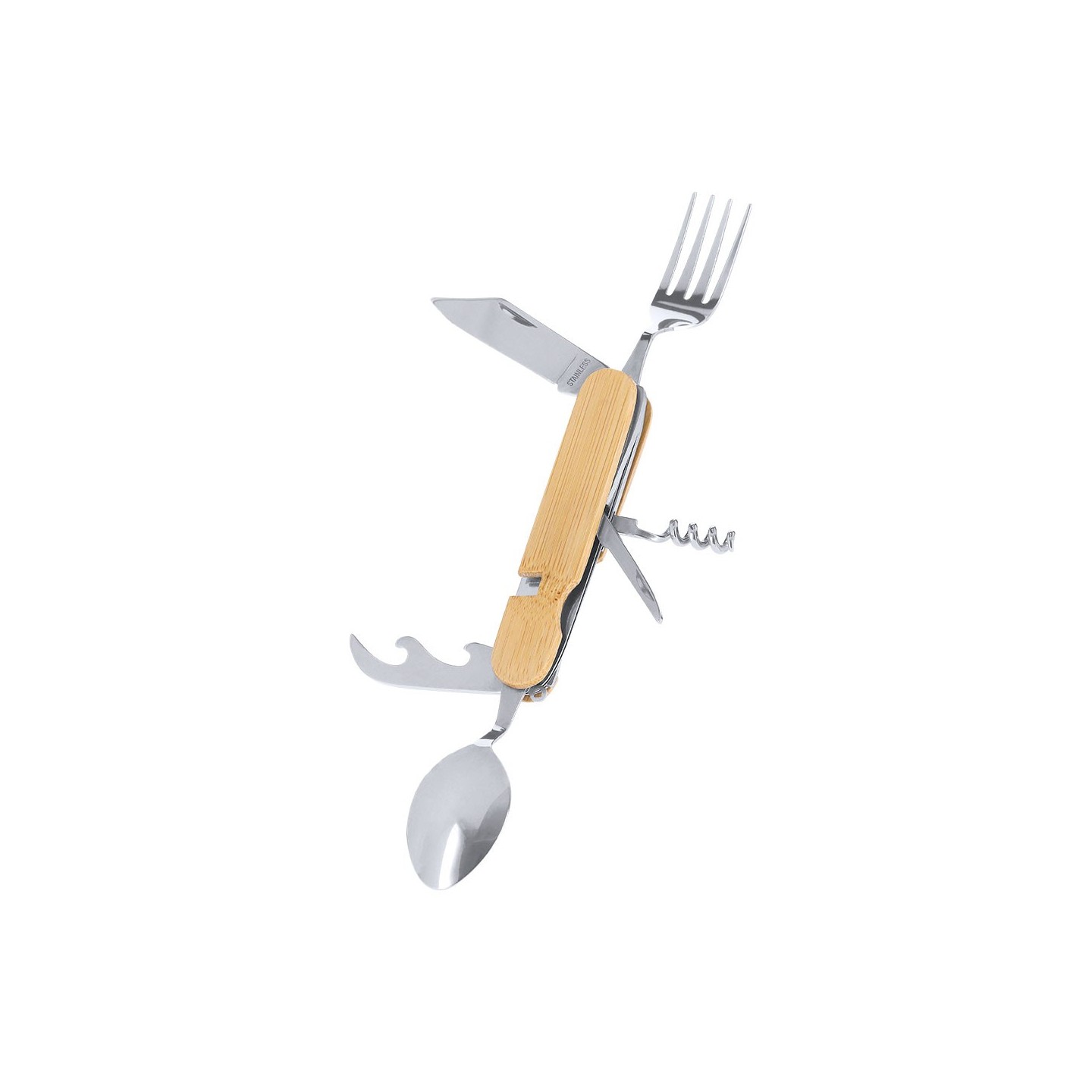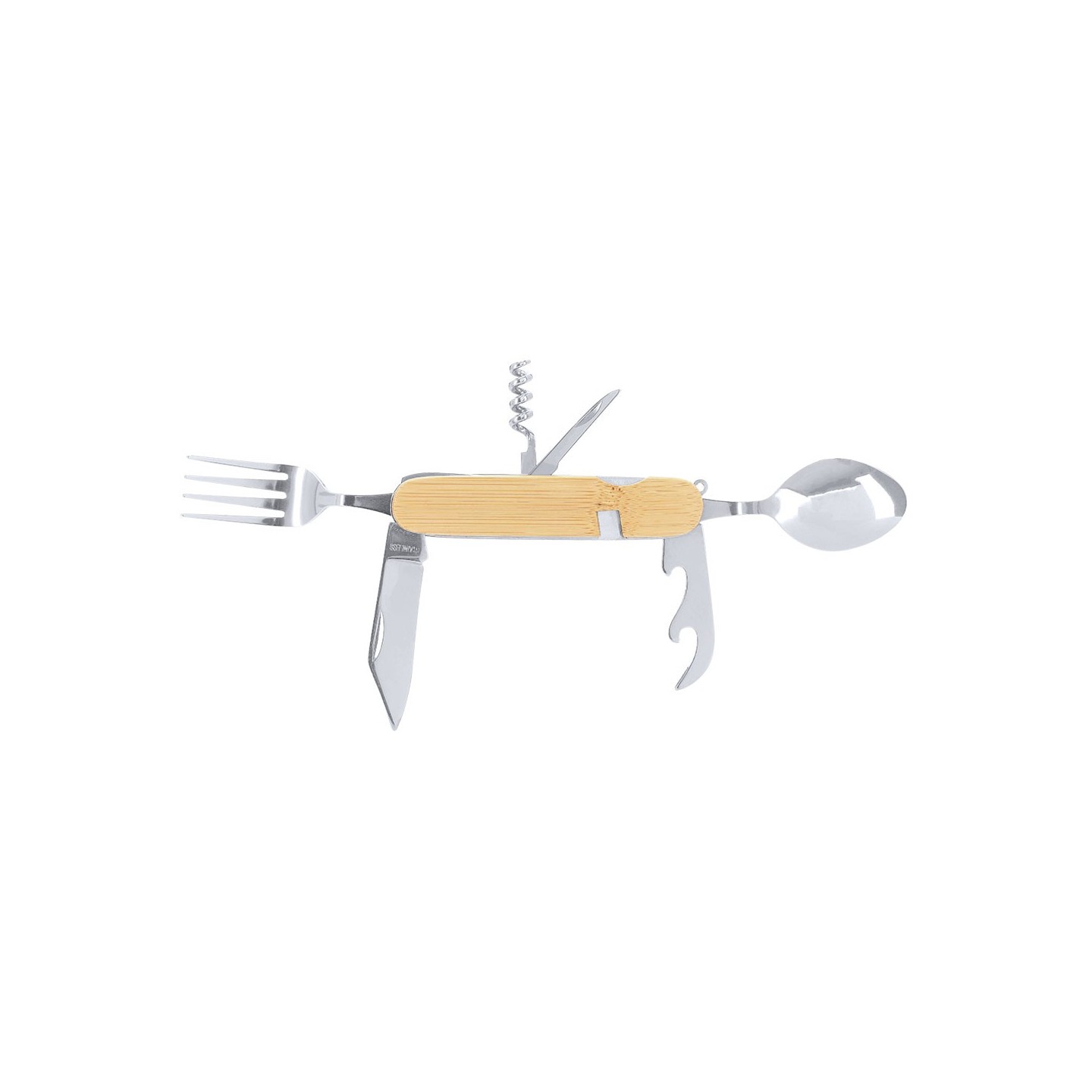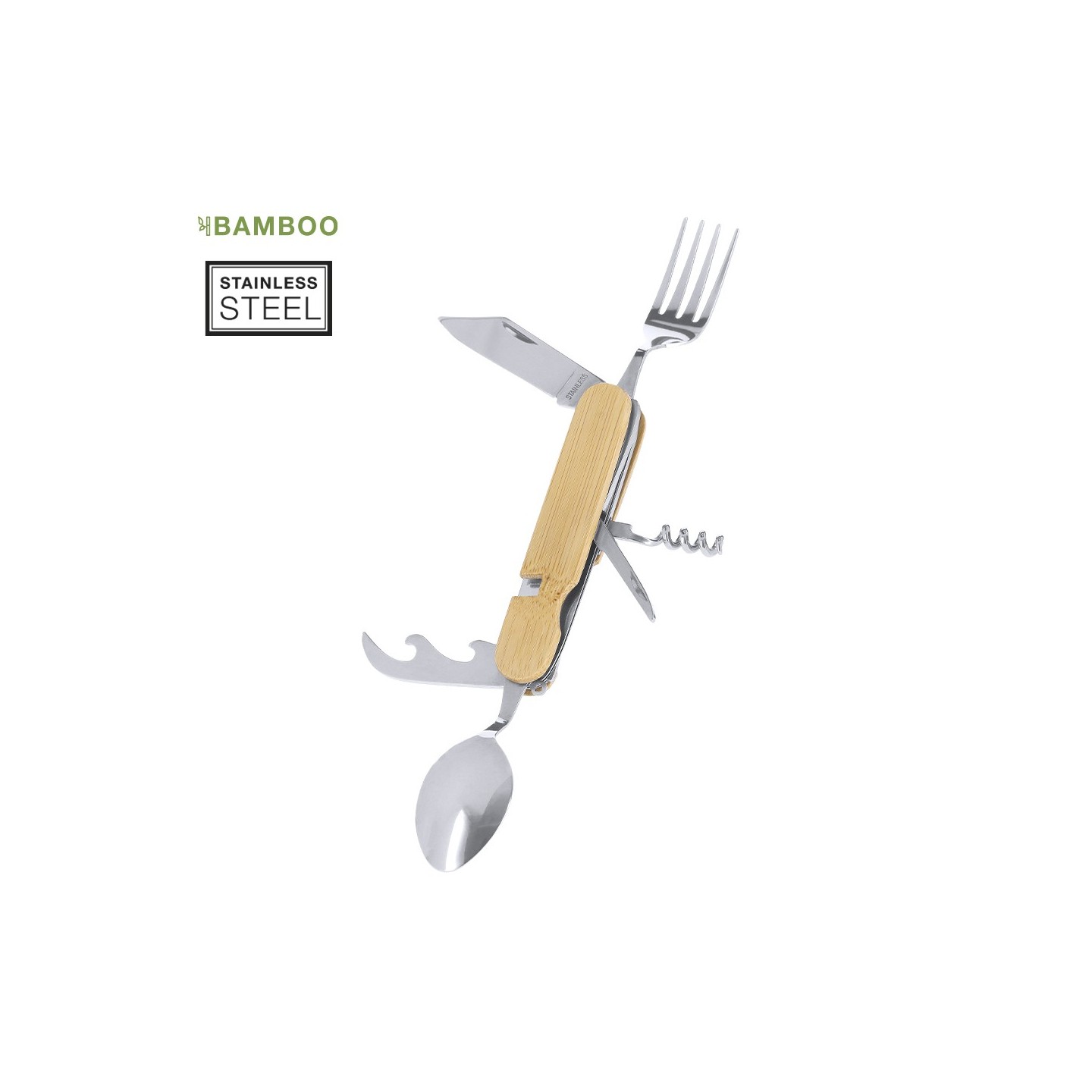 Set de cubiertos multifuncional de acero inoxidable y bambú, con 7 funciones. Personalizable con tu logotipo, ideal para empresas comprometidas con la sostenibilidad.