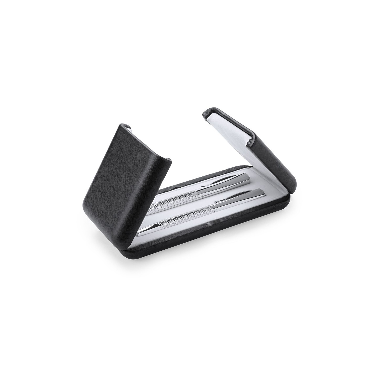 No te pierdas el set Darius, incluye bolígrafo y roller de diseño elegante en plateado brillante. Estuche de polipiel negro troquelado. ¡Regalos personalizados de sofisticación y estilo!