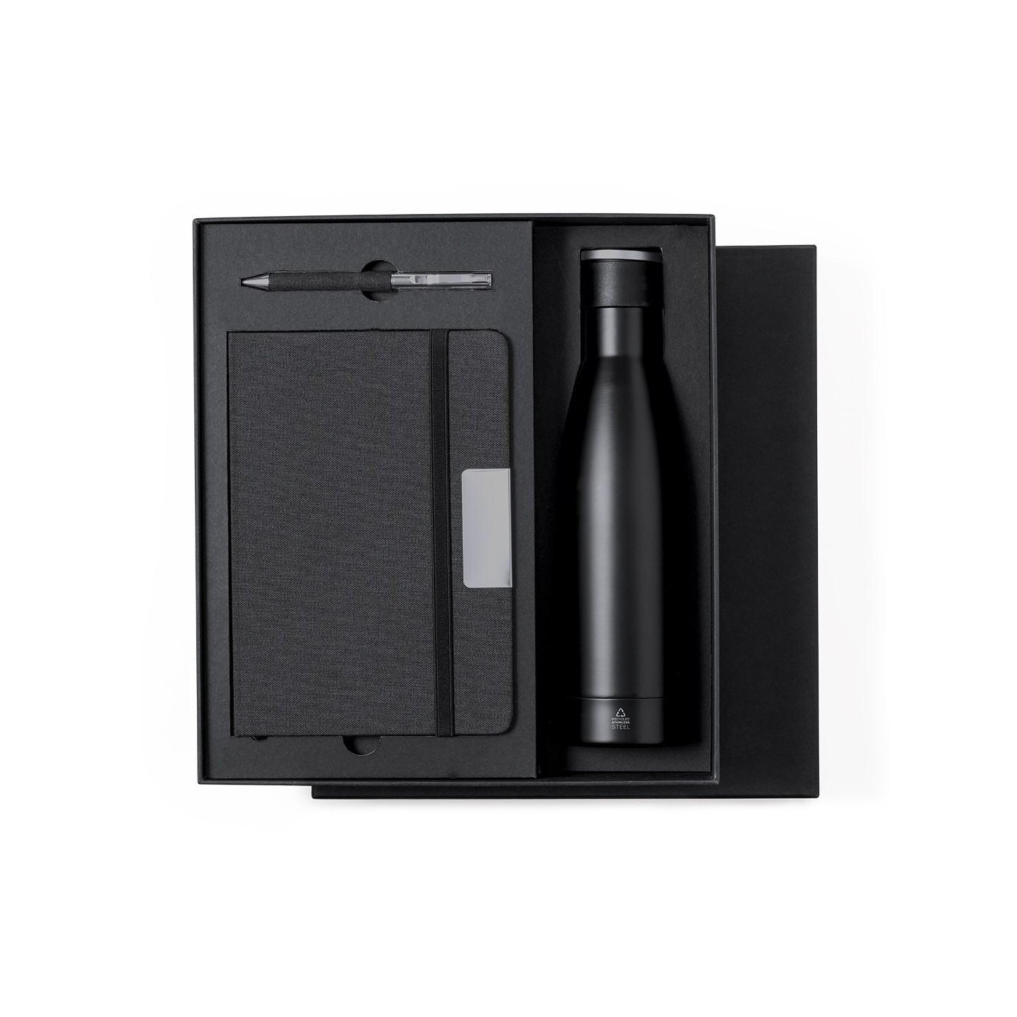 El Set Datiford incluye termo, bloc de notas y bolígrafo premium. Elegancia y funcionalidad en cada detalle, personalizable para regalos corporativos.