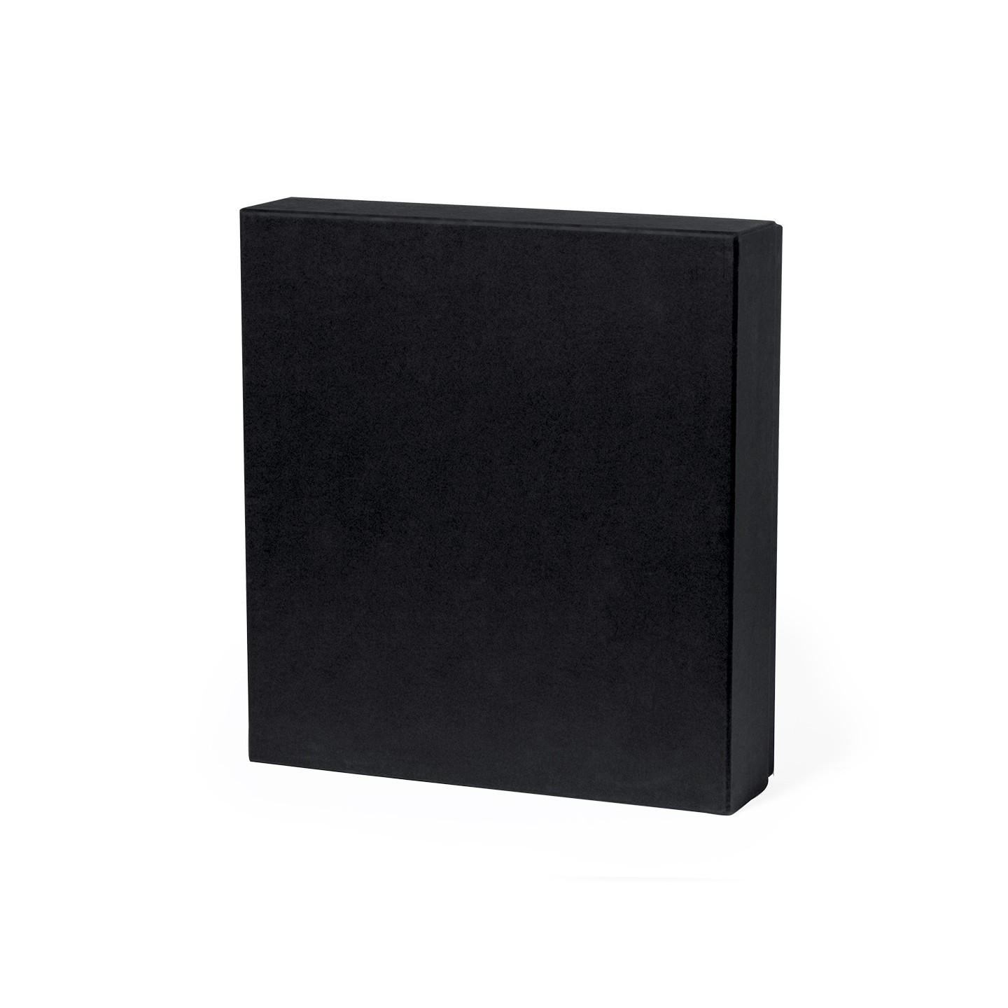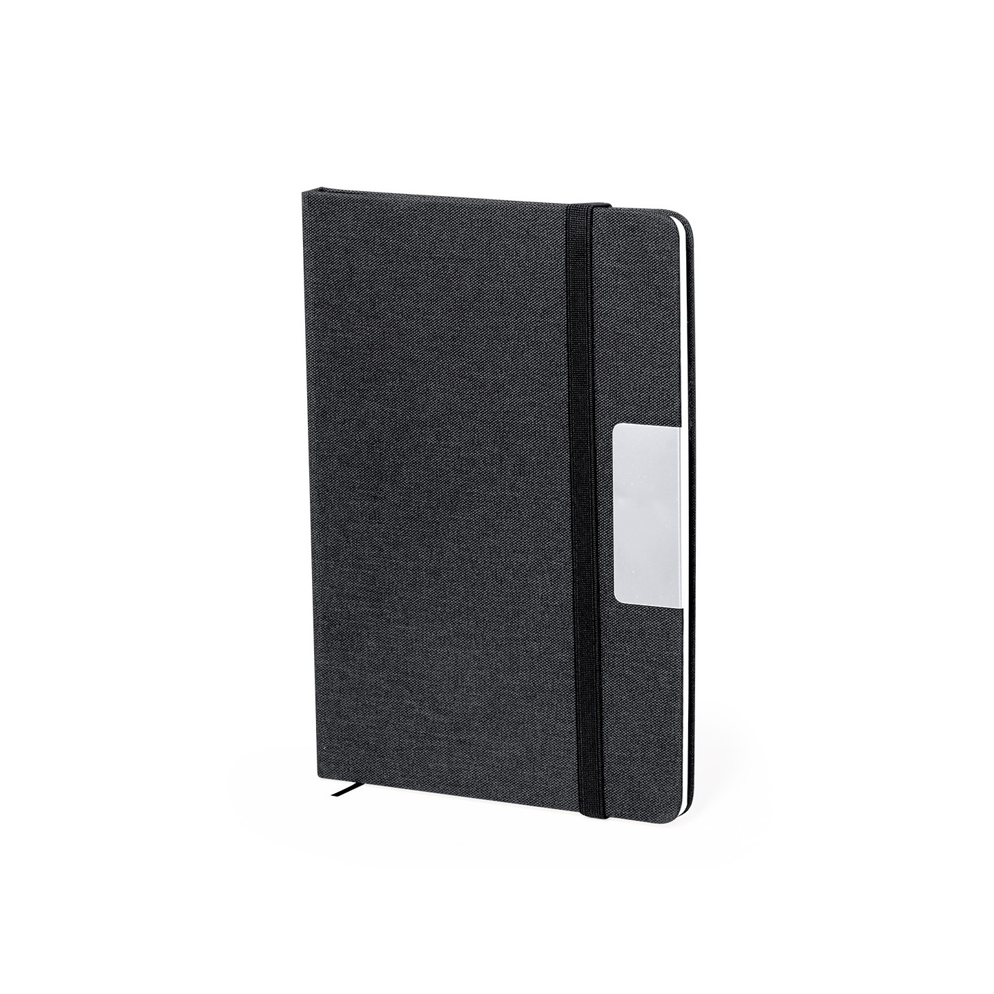 Acompañando al termo, encontramos un bloc de notas en Poliéster 300D RPET, en elegante color negro. Este bloc destaca por su detalle metálico especial para marcaje en láser, que permite personalizarlo con el logo de tu empresa de manera elegante y duradera. Con cierre elástico, portada rígida y marcapáginas de tela, este bloc ofrece 80 hojas de alta calidad para tomar notas o realizar bocetos.
