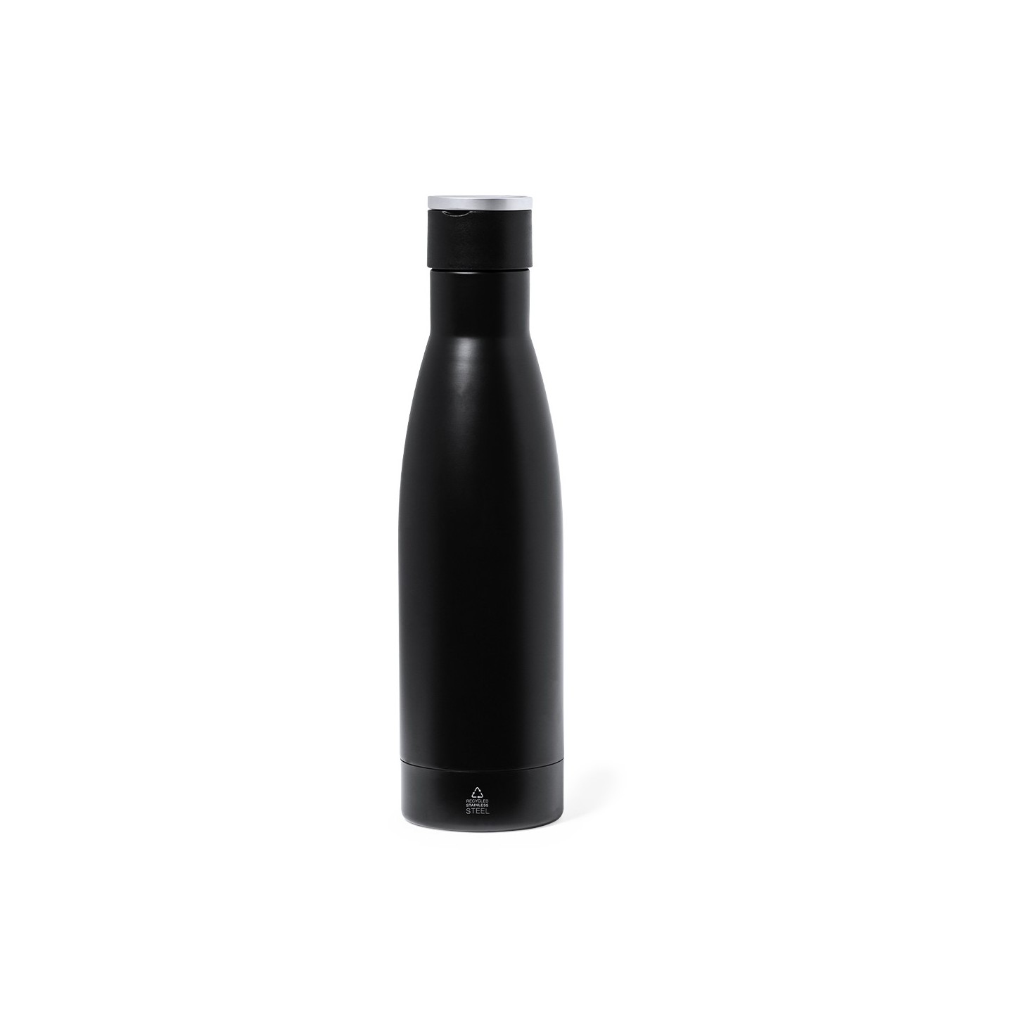 El termo de doble capa en Acero Inox Reciclado, con acabado negro mate, es el compañero ideal para mantener tus bebidas calientes o frías durante horas. Con una capacidad de 500 ml y un asa rígida de metal en color plata mate, este termo no solo es práctico sino también sofisticado. Además, su logotipo de acero inoxidable agrega un toque de distinción.