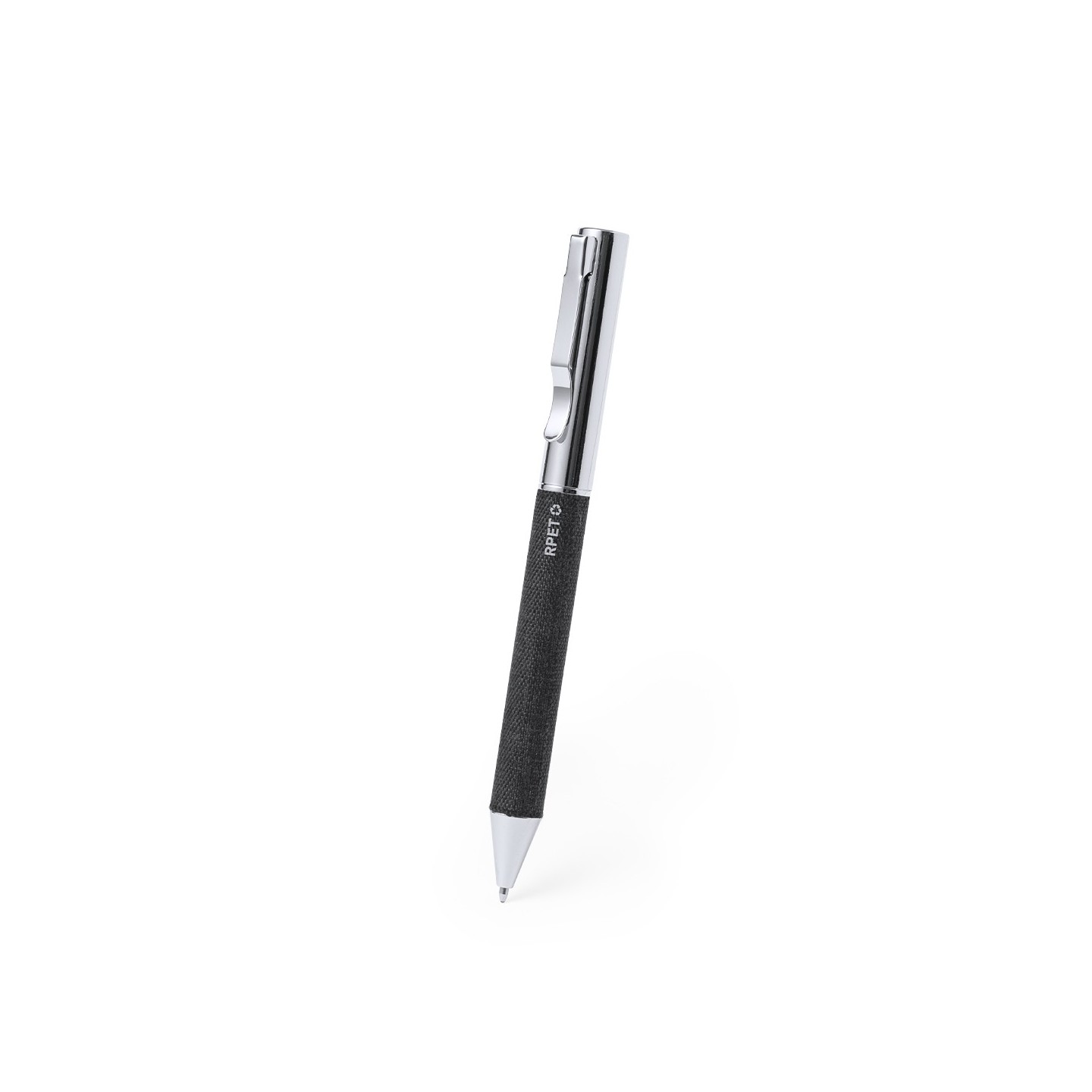 Completa este set el bolígrafo en Poliéster 300D RPET, con acabado negro mate y mecanismo giratorio. Su punta y clip en pulido metal añaden un toque de sofisticación, mientras que su tinta azul garantiza una escritura suave y fluida.