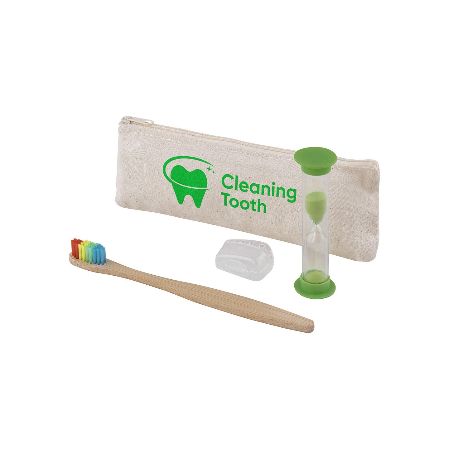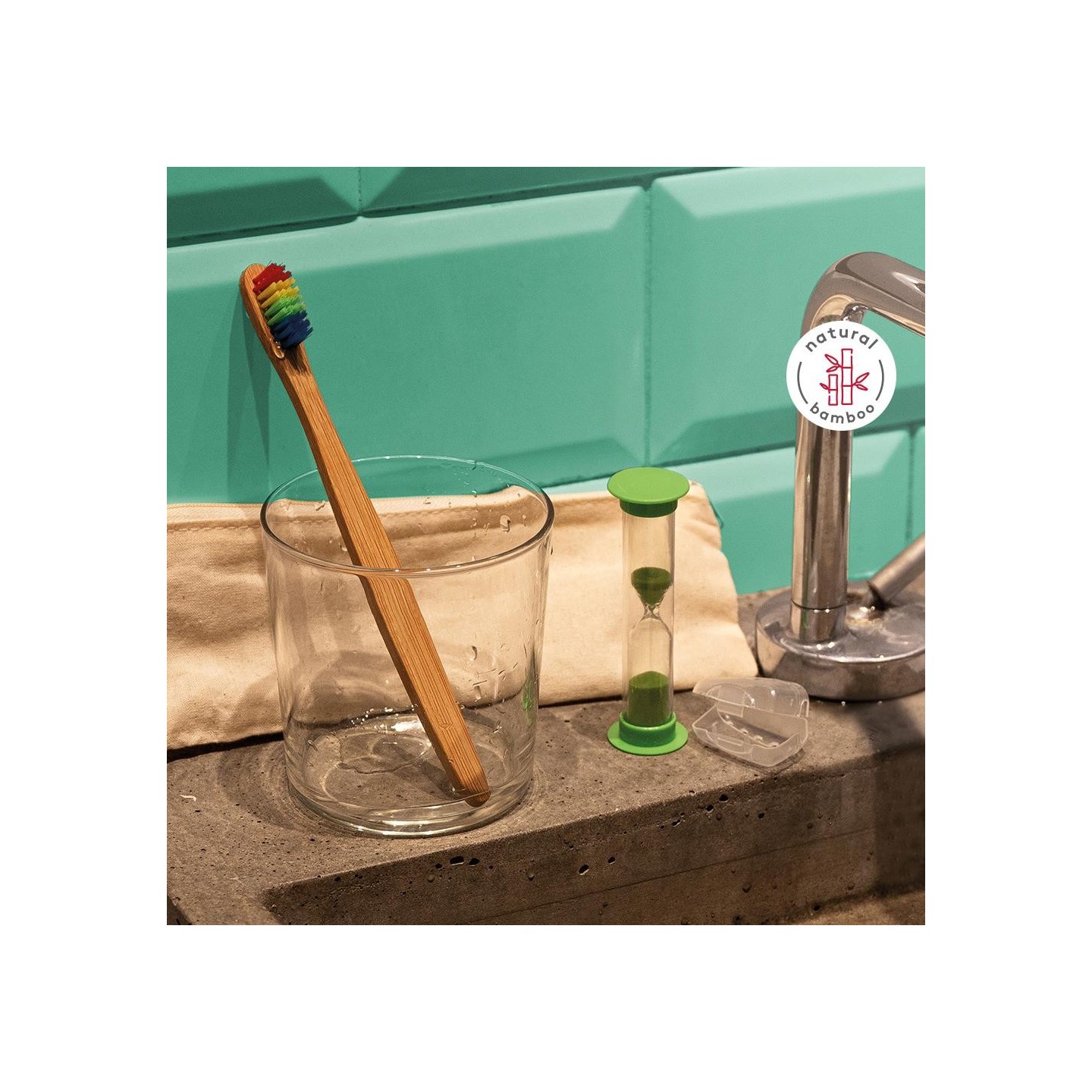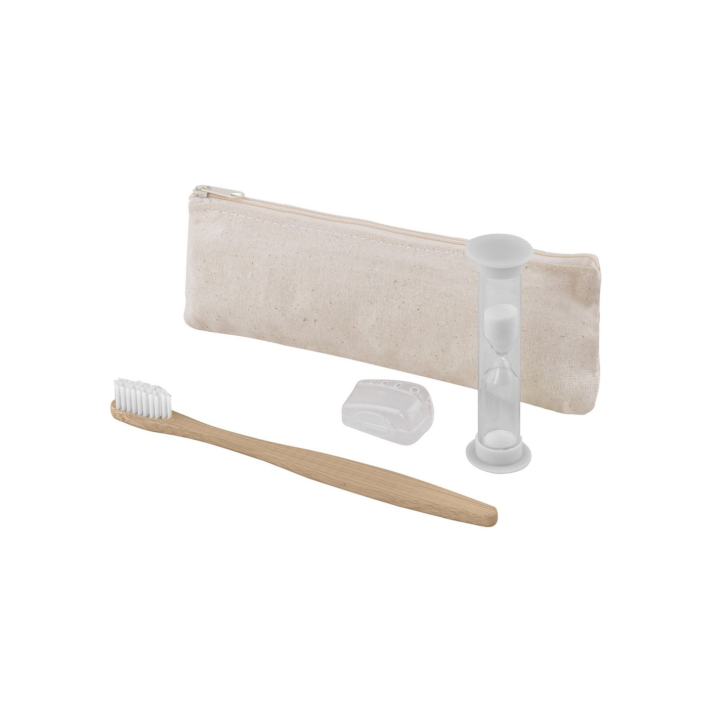 Este set incluye un estuche de algodón que contiene un cepillo de dientes fabricado en bambú natural y un reloj de arena de plástico. Con medidas de 20,5 x 7 cm para el estuche, 2 x 17,5 cm para el cepillo y un diámetro de 2,5 cm y una altura de 8,5 cm para el reloj de arena, este set ofrece todo lo necesario para mantener una sonrisa saludable y radiante.