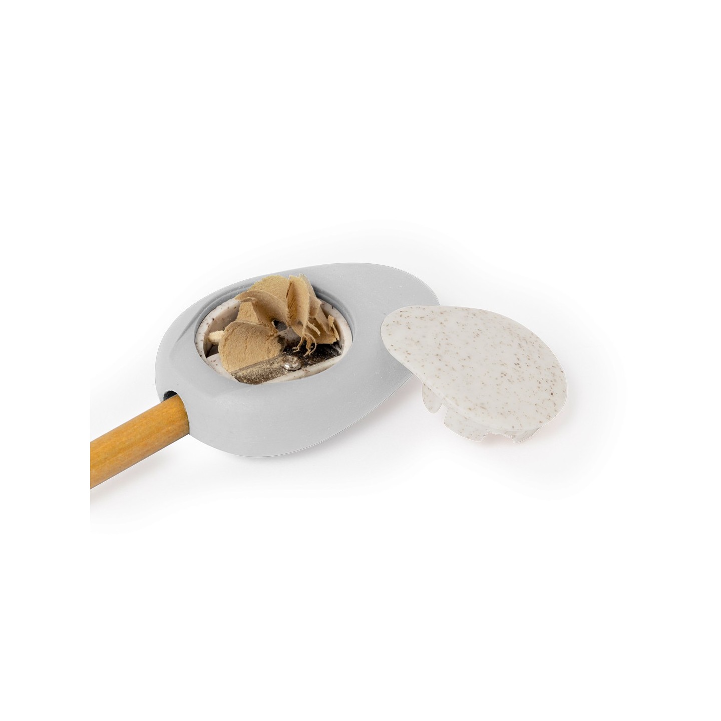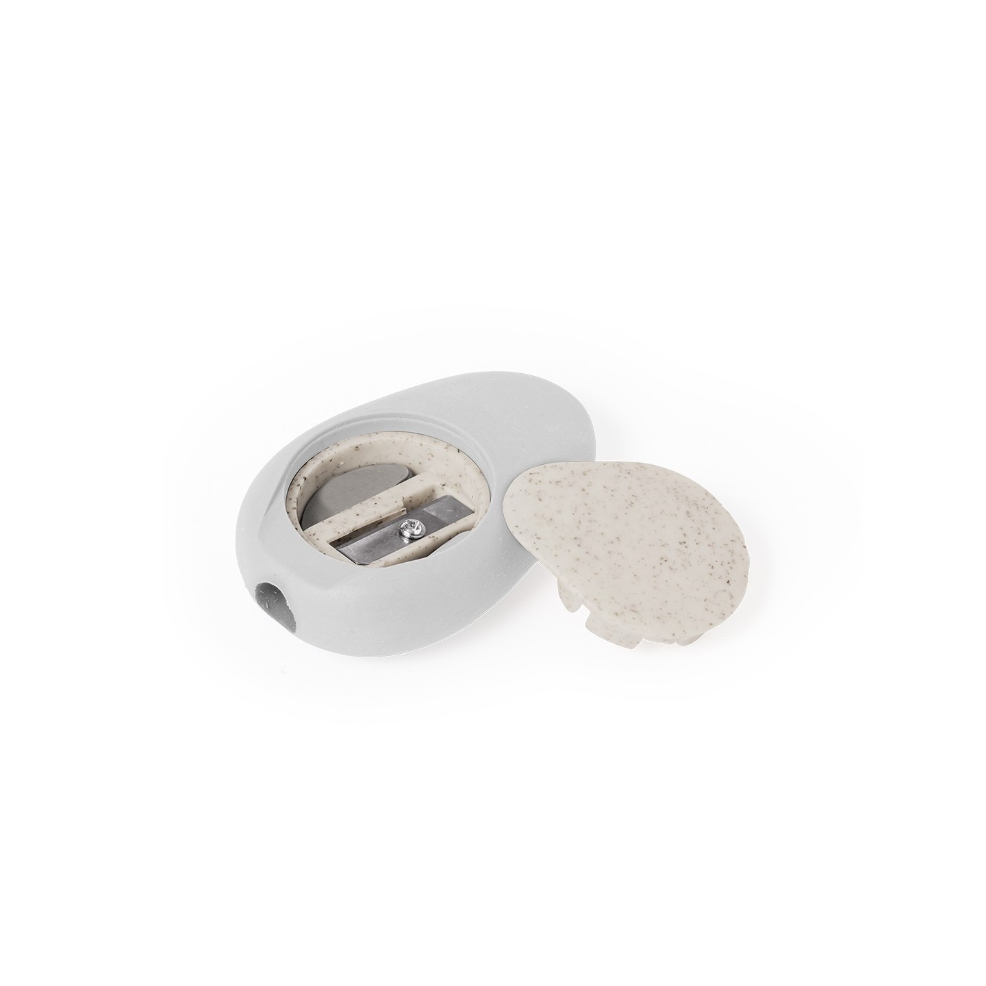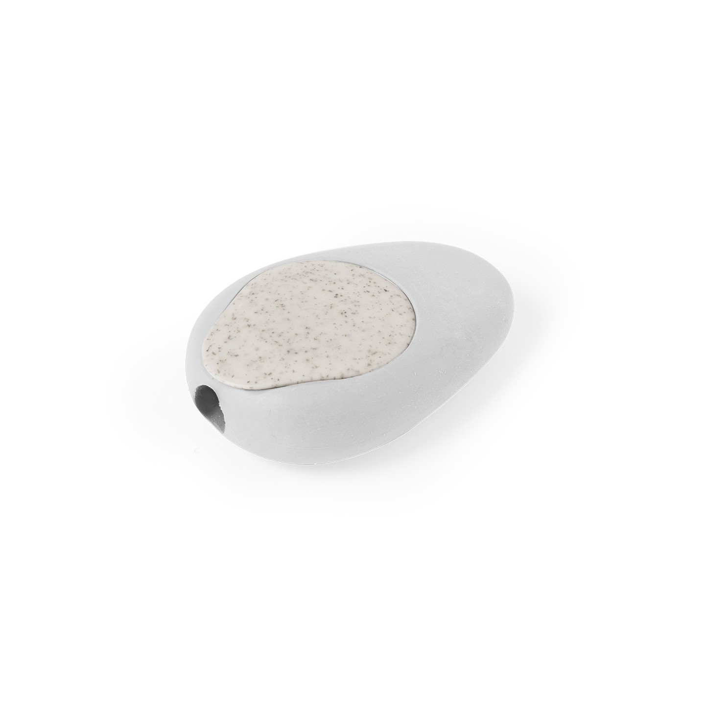 El sacapuntas de bolsillo tiene una inspiración natural, con su forma que recuerda a una piedra pulida, y cuenta con una práctica tapadera fabricada en fibra de trigo, lo que lo hace cómodo de usar y guardar en cualquier lugar.