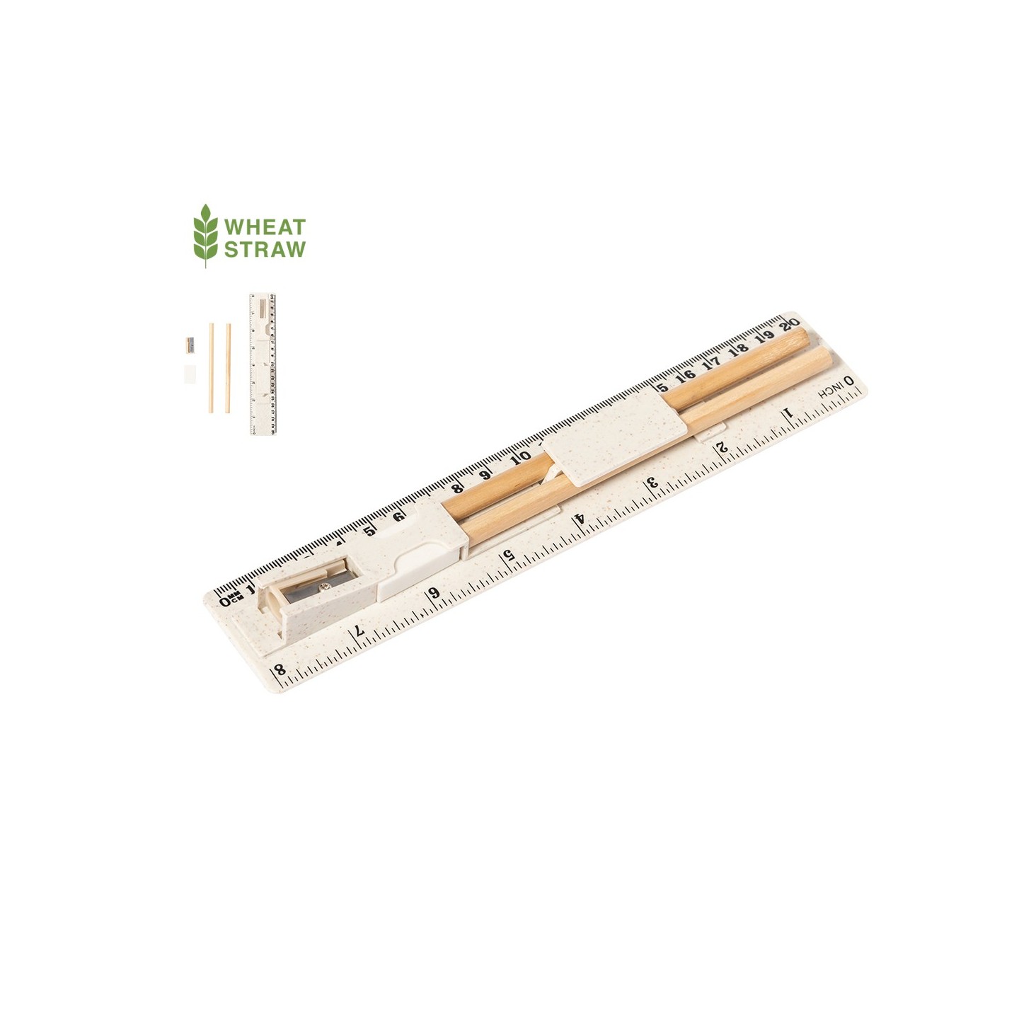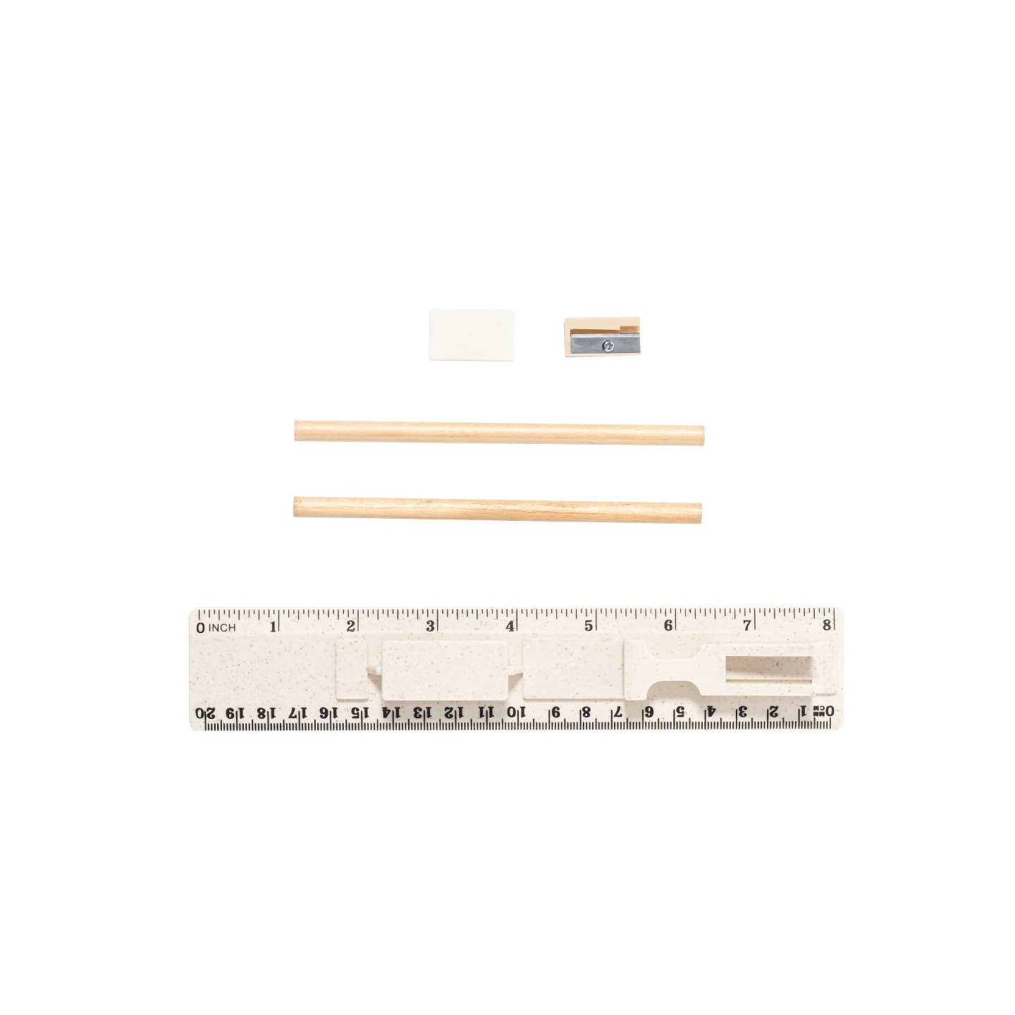 El Set Frensi consta de 5 piezas eco-friendly de caña de trigo. Incluye lápices de madera, goma y sacapuntas. Estuche organizador y presentación en bolsa blanca
