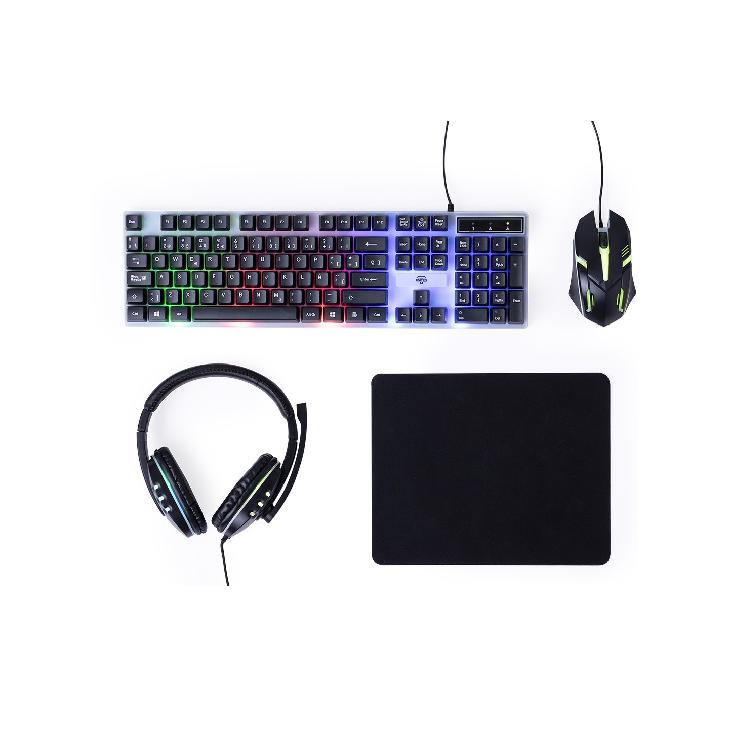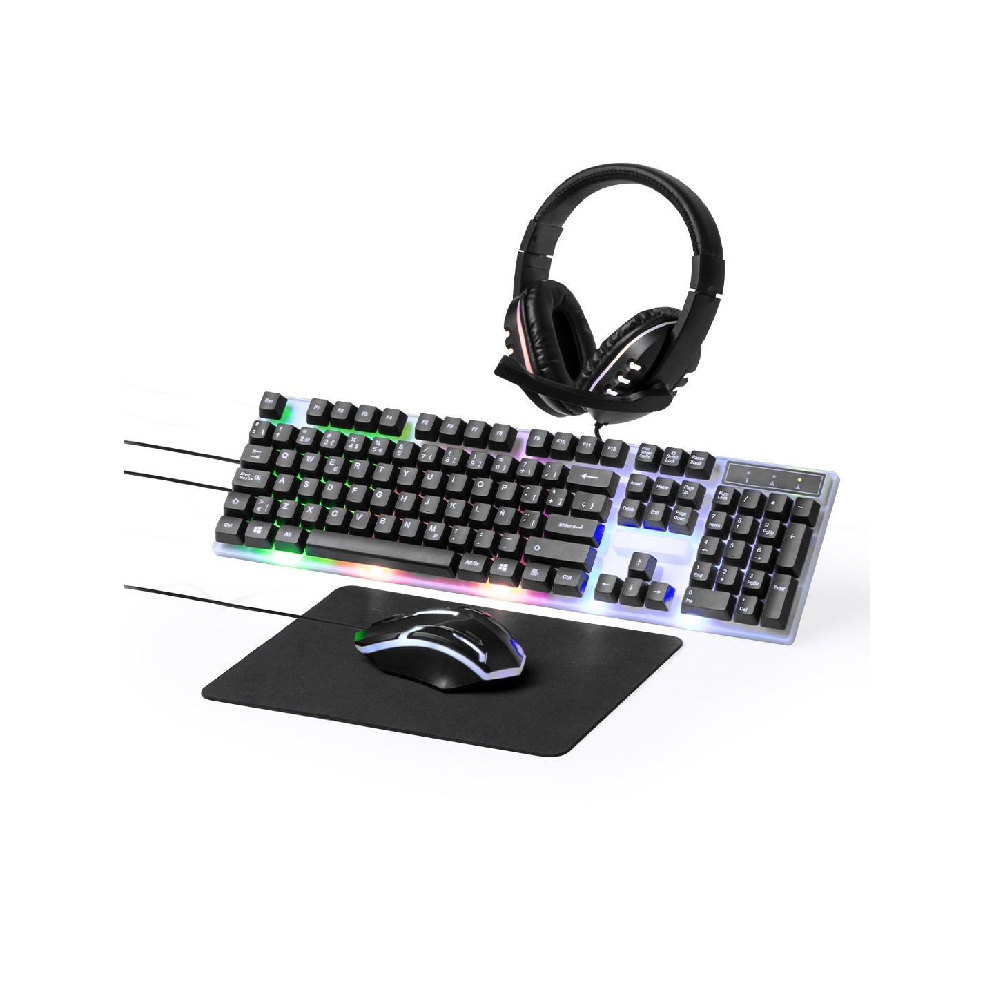 Además, la alfombrilla en suave poliéster, con base de silicona antideslizante, proporciona la superficie perfecta para un movimiento preciso del ratón, garantizando la máxima precisión en cada movimiento. Los auriculares de diadema, con sonido envolvente y retroiluminados con luz LED multicolor, ofrecen una experiencia de audio inmersiva como ninguna otra. Con micrófono integrado y conexión jack de 3,5mm, la comunicación con tus compañeros de equipo nunca ha sido tan clara y eficiente.