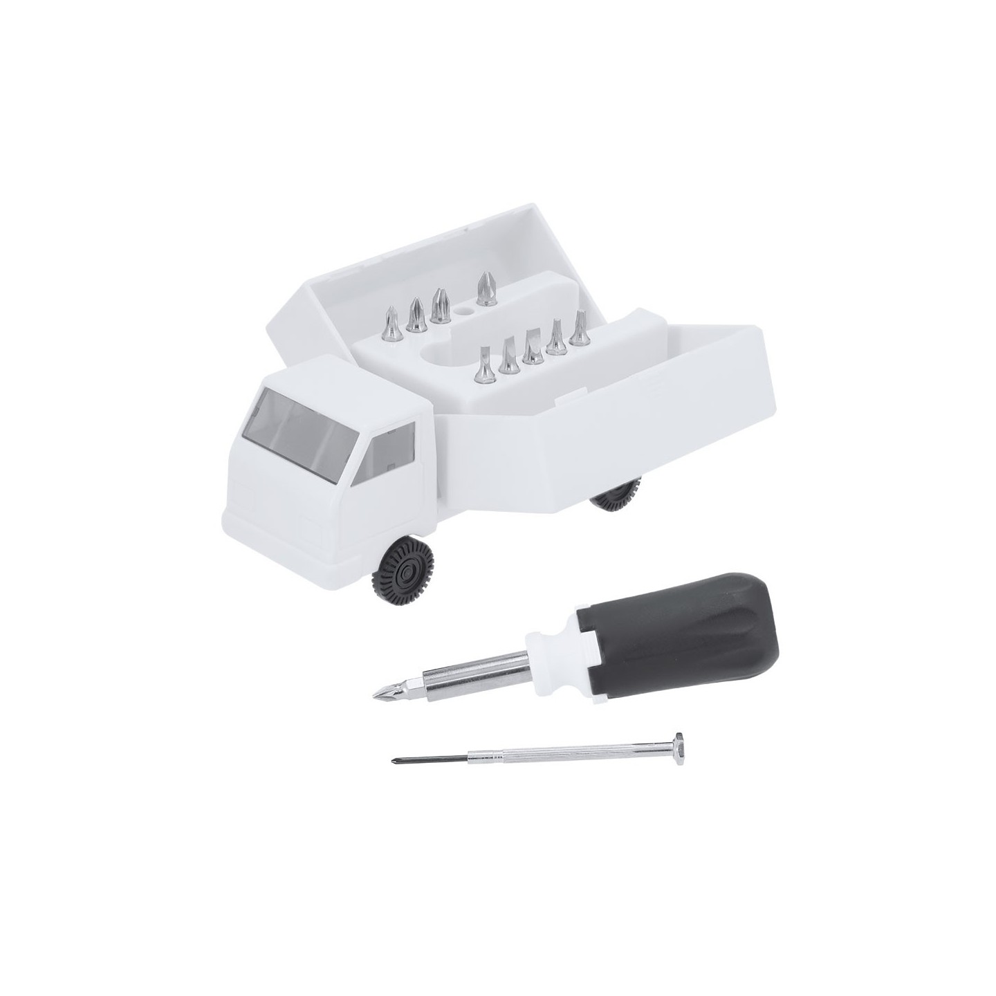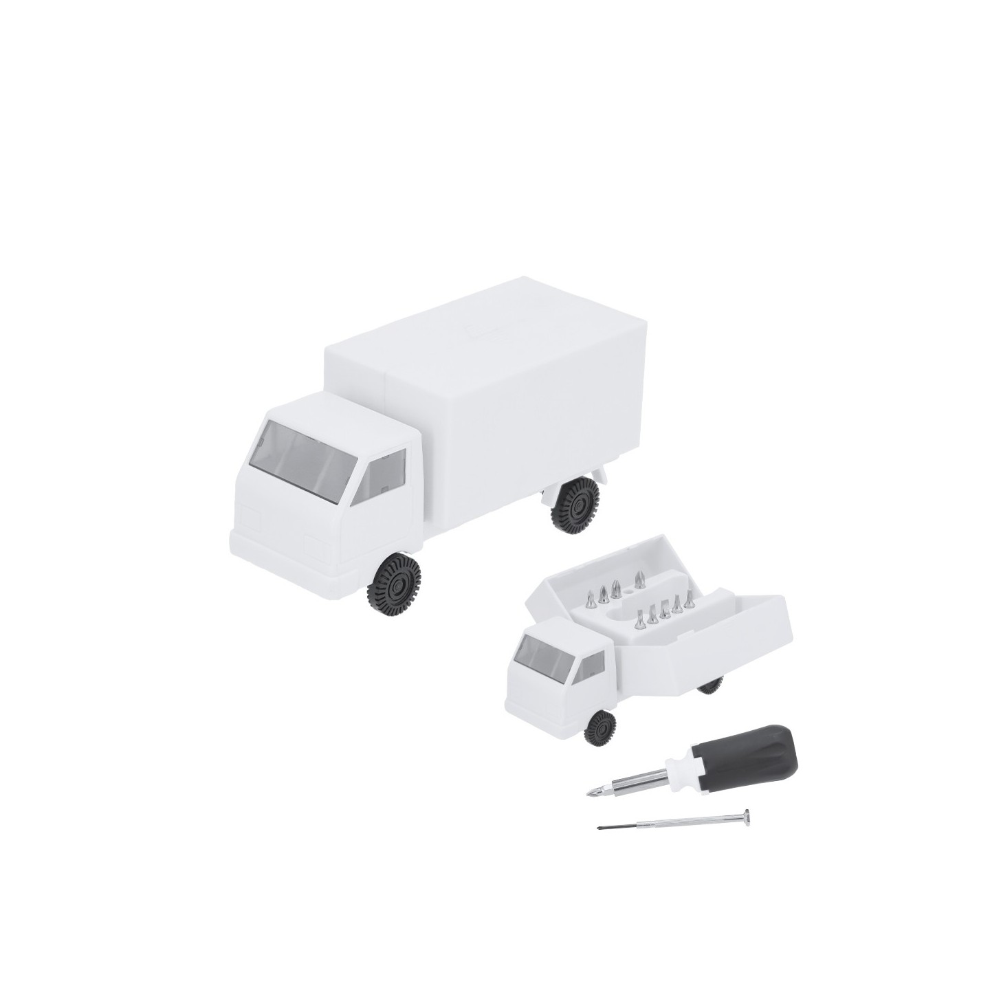 Set de herramientas FIBREX en estuche con forma de camión, incluye 15 herramientas y es personalizable con tu logotipo. Ideal para camioneros y agencias de transporte.