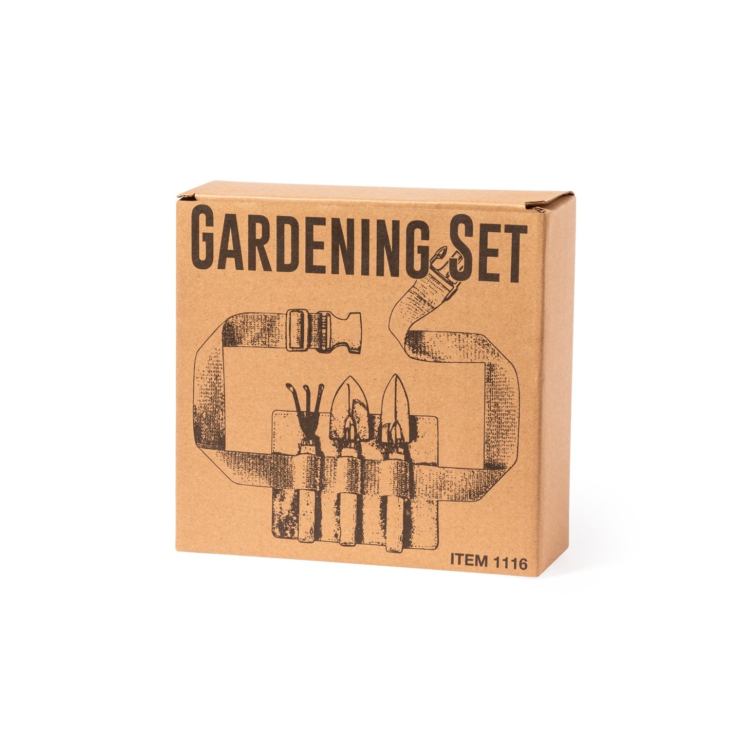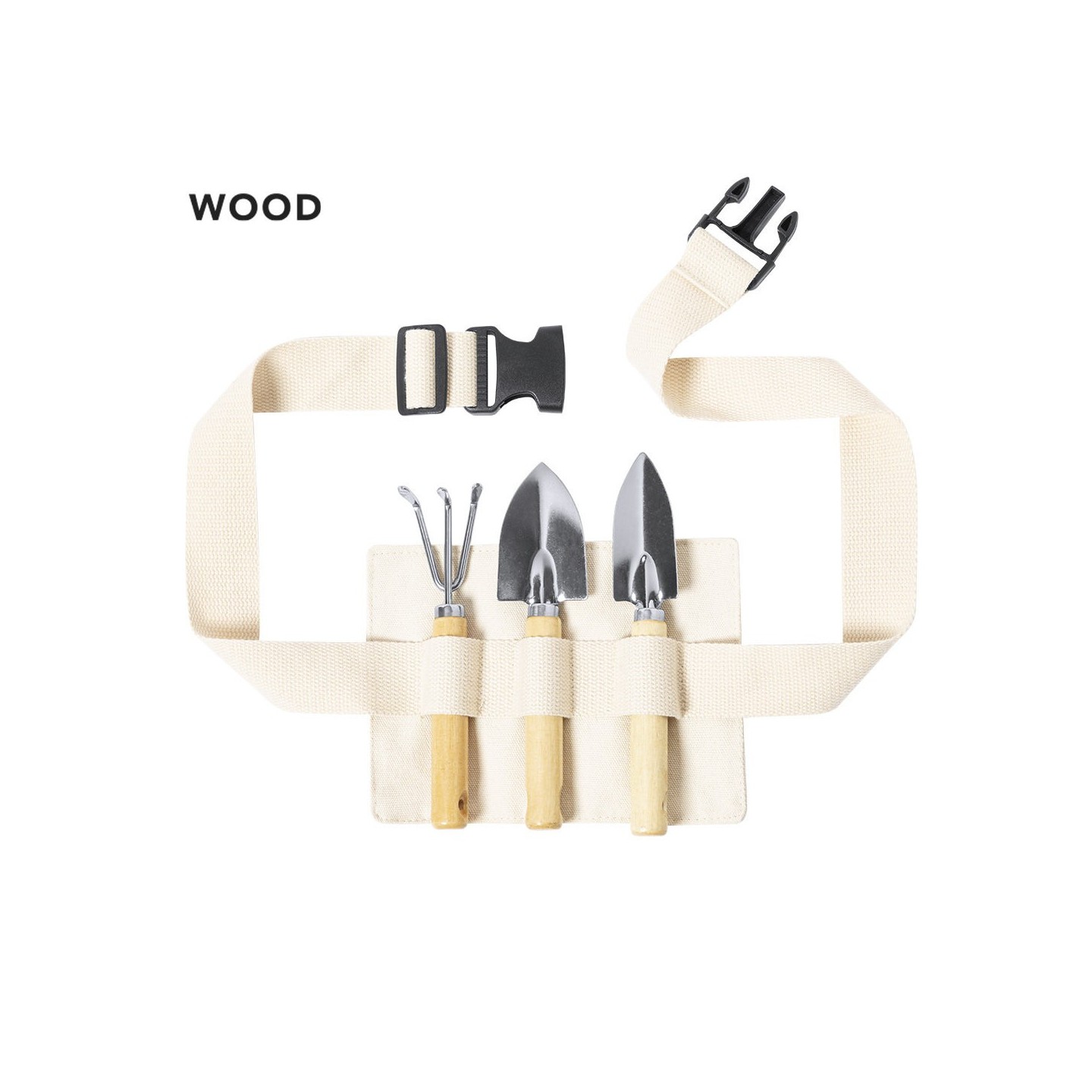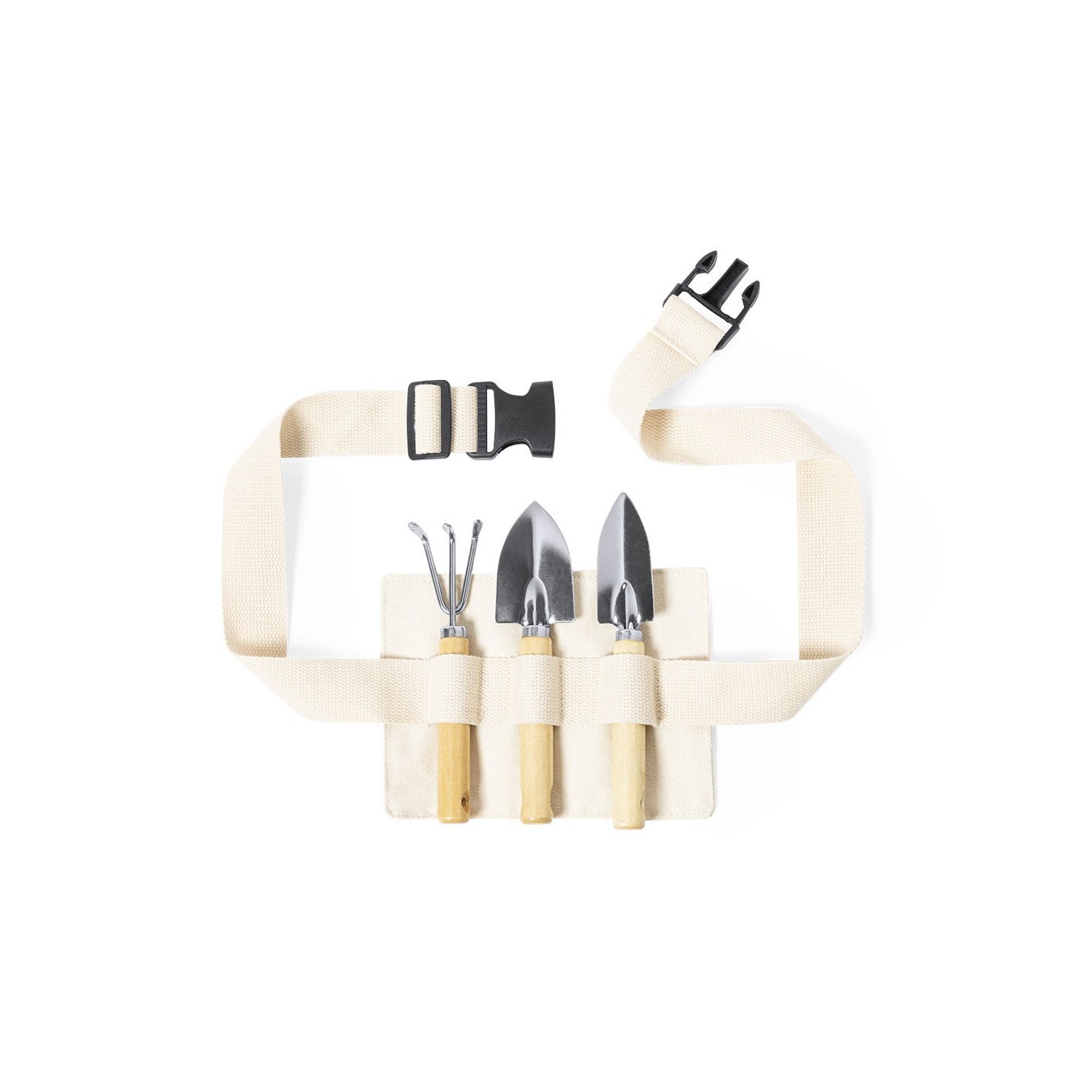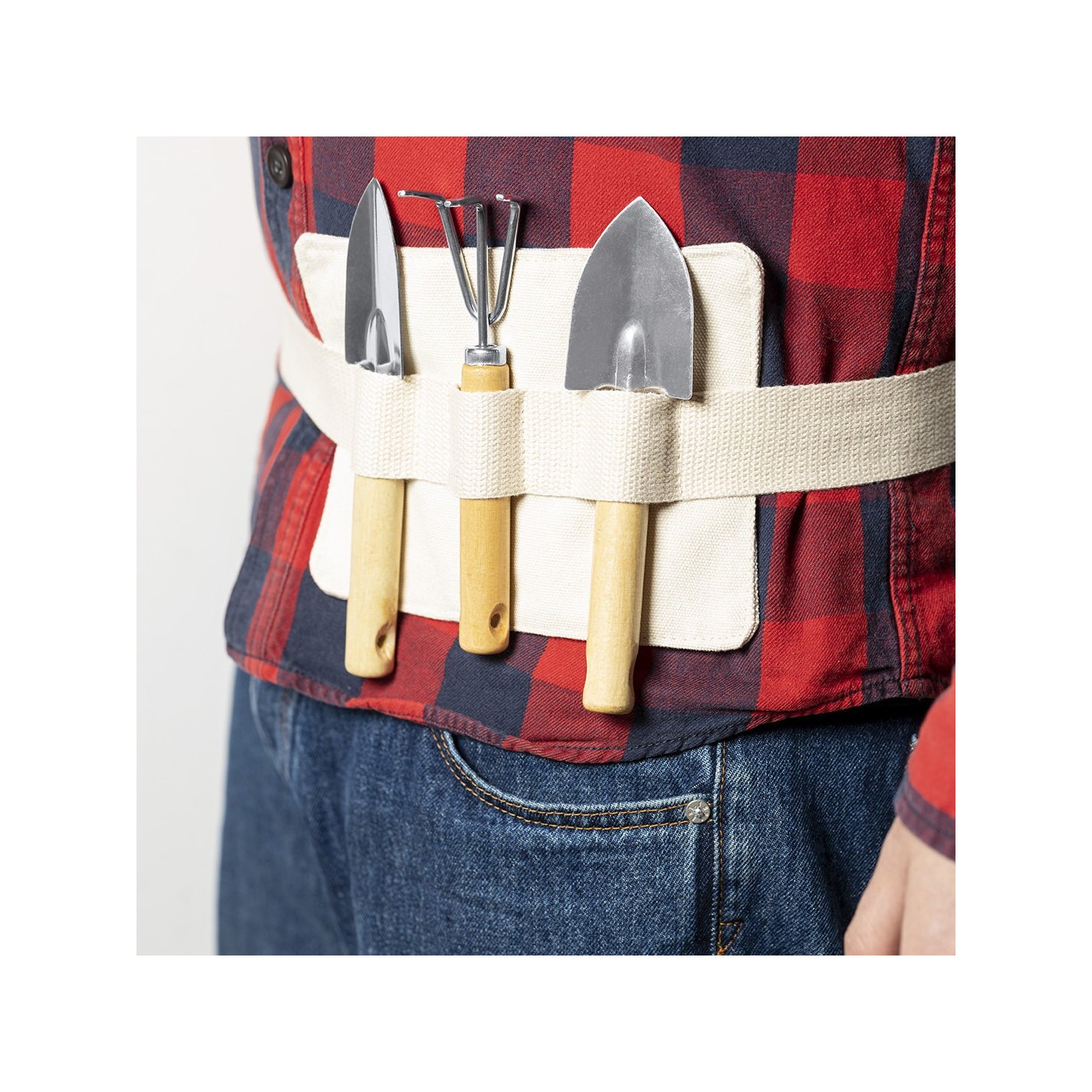 El Set de jardinería Maurix consta de 3 accesorios de metal y madera en riñonera de algodón. Ideal para labores de jardín. Presentado en caja eco.