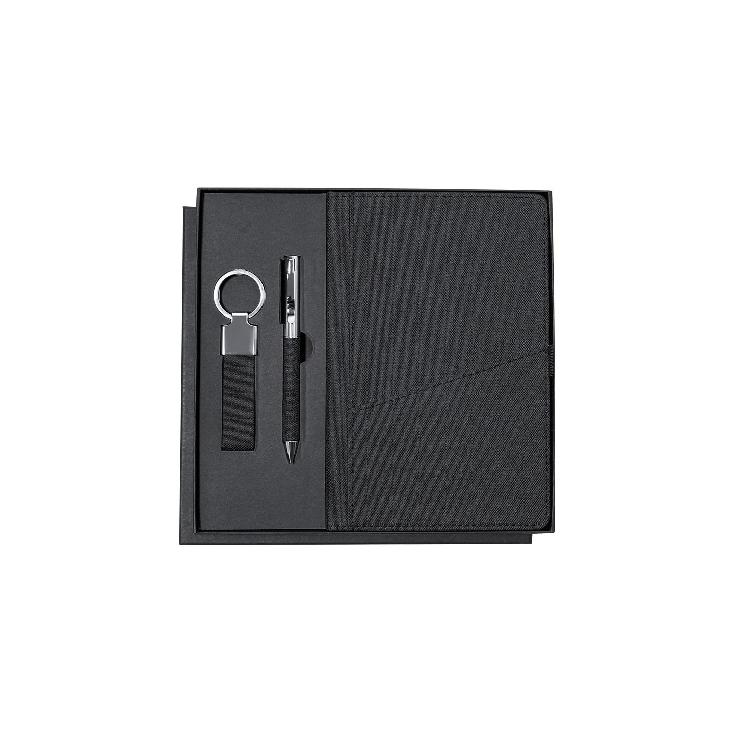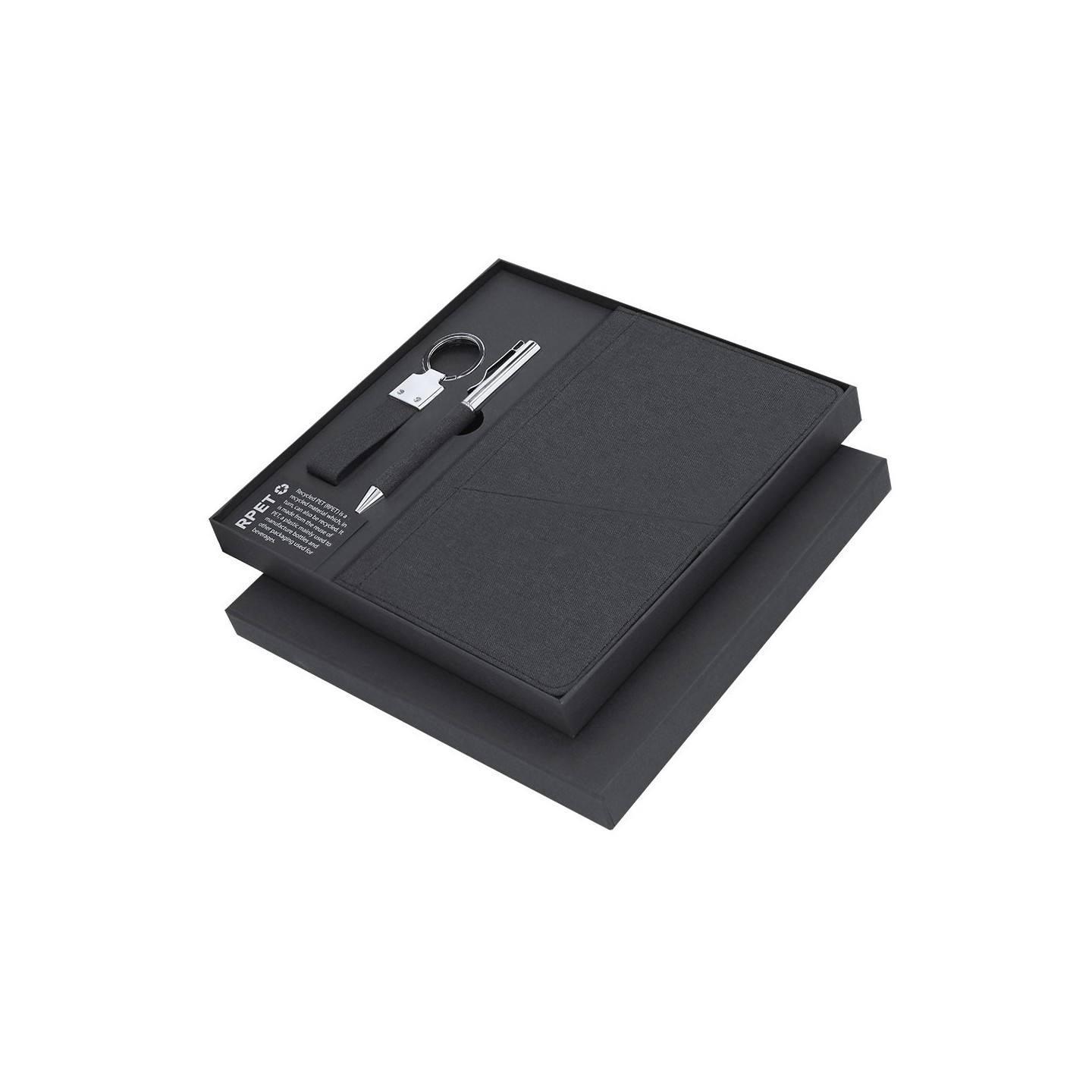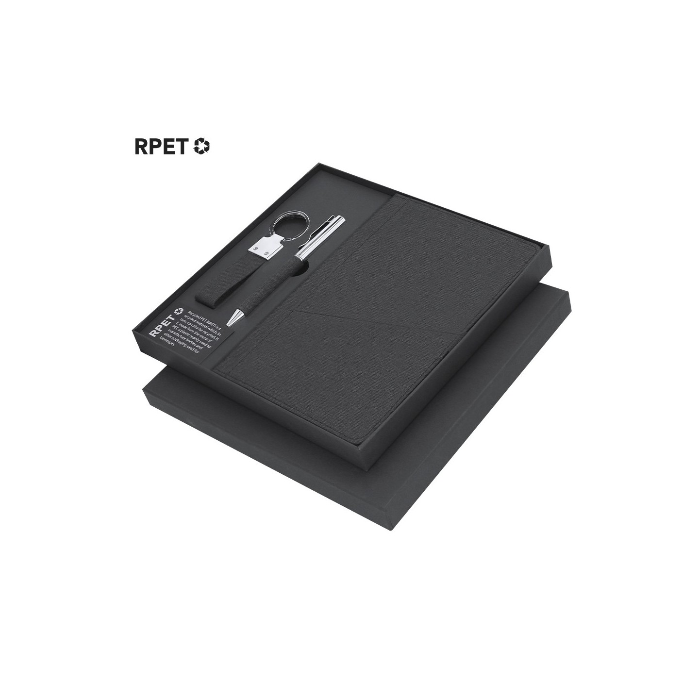 Set MERYL premium con bloc de notas, bolígrafo y llavero en RPET. Personalizable con logotipo, elegante y sostenible, ideal para regalos corporativos.