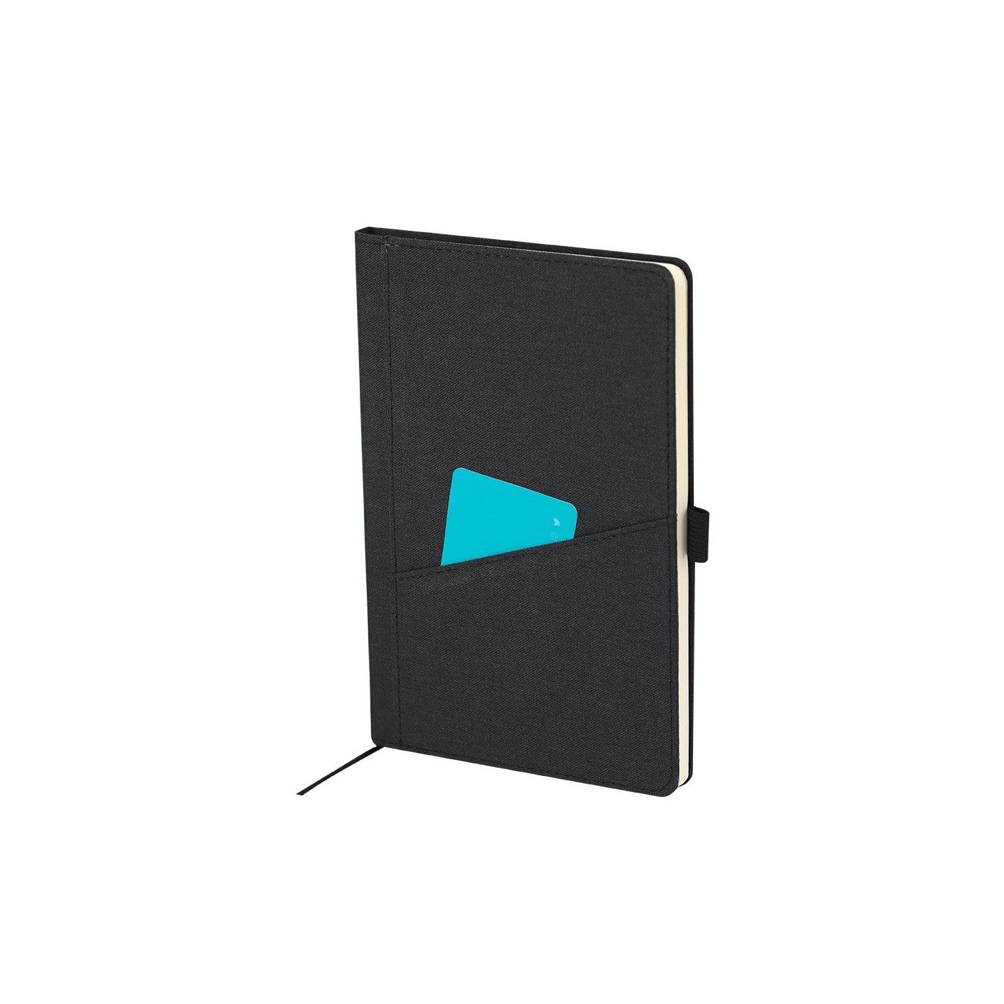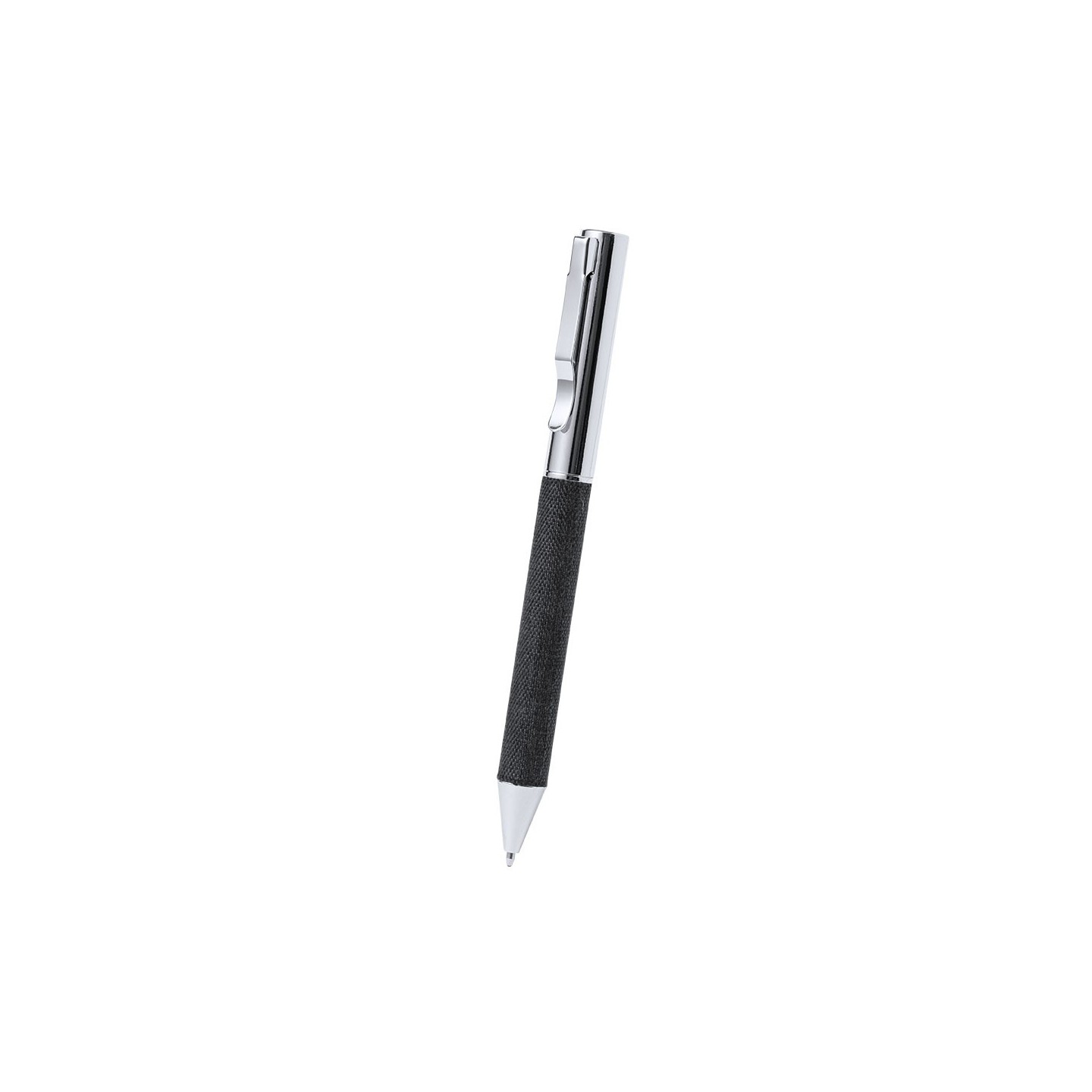 El set también incluye un bolígrafo en RPET de acabado negro mate, con mecanismo giratorio y tinta azul. Su clip y puntera en metal pulido añaden un toque de sofisticación y funcionalidad. Este bolígrafo es ideal para aquellos que buscan un accesorio elegante para el día a día, y su diseño minimalista lo convierte en un detalle perfecto para cualquier ocasión.