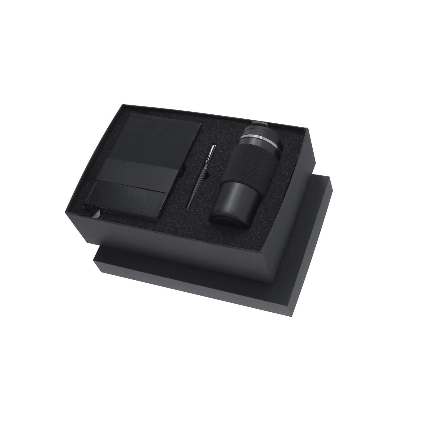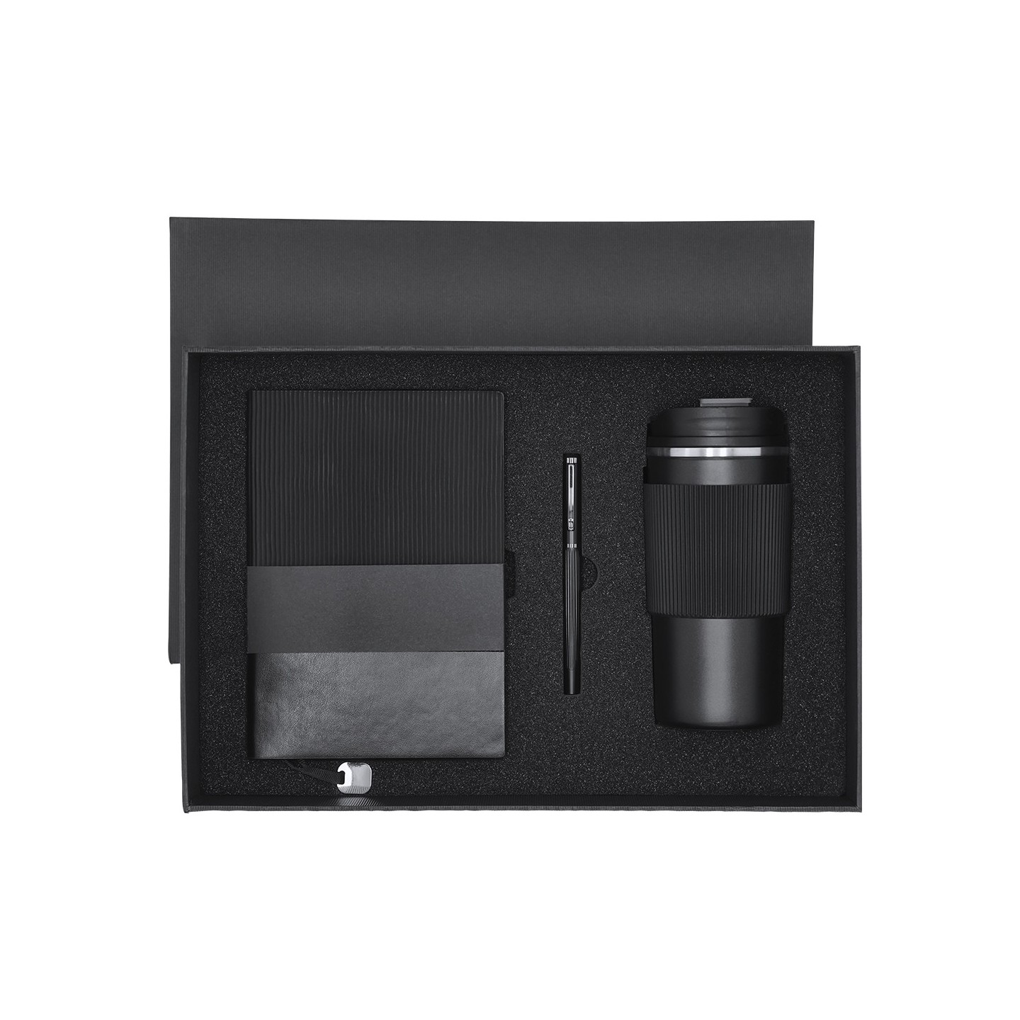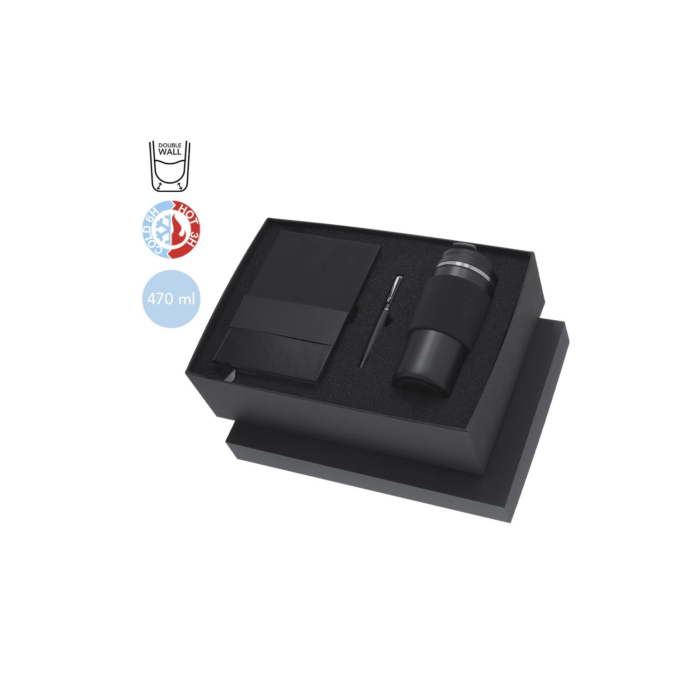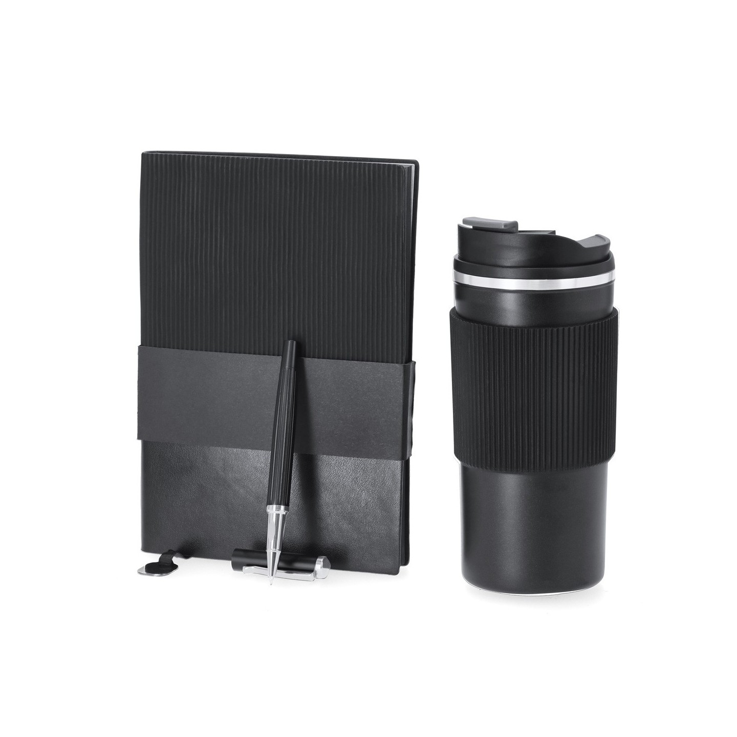 Set Mirka premium que incluye un vaso térmico de acero inoxidable, bloc de notas en PU y roller negro mate. Personalizable con tu logotipo. Ideal para empresas
