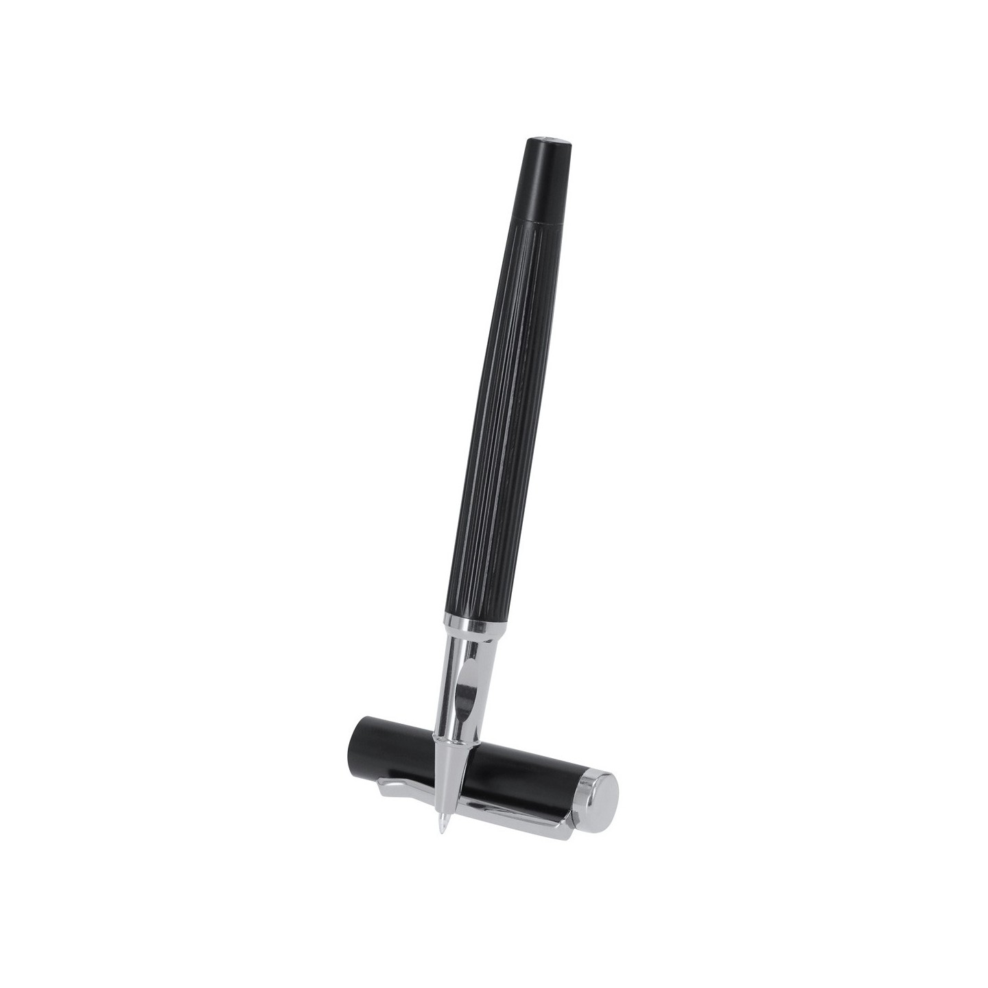 El roller que acompaña al set presenta un acabado negro mate con detalles metálicos en color plata, destacándose por su cuerpo biselado y su cierre de capucha. El clip permite llevarlo siempre contigo, y la tinta azul garantiza un trazo fluido. Su cómodo agarre en metal pulido proporciona una experiencia de escritura placentera.