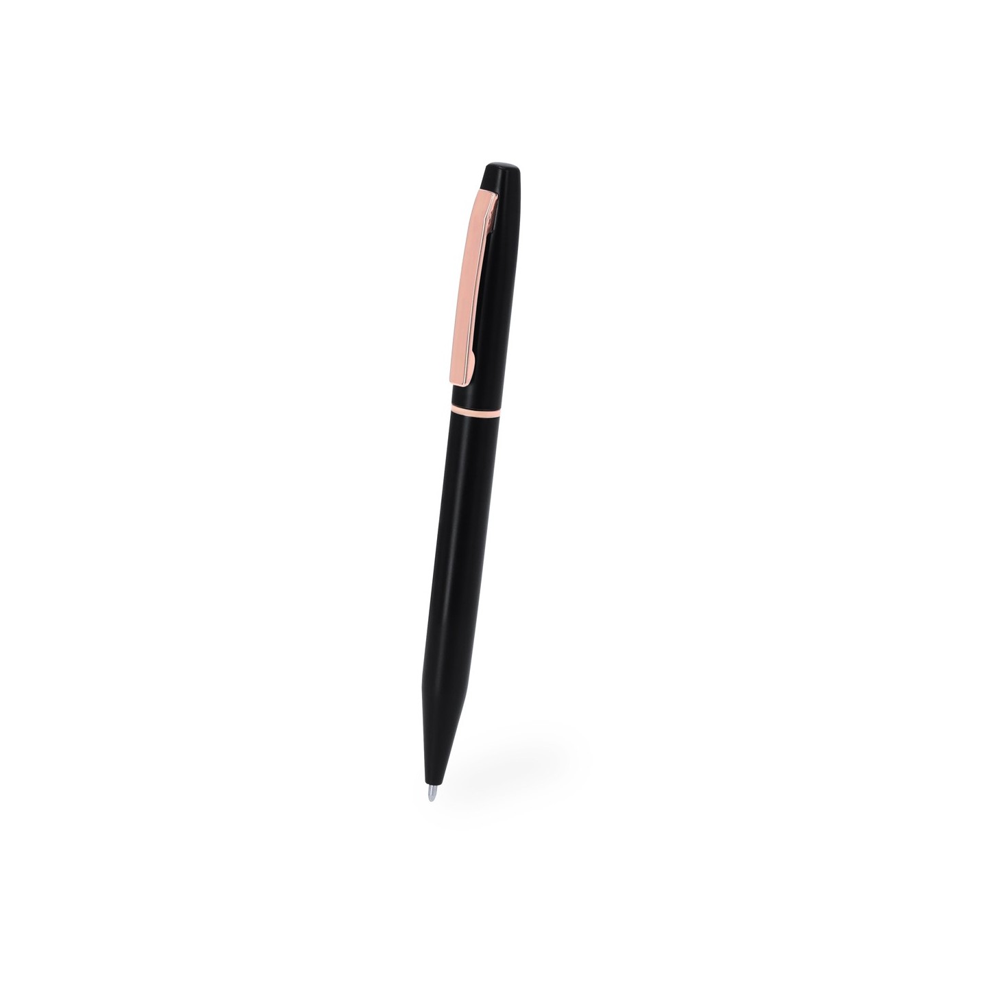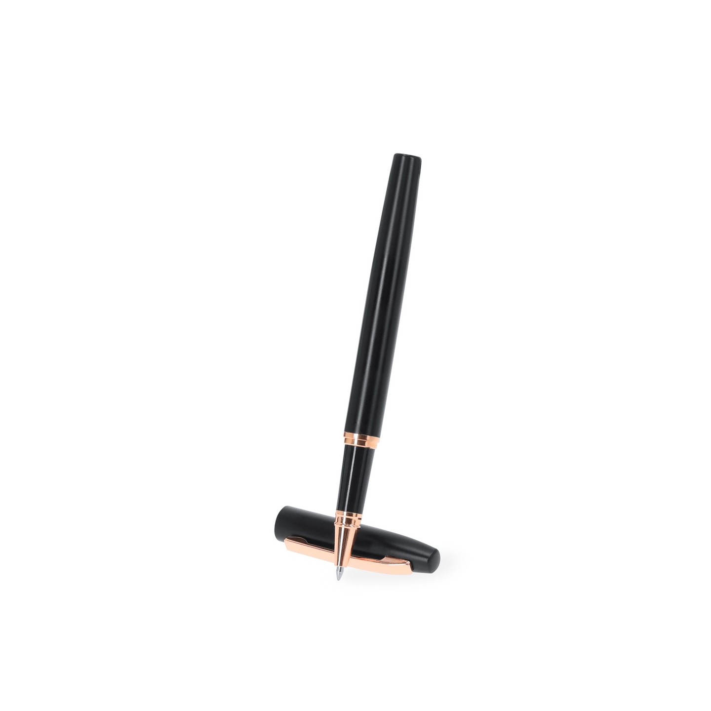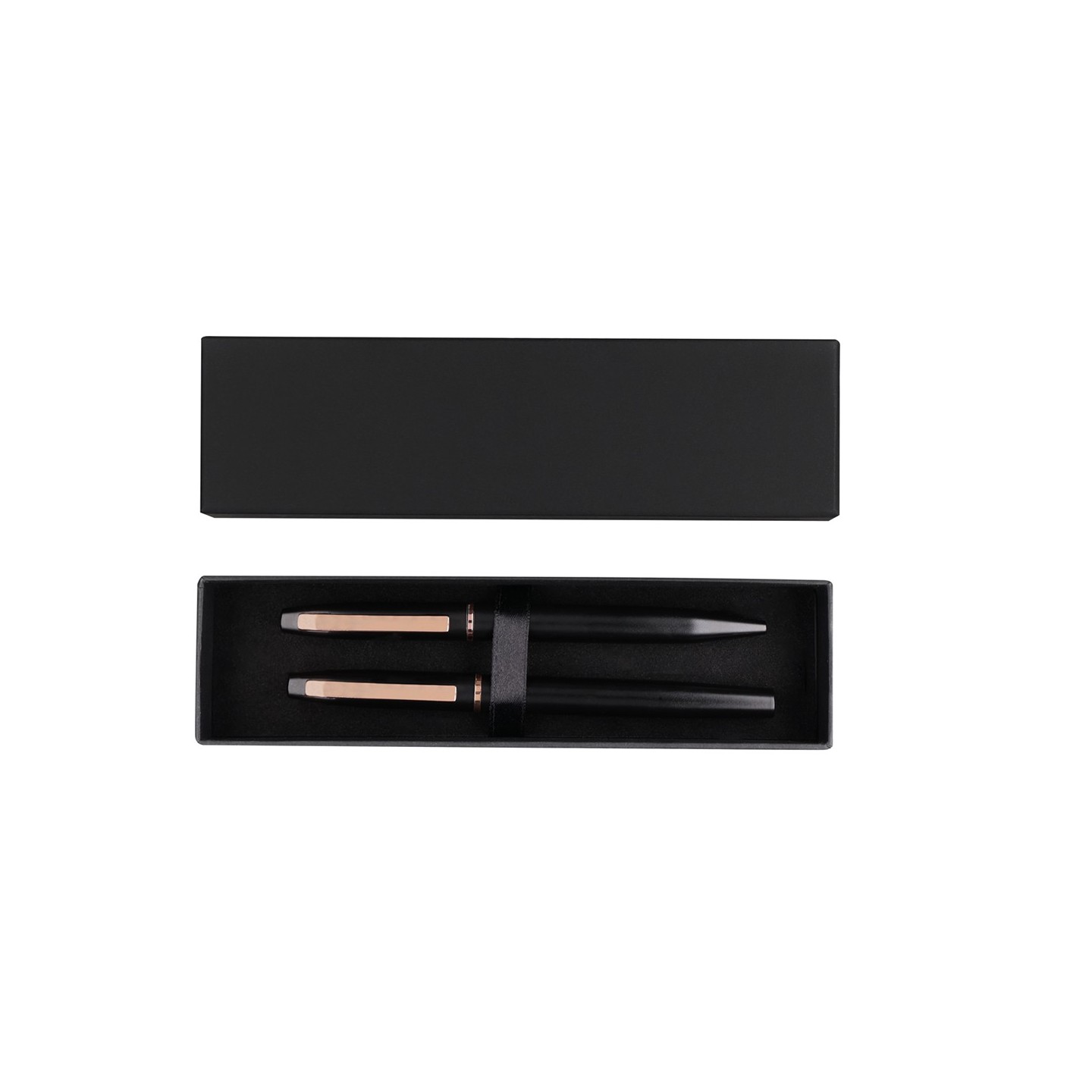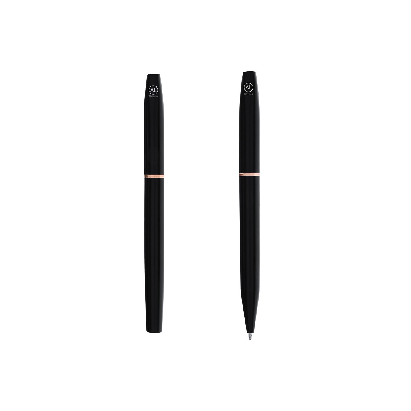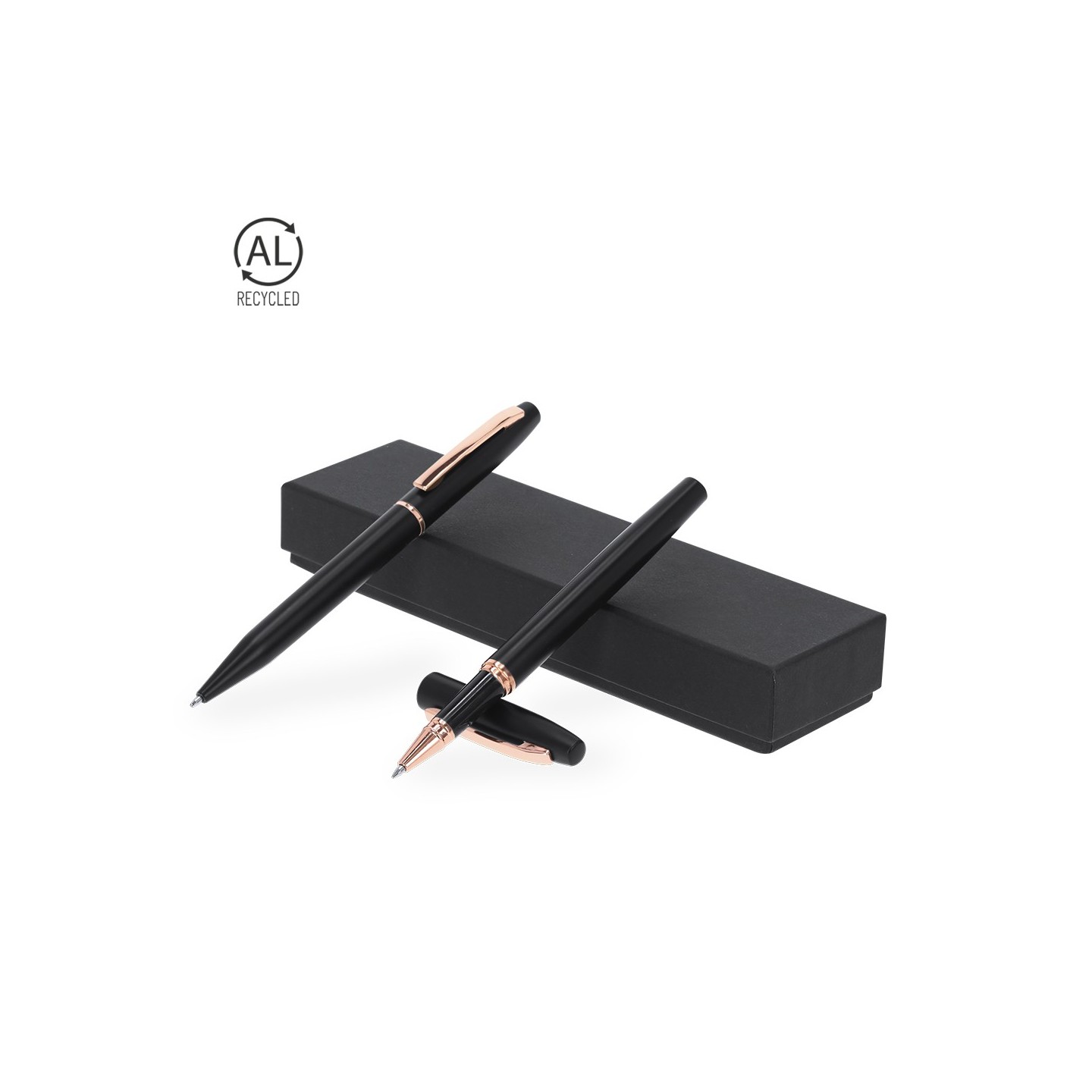 El Set Mobex incluye bolígrafo y roller en Aluminio Reciclado, con elegante diseño negro mate y detalles en oro rosa. Personalizable y presentado en estuche negro.