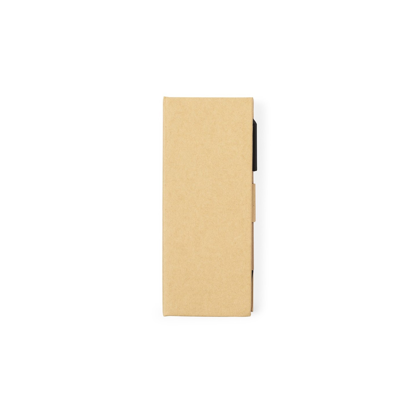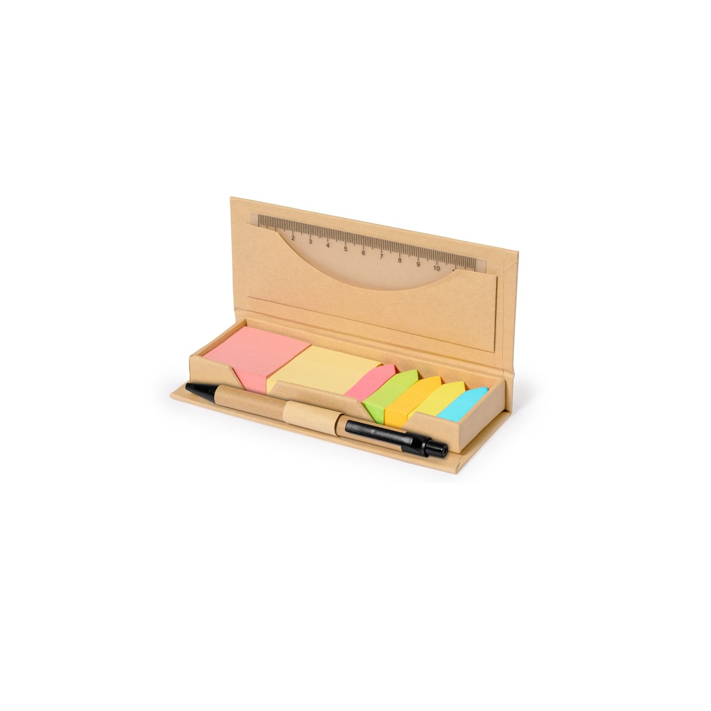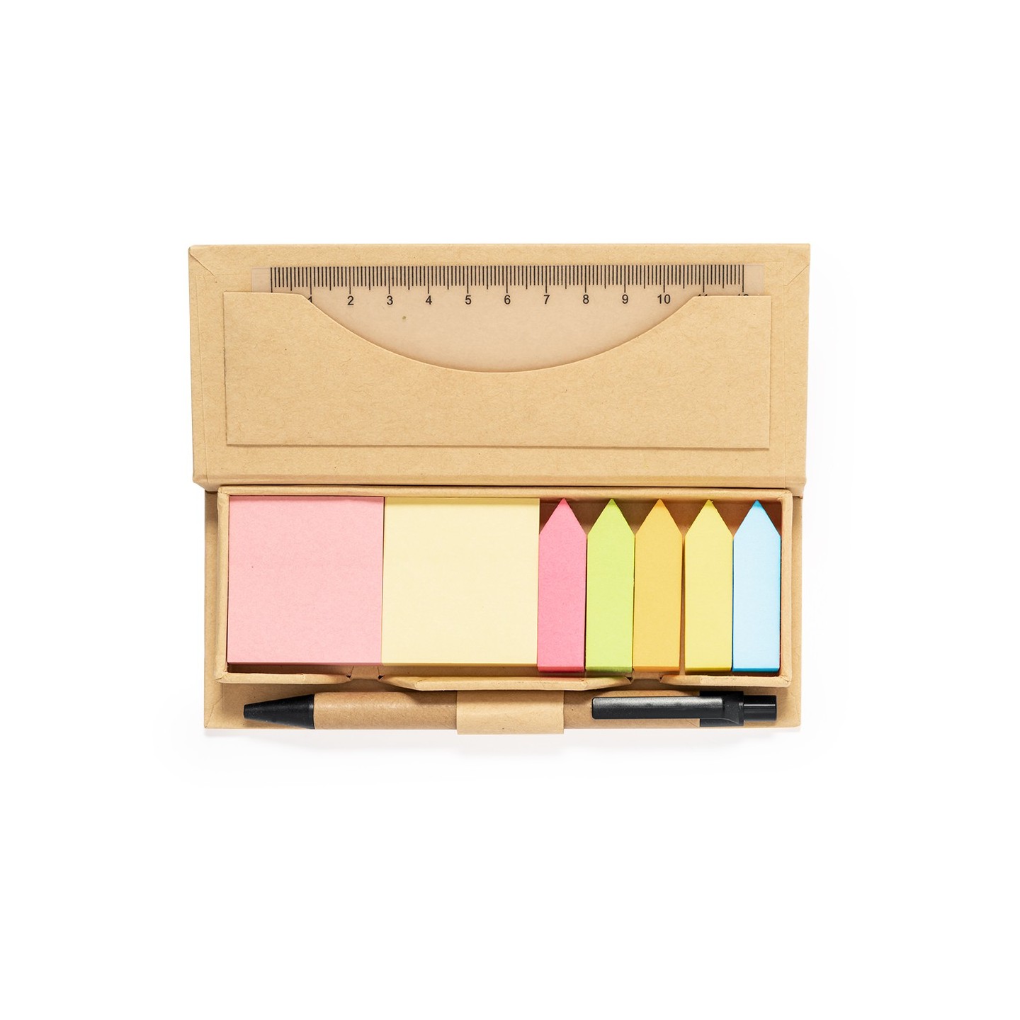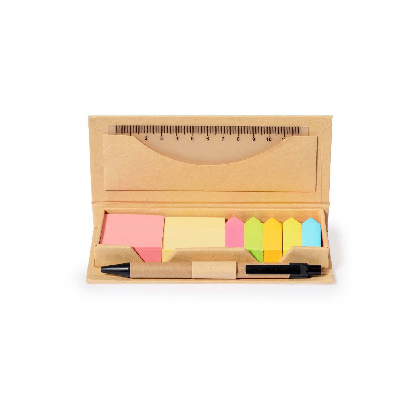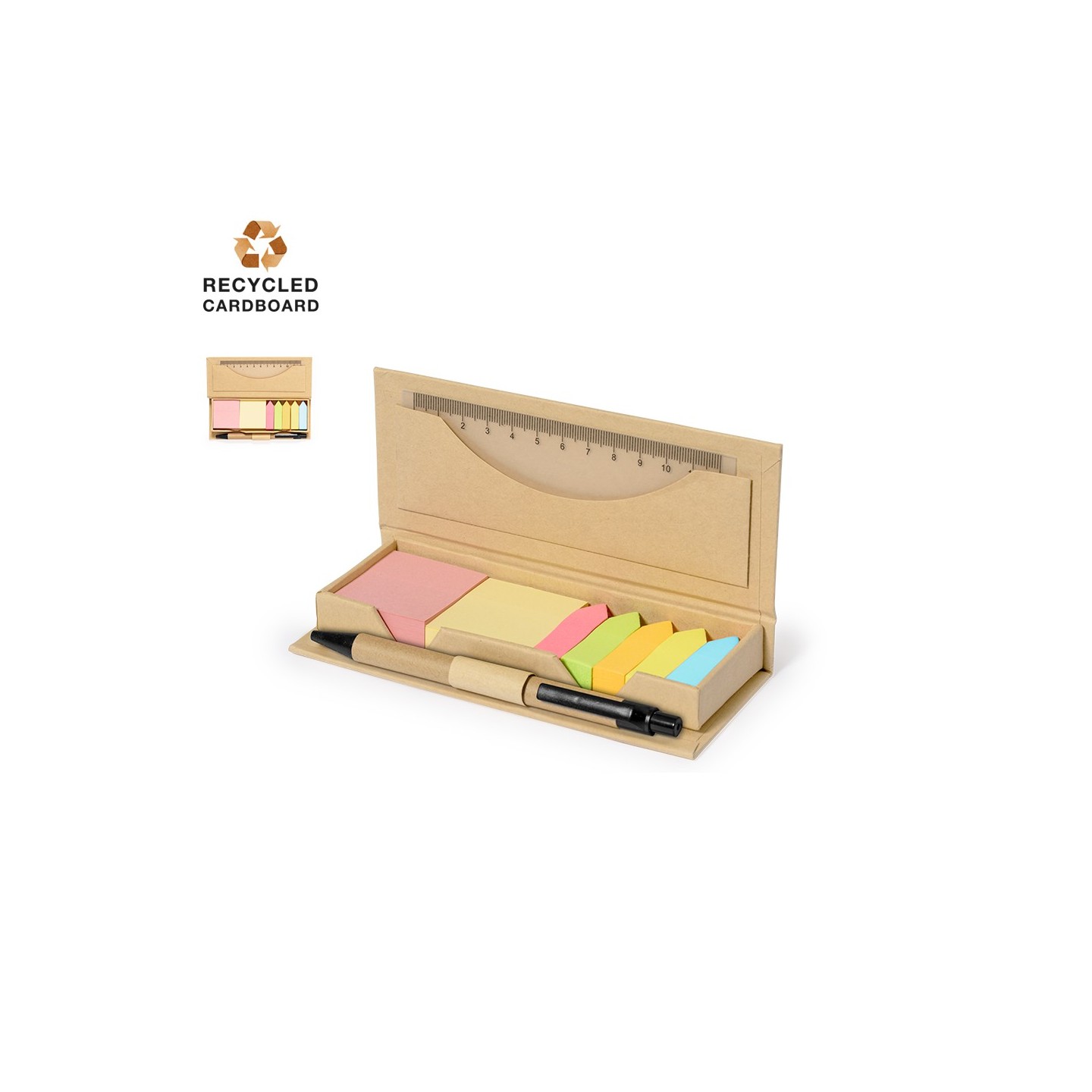 El Set Oficina Alisio es práctico y sostenible. Incluye notas adhesivas, regla y bolígrafo de cartón reciclado. Personalizable con tu logo