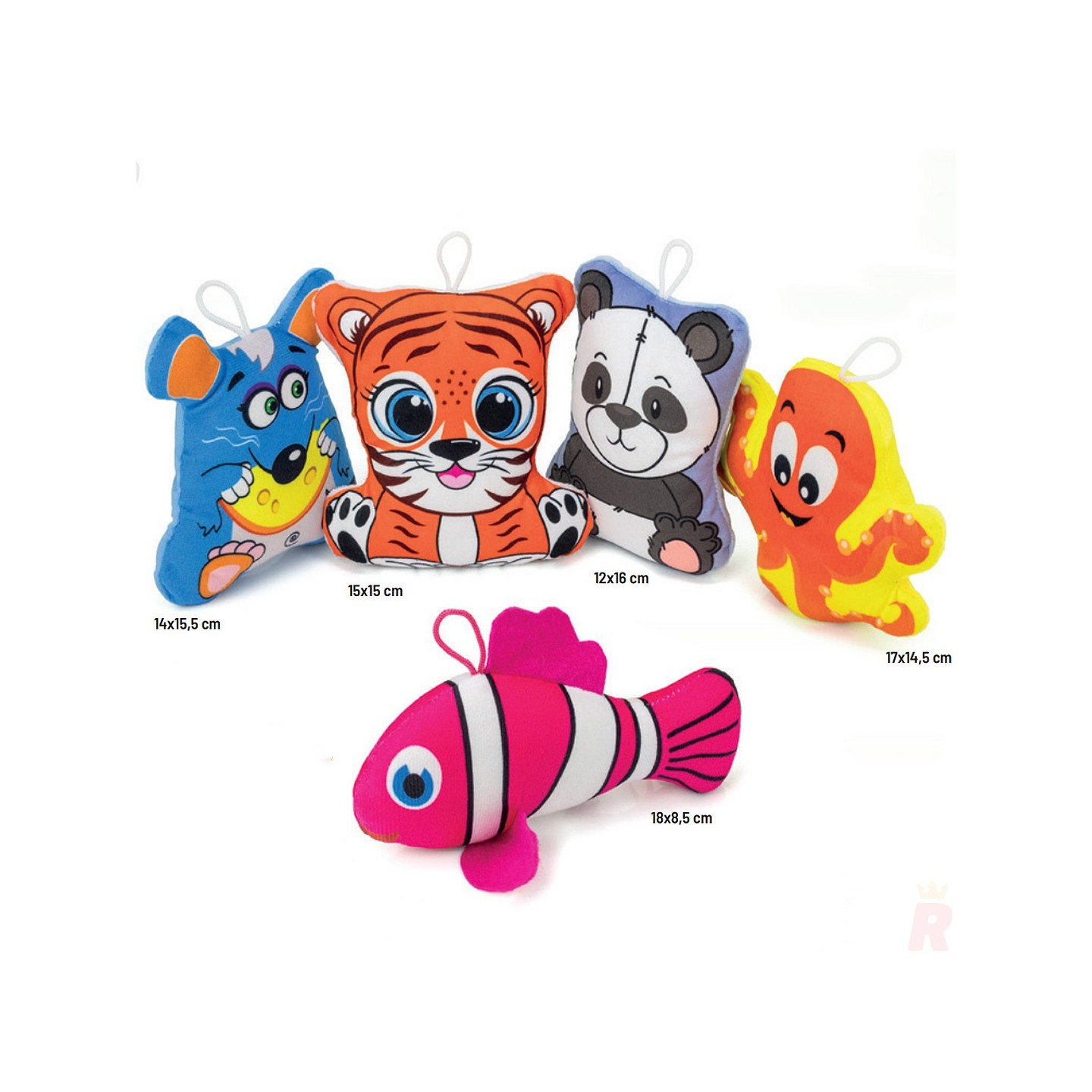 El pack incluye una divertida selección de animalitos: Ratón (16x13 cm), Tigre (15x14 cm), Oso Panda (15x12 cm), Pulpo (18x14 cm) y Pez Payaso (17x7 cm). Cada diseño ha sido cuidadosamente elaborado con colores vibrantes y detalles encantadores.